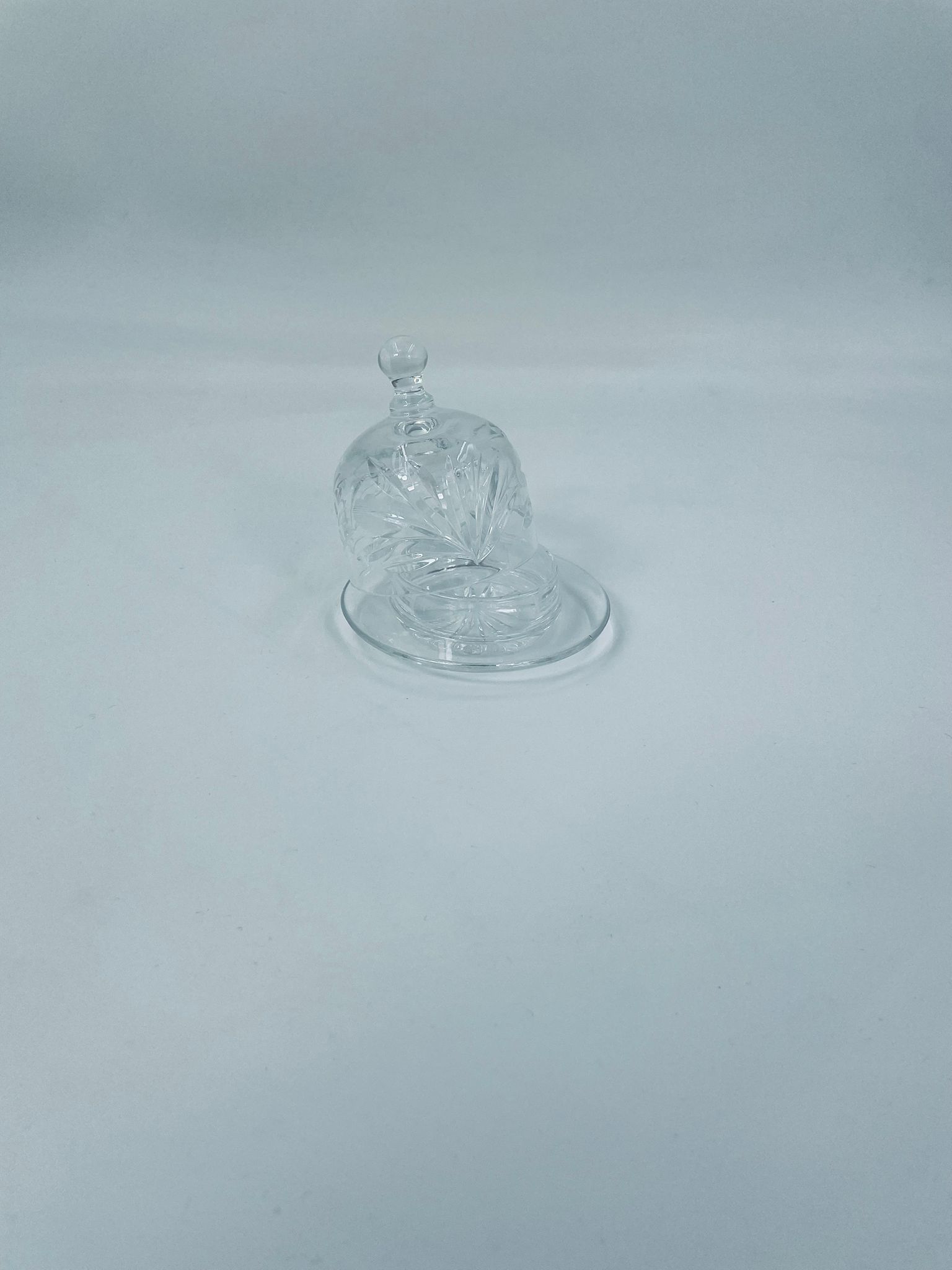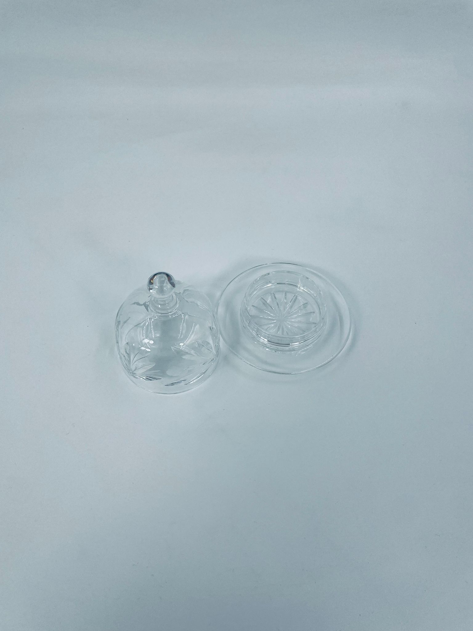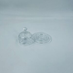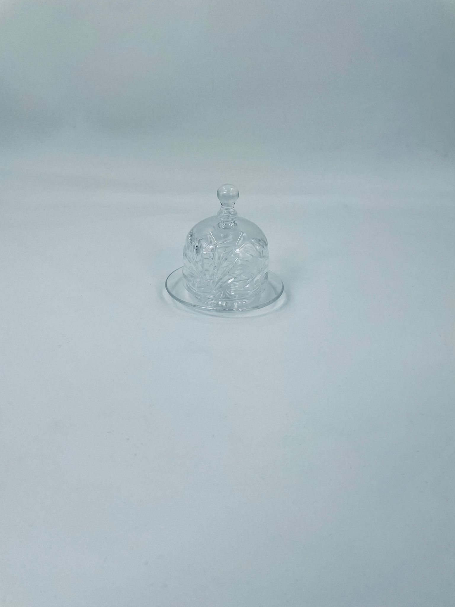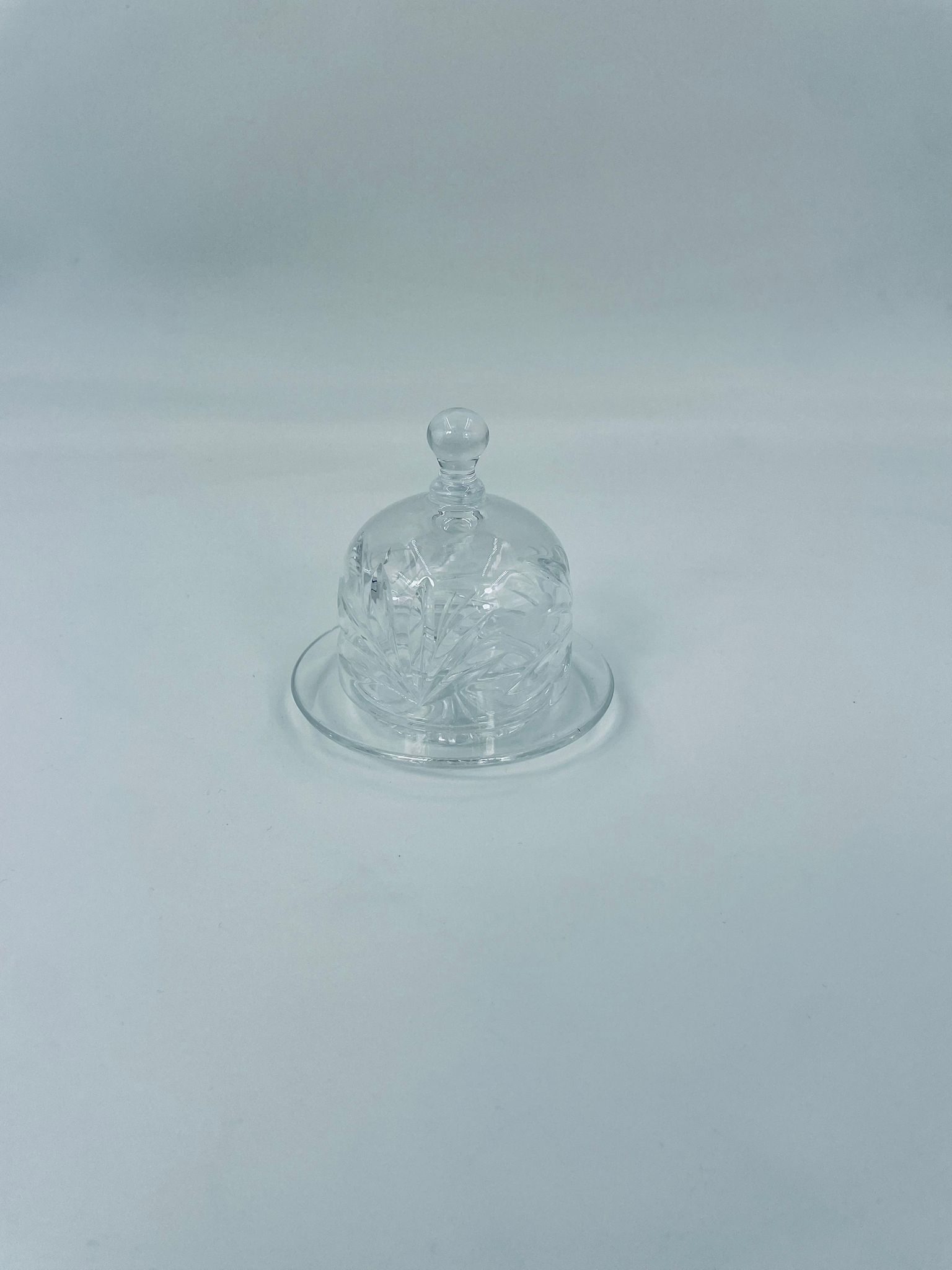 Princess House buttercreamer with lid, made of clear crystal glass, decorated with an engraved floral design and a decorative domed lid. It can be used as a Butter Box, to hold a heart and a lemon.
