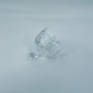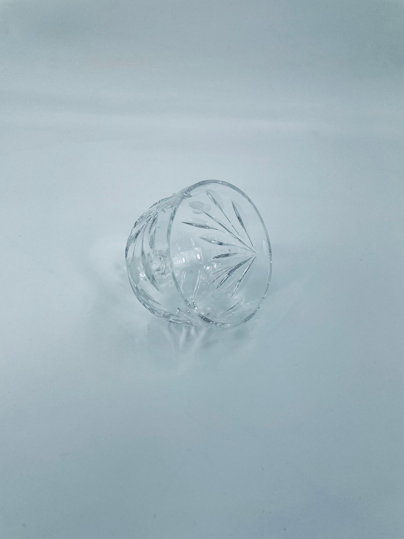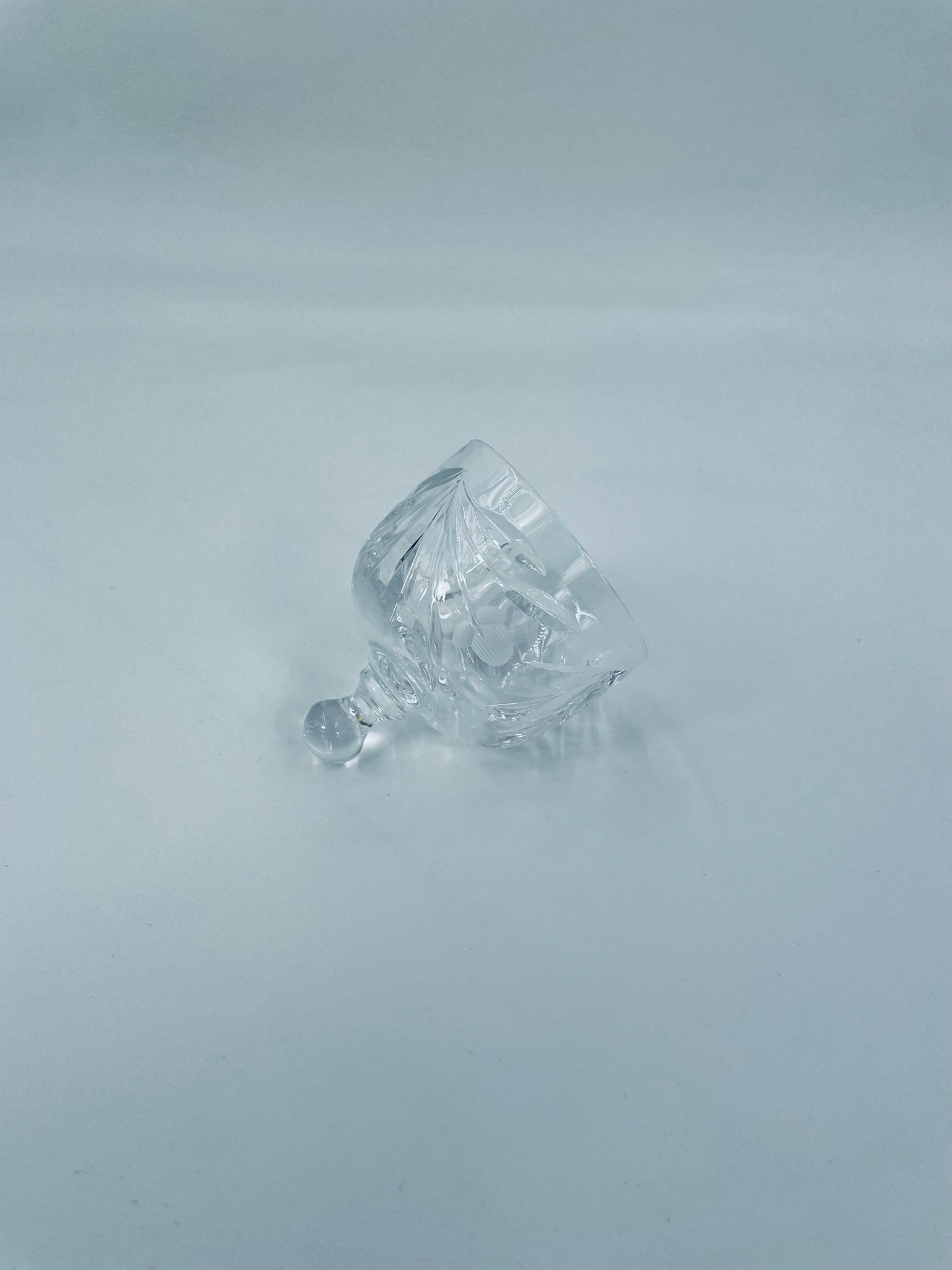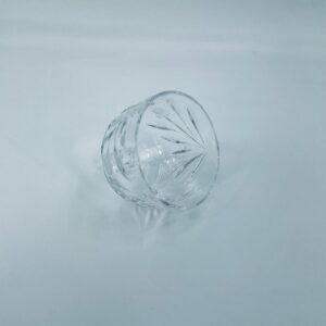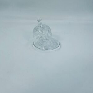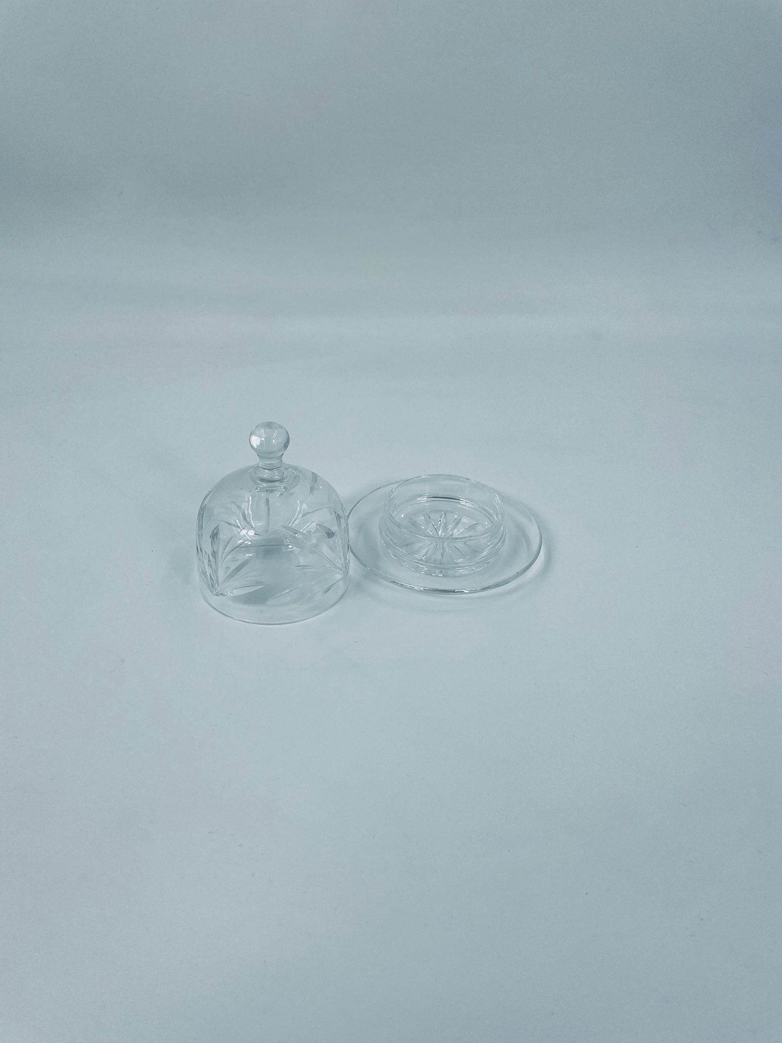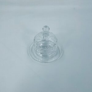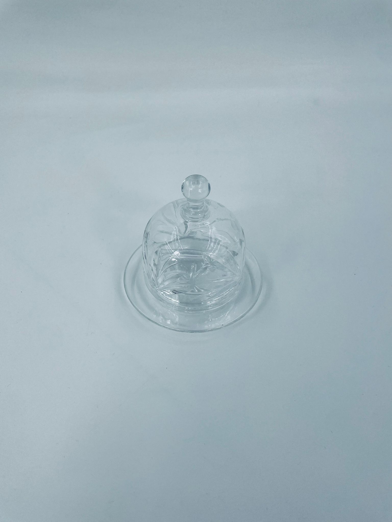 Princess House buttercreamer with lid, made of clear crystal glass, decorated with an engraved floral design and a decorative domed lid. It can be used as a Butter Box, to hold a heart and a lemon.