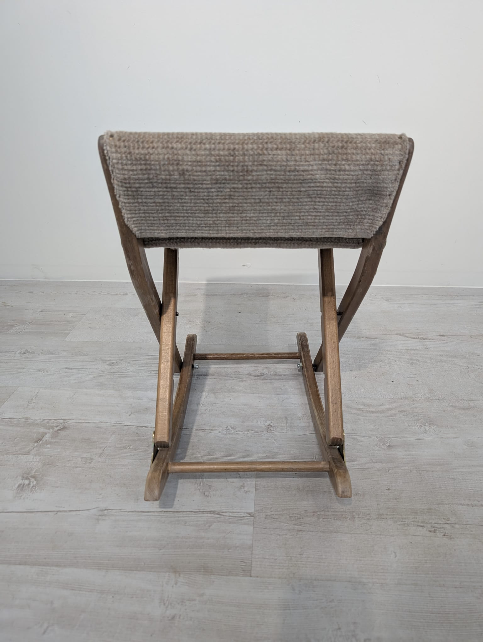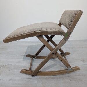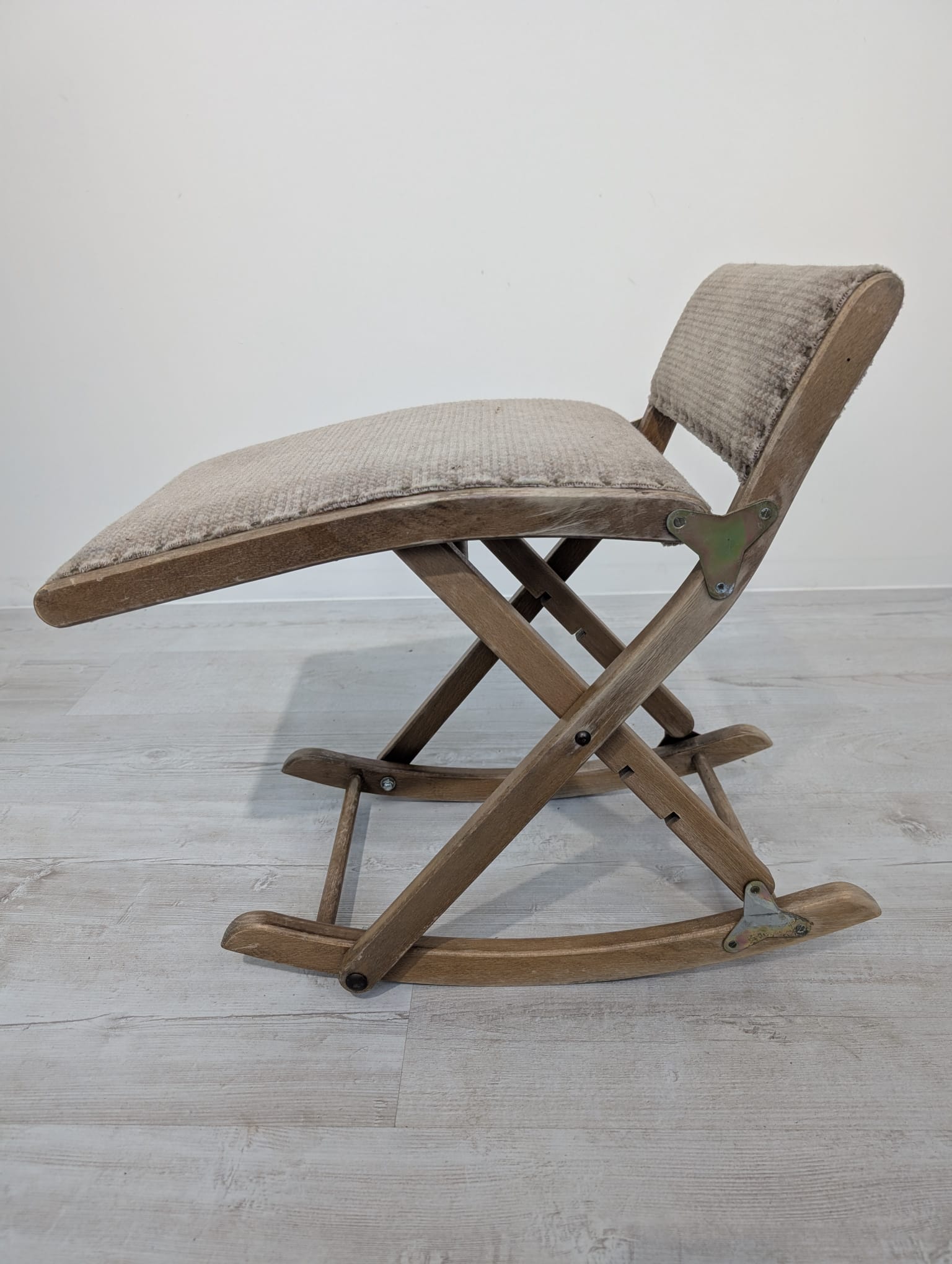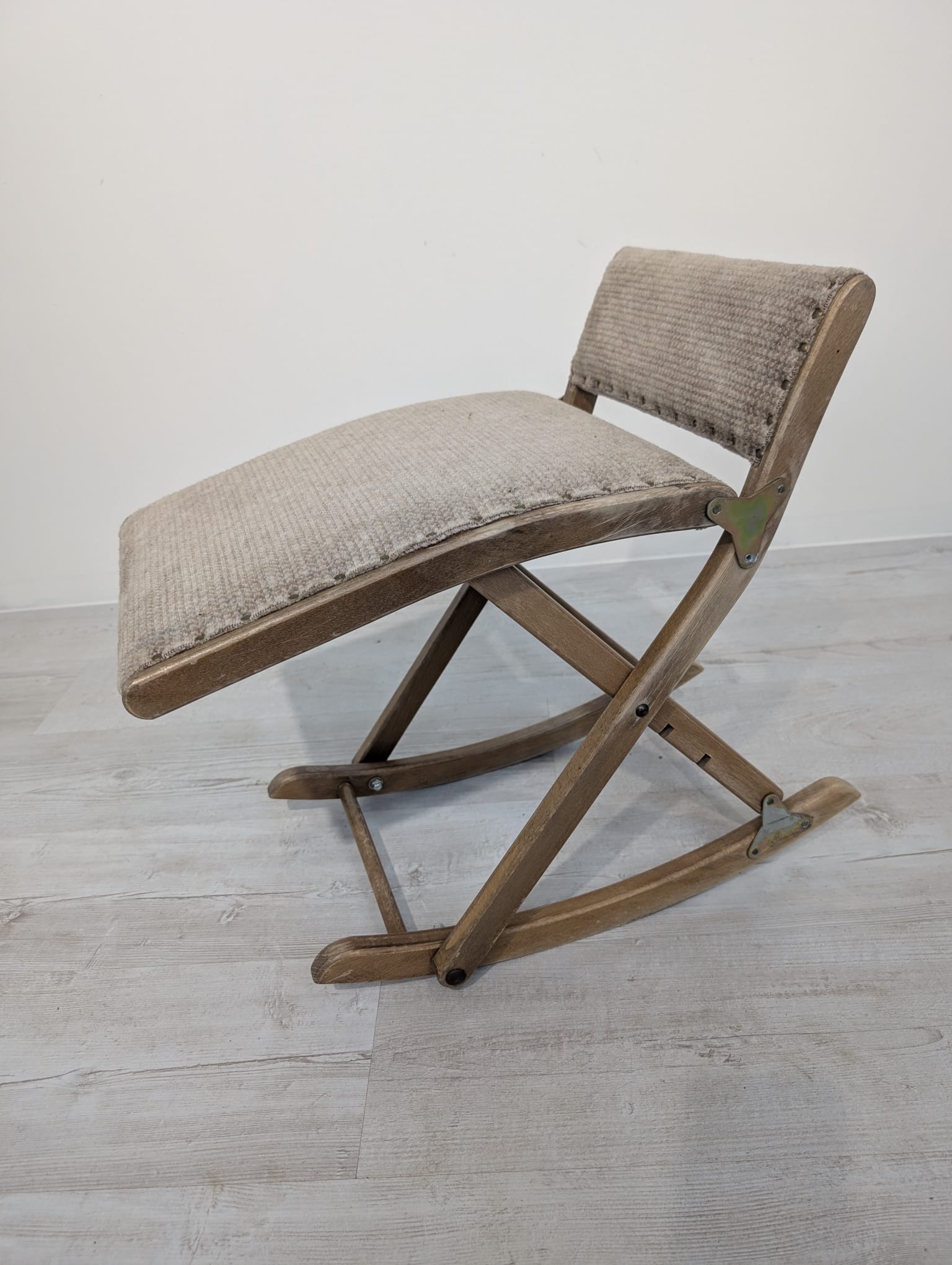 Comfortable wooden rocking pouf in vintage style. Ideal as an additional seat or footstool. It has a soft, beige upholstered seat. Product from the communist era, preserved in good condition.