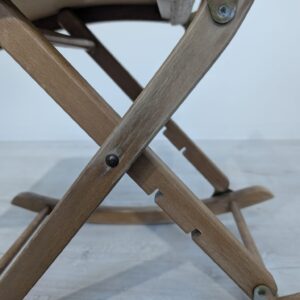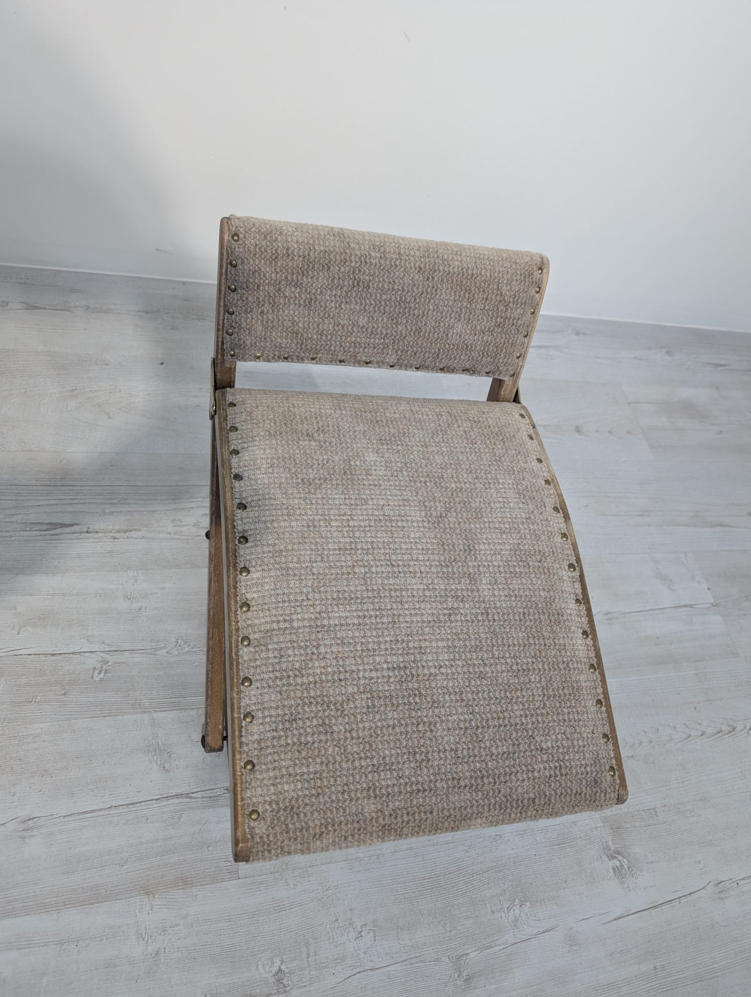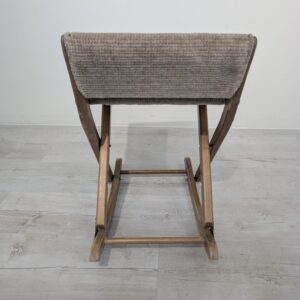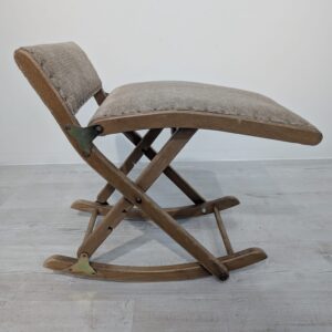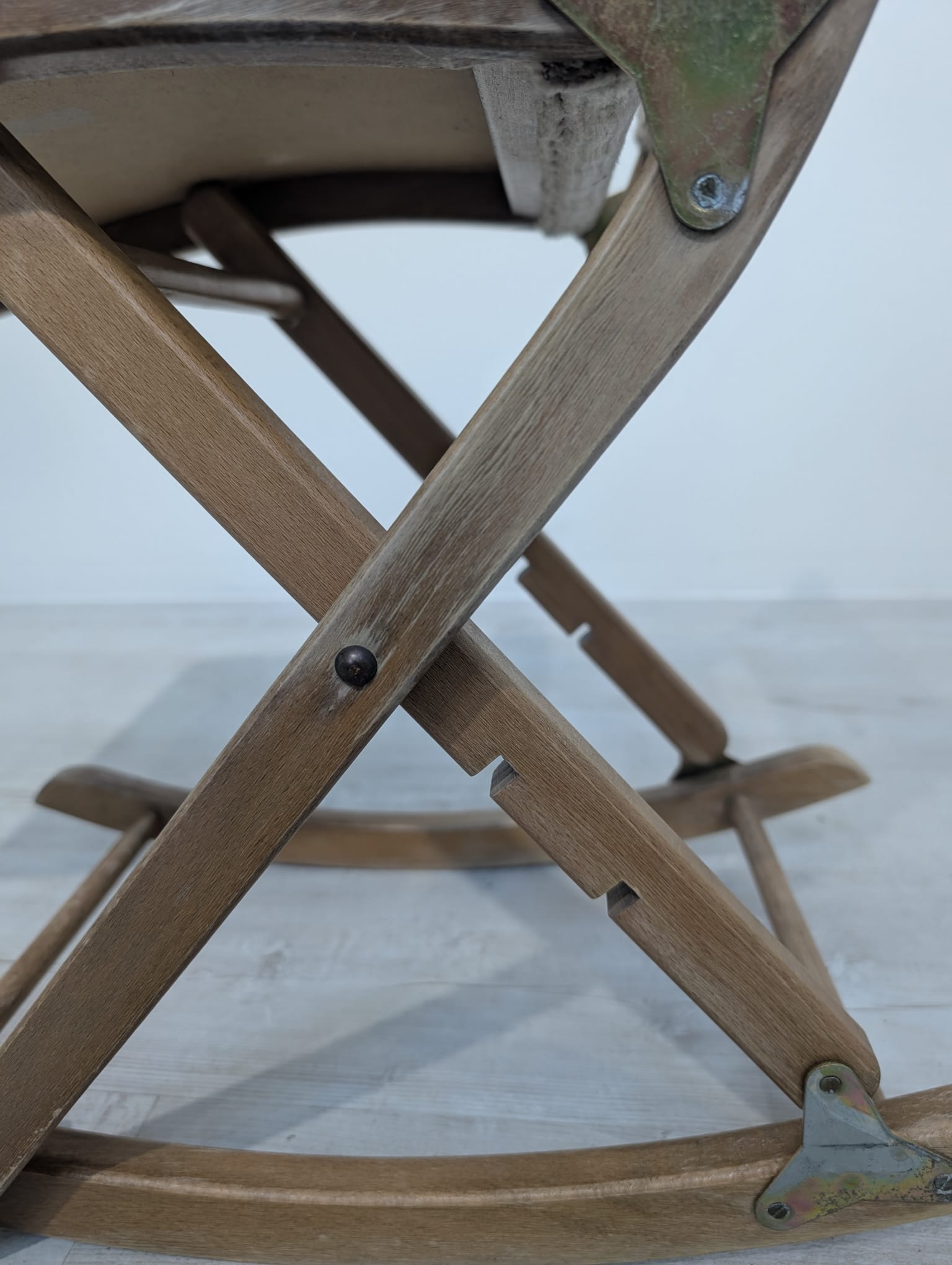 Comfortable wooden rocking pouf in vintage style. Ideal as an additional seat or footstool. It has a soft, beige upholstered seat. Product from the communist era, preserved in good condition.