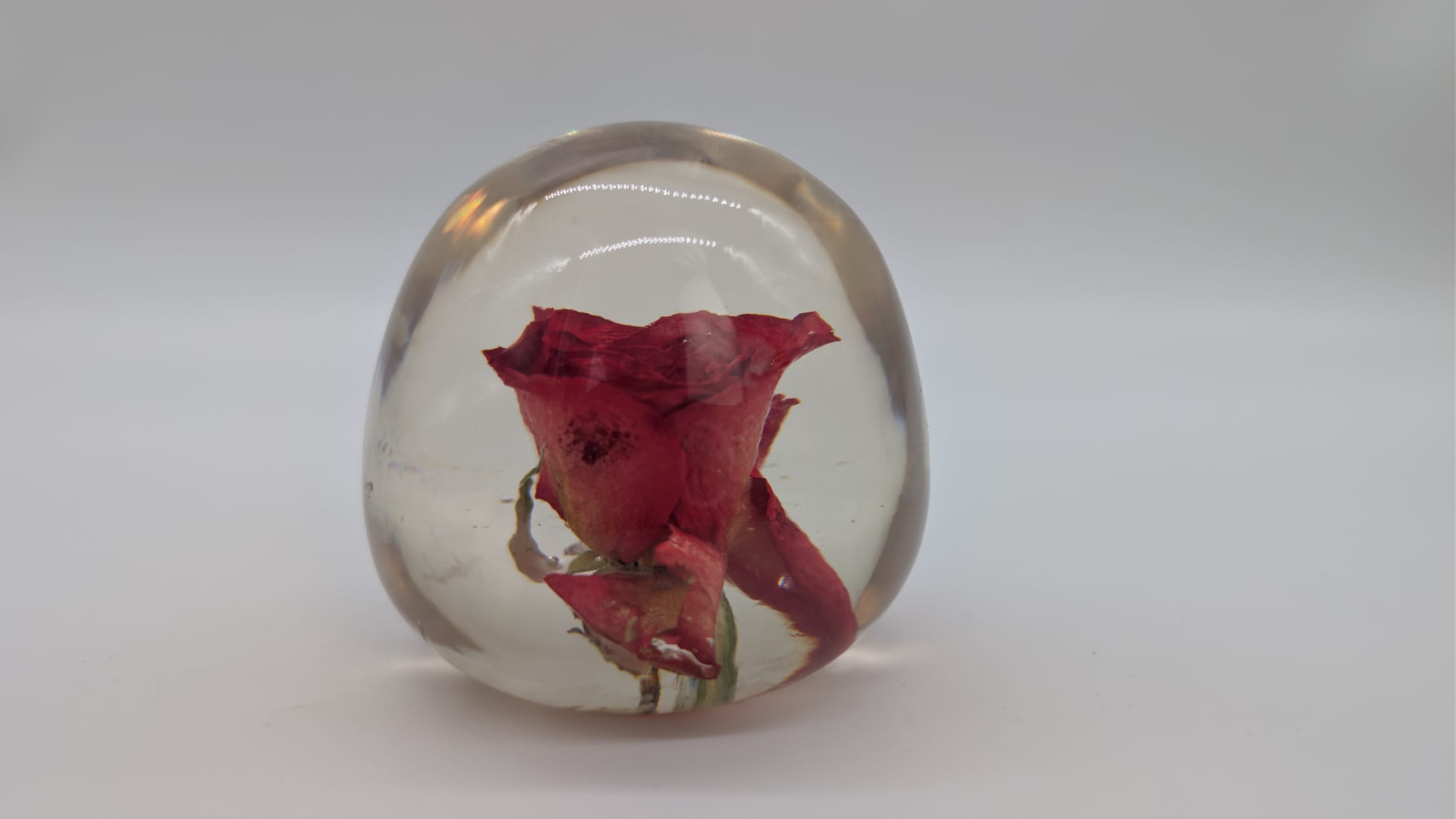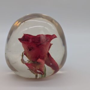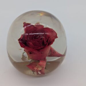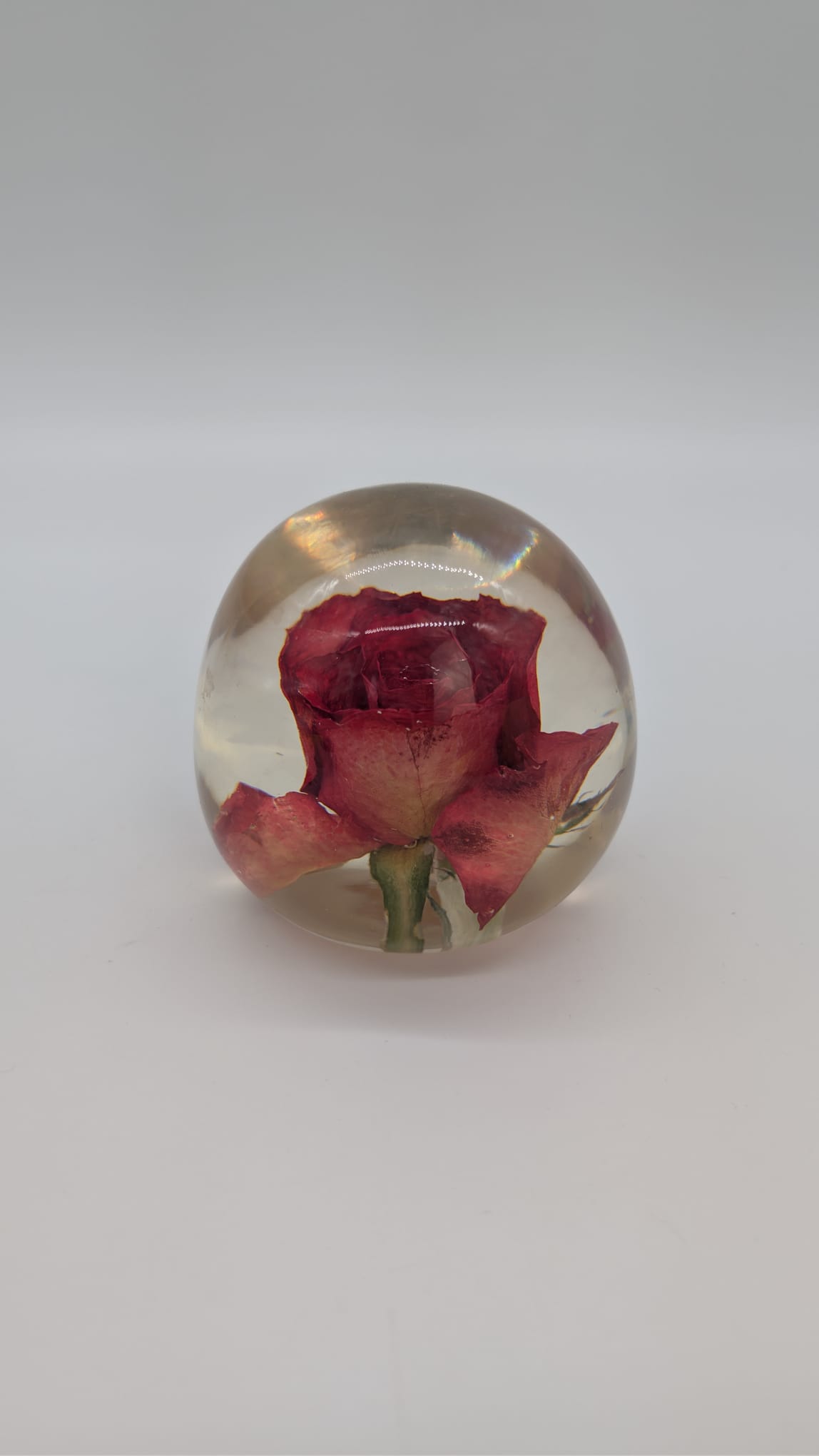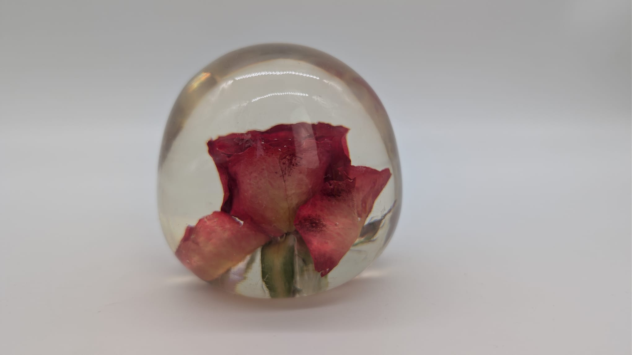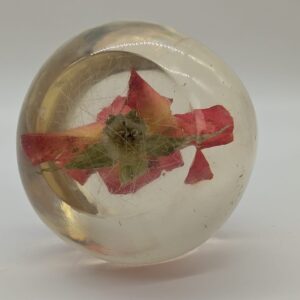 Dekoracyjna kula z zatopioną różą w żywicy. Unikalna ozdoba, która dodaje uroku każdemu wnętrzu. Idealna jako prezent lub dodatek do domu.