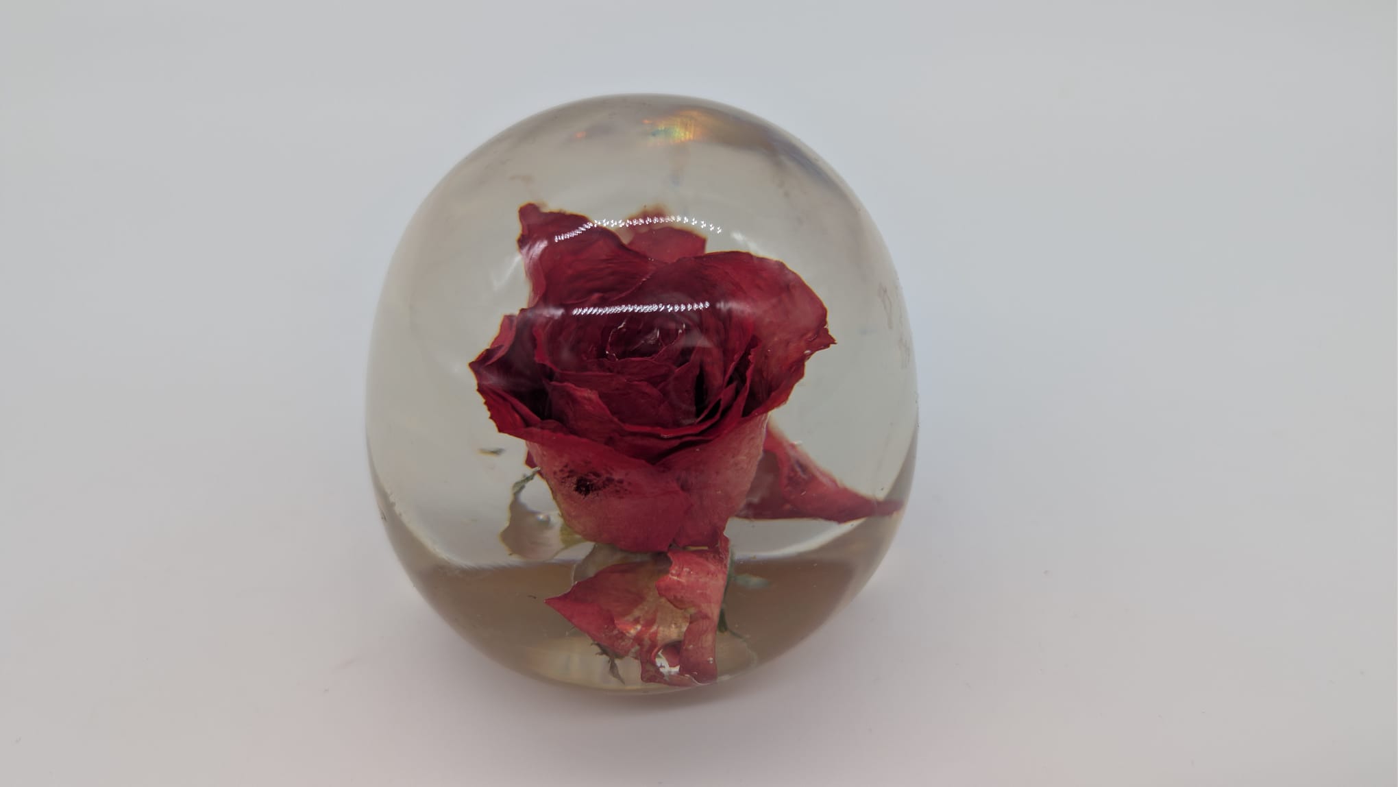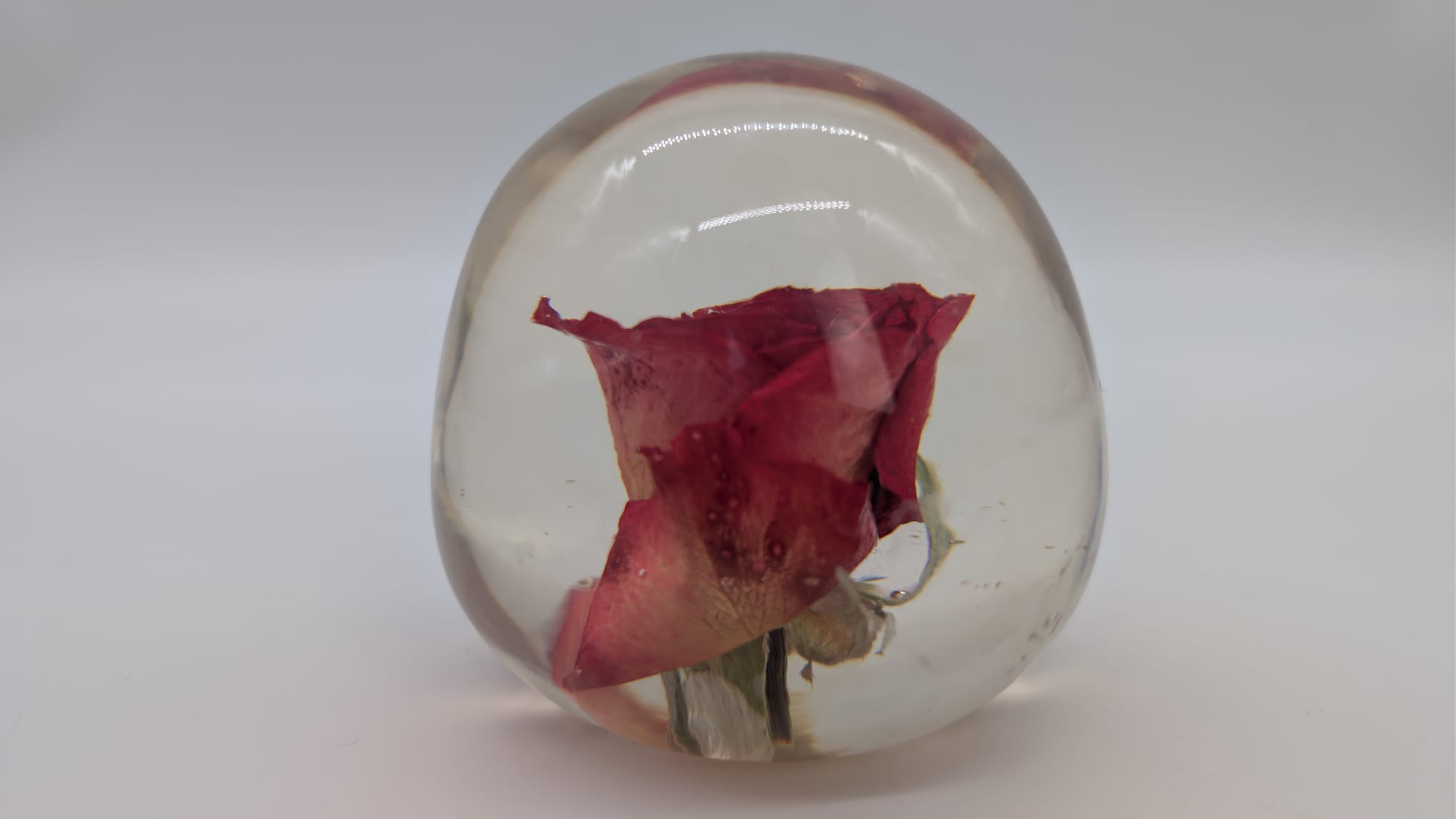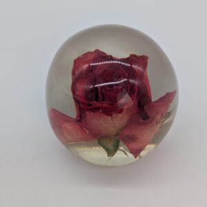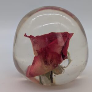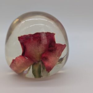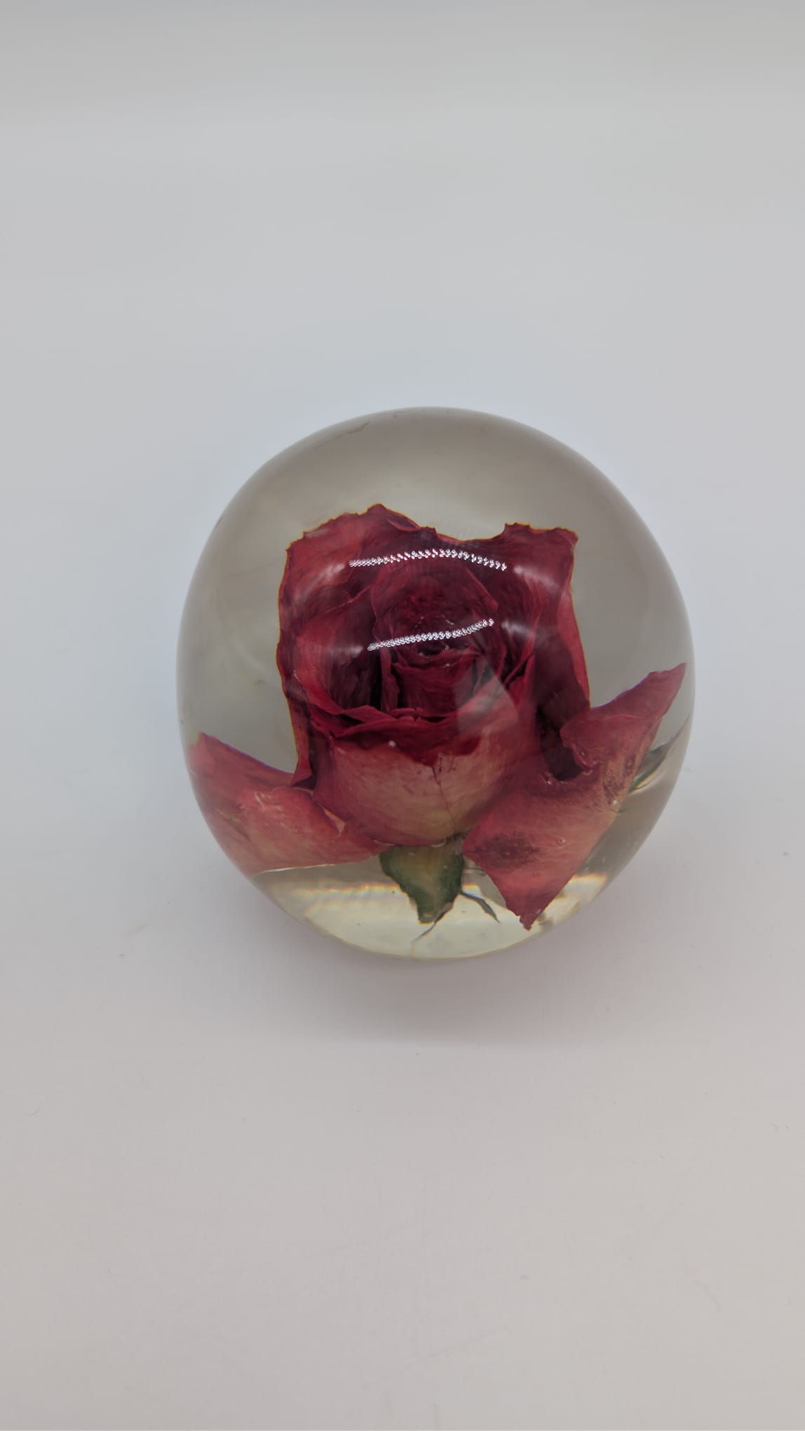 Dekoracyjna kula z zatopioną różą w żywicy. Unikalna ozdoba, która dodaje uroku każdemu wnętrzu. Idealna jako prezent lub dodatek do domu.