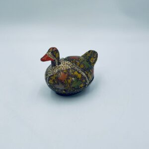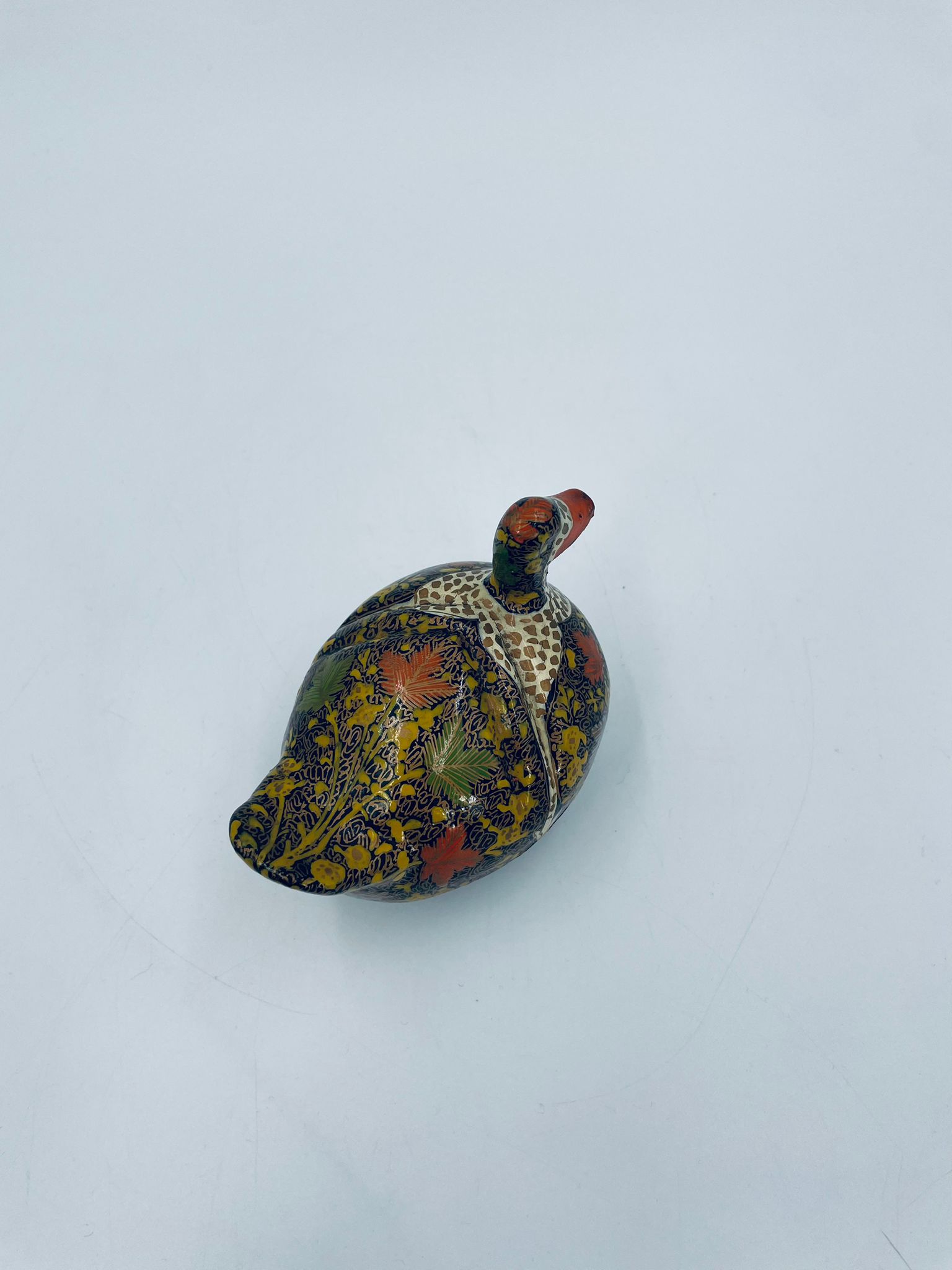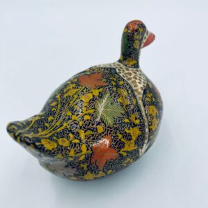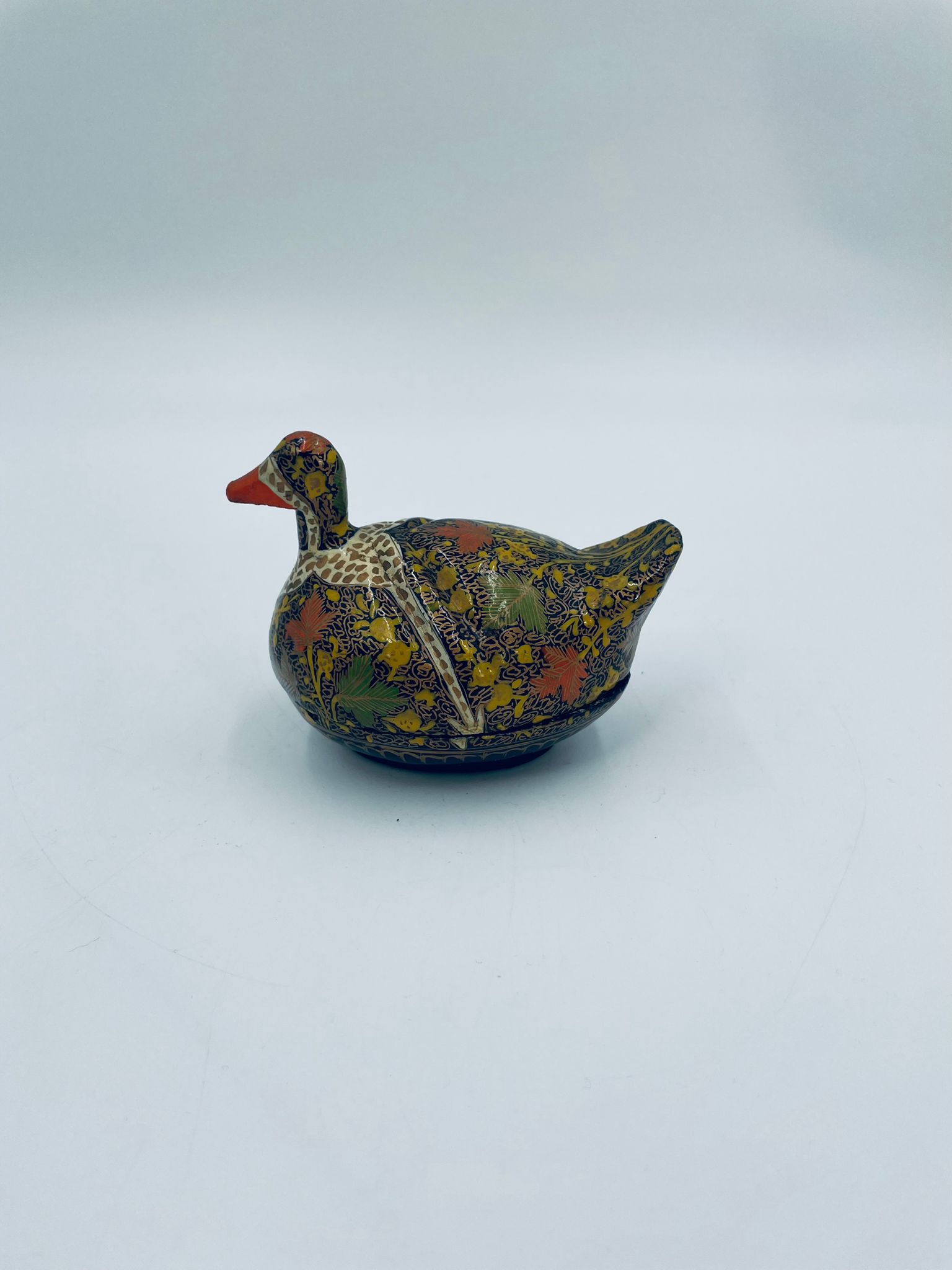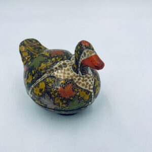 Puzderko dekoracyjne w stylu Vintage, pochodzące prawdopodobnie z kaszmiru, wykonane z lekkiego materiału, najczęściej z masy papierowej. Puzderko w kształcie kaczki, ręcznie malowane w misterne wzory roślinne.