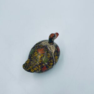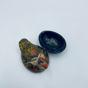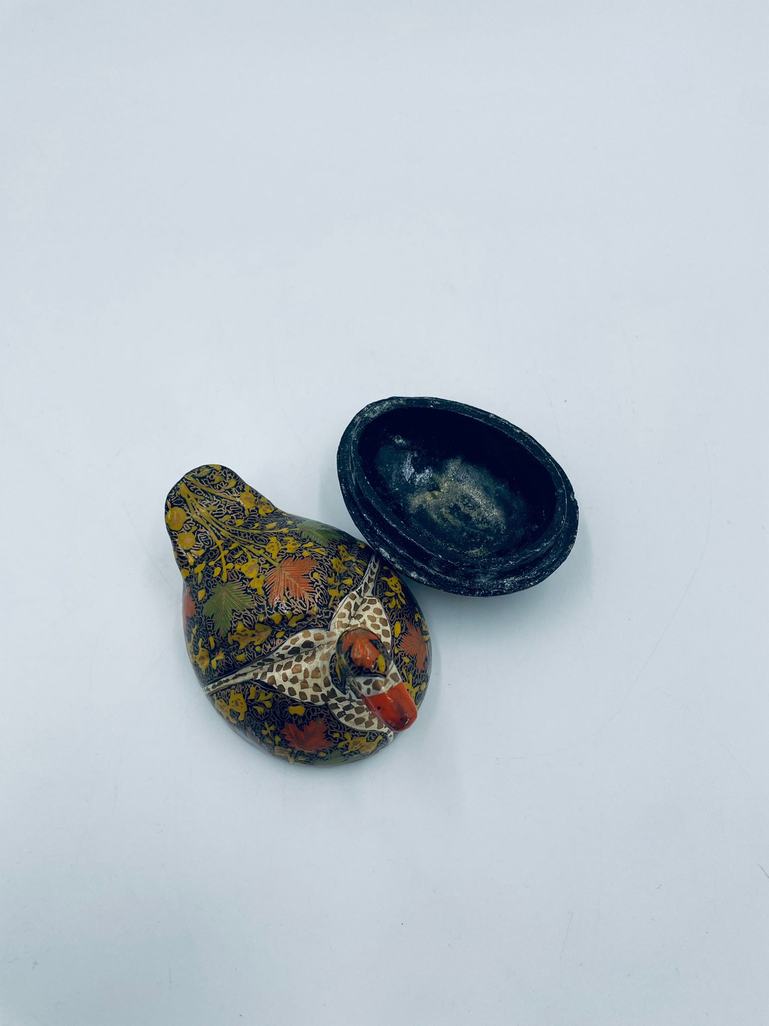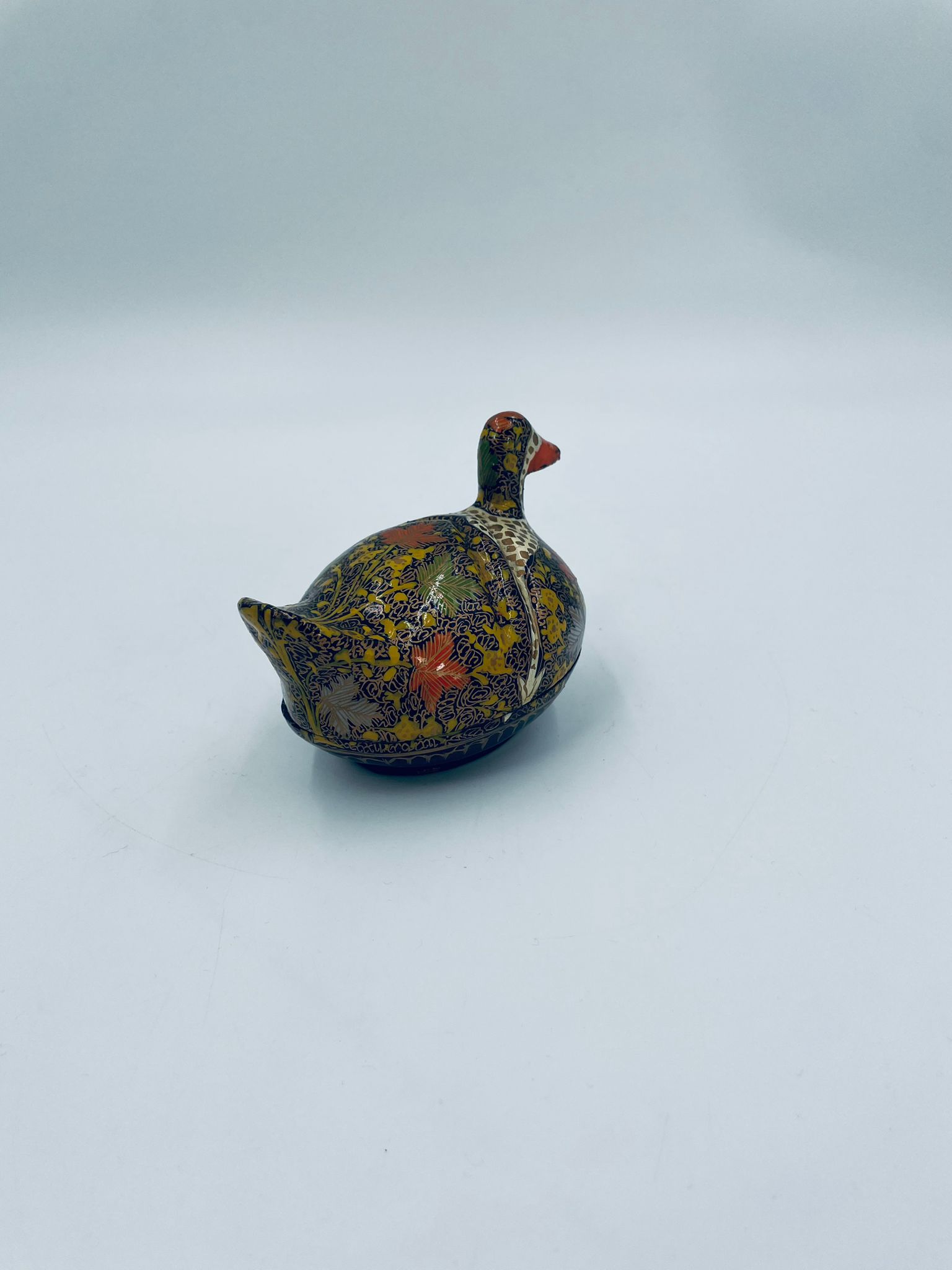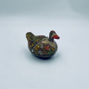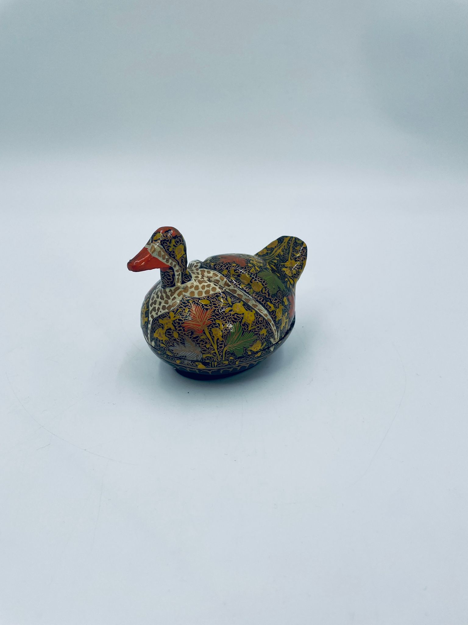 Puzderko dekoracyjne w stylu Vintage, pochodzące prawdopodobnie z kaszmiru, wykonane z lekkiego materiału, najczęściej z masy papierowej. Puzderko w kształcie kaczki, ręcznie malowane w misterne wzory roślinne.