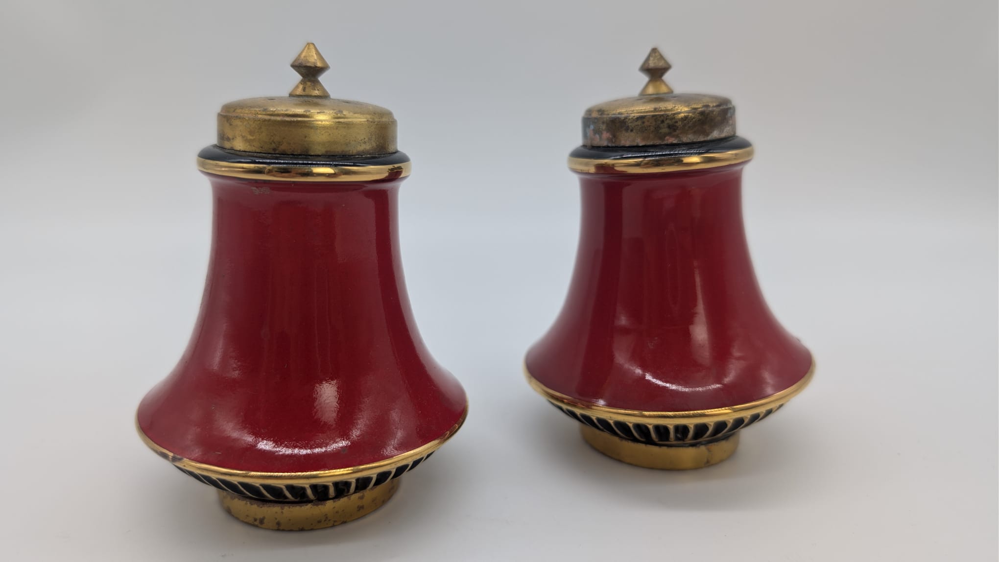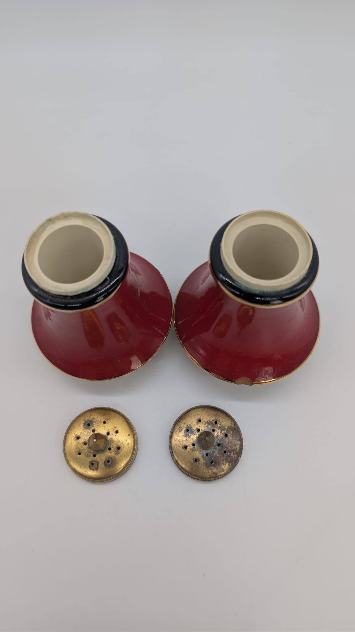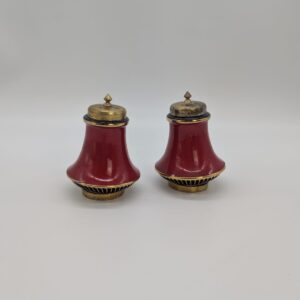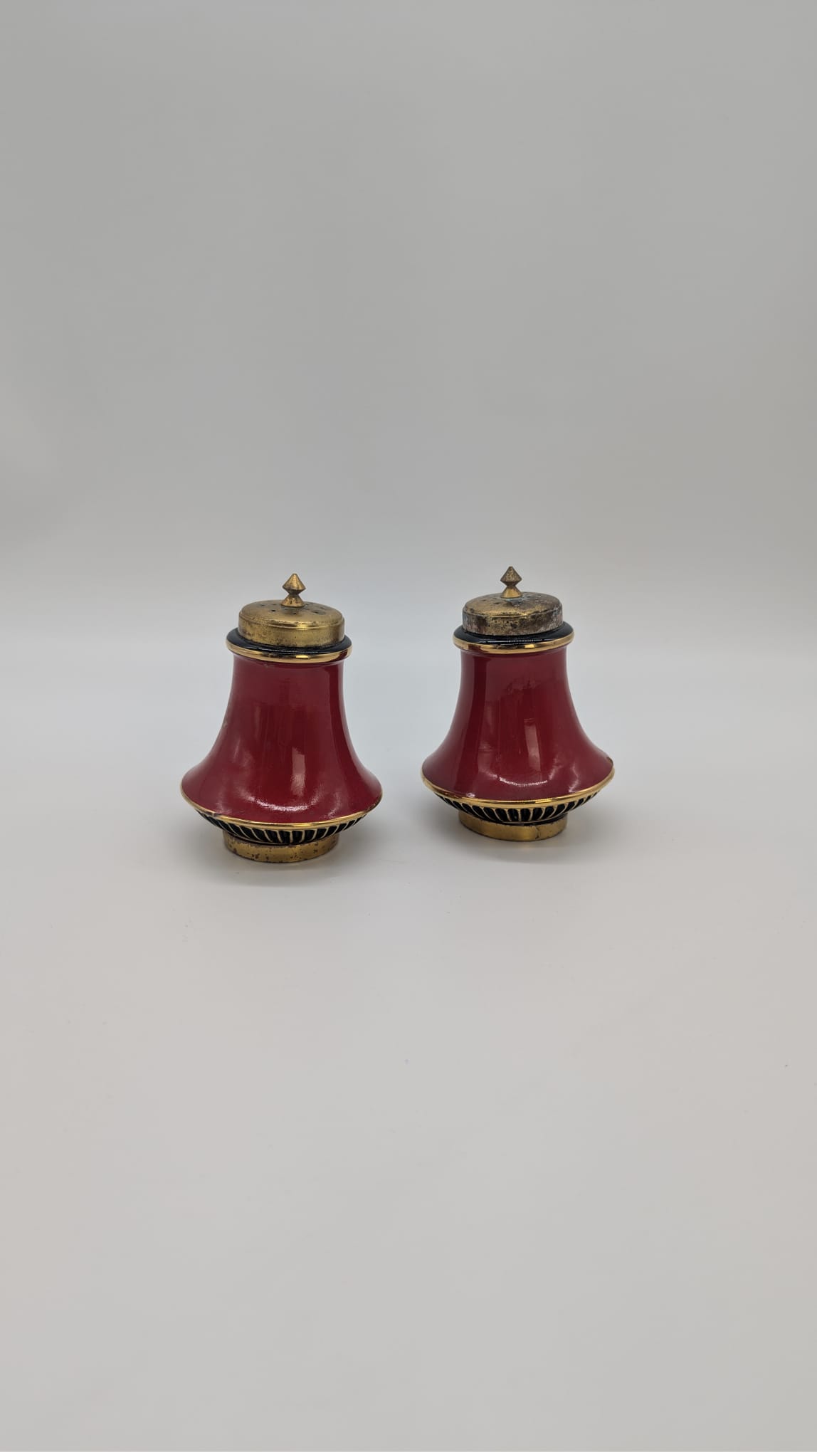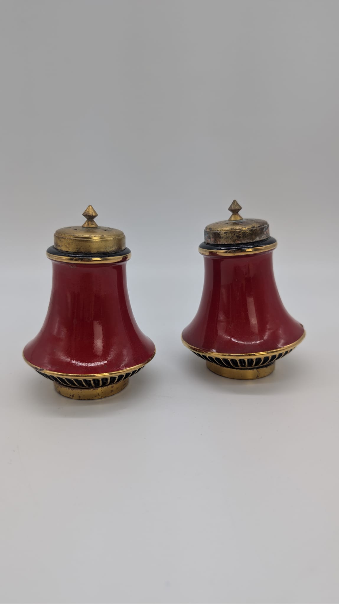 Elegant ceramic salt and pepper shakers in red with gold metal trims. The perfect addition to your kitchen or dining room to give your interior a stylish and exclusive look.