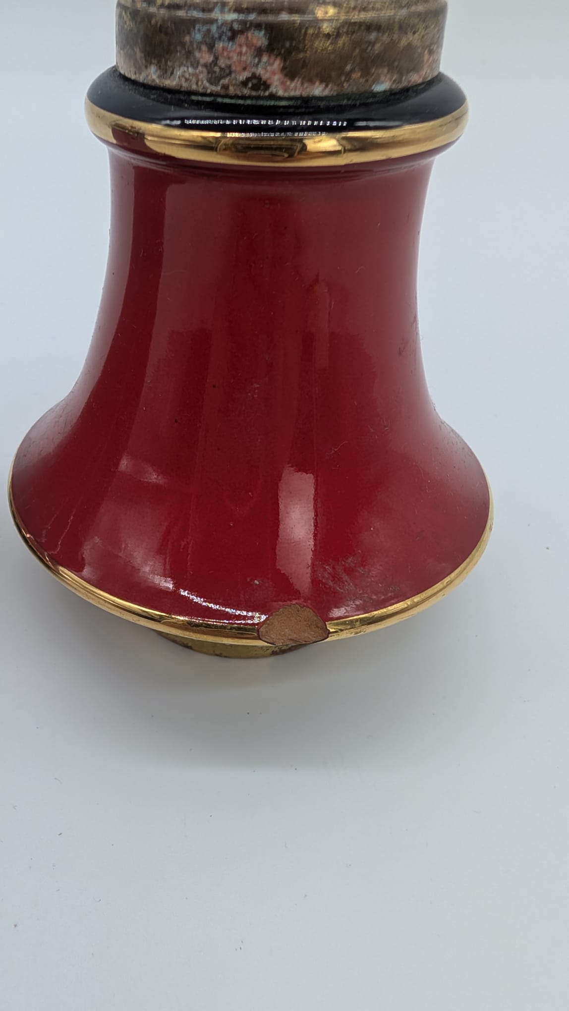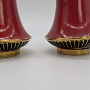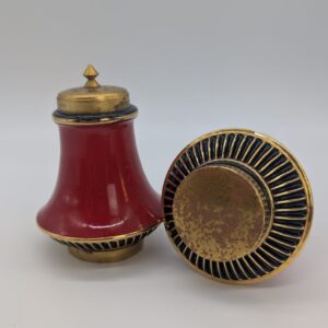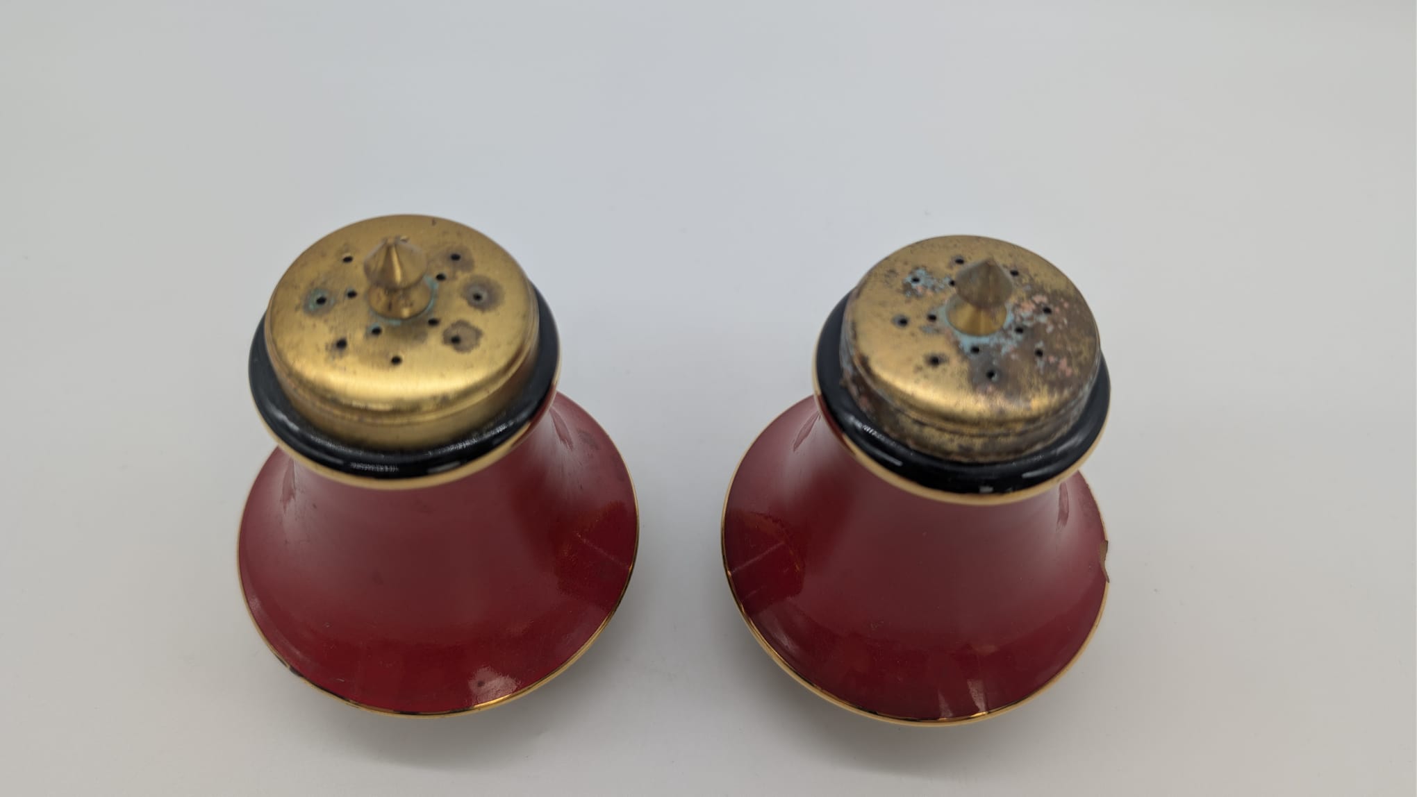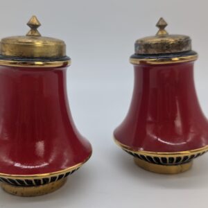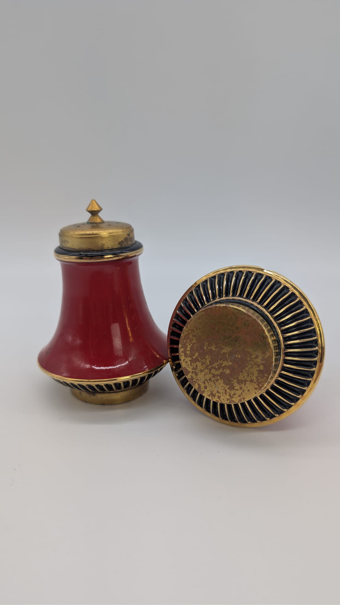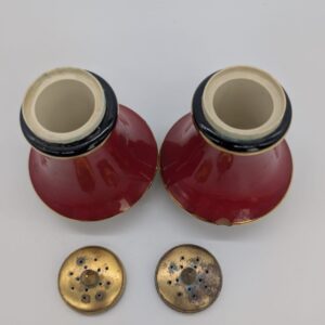 Elegant ceramic salt and pepper shakers in red with gold metal trims. The perfect addition to your kitchen or dining room to give your interior a stylish and exclusive look.