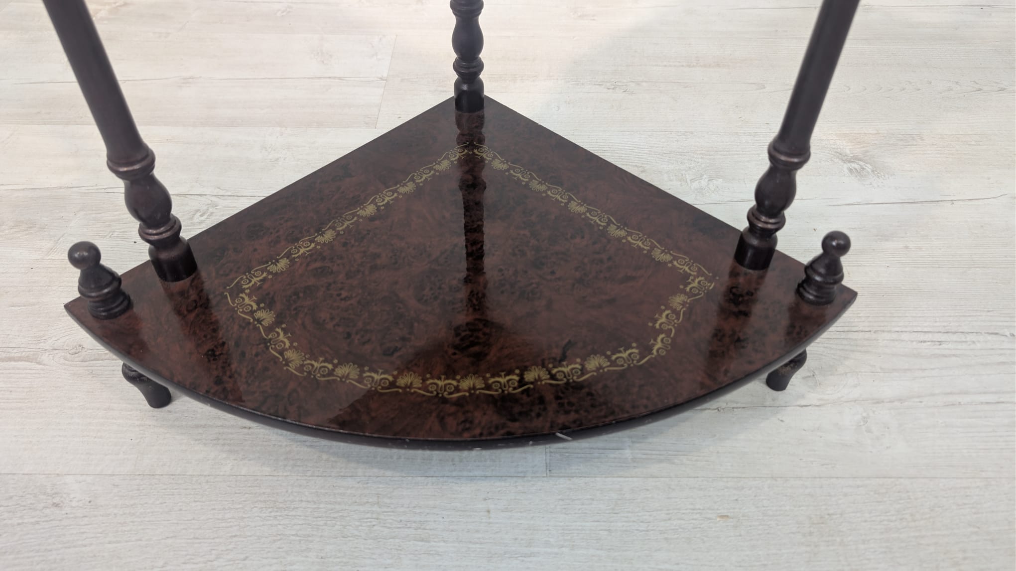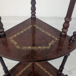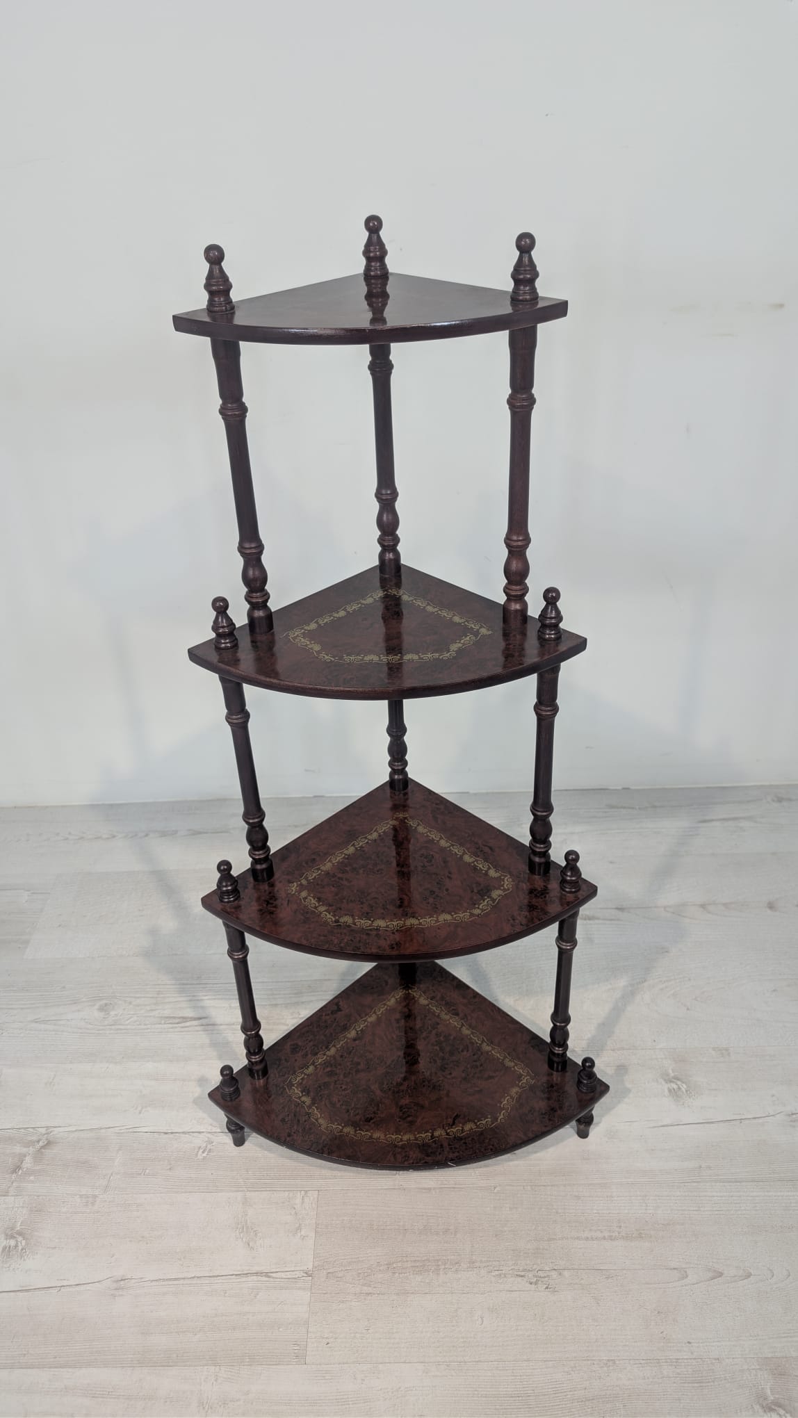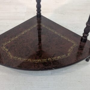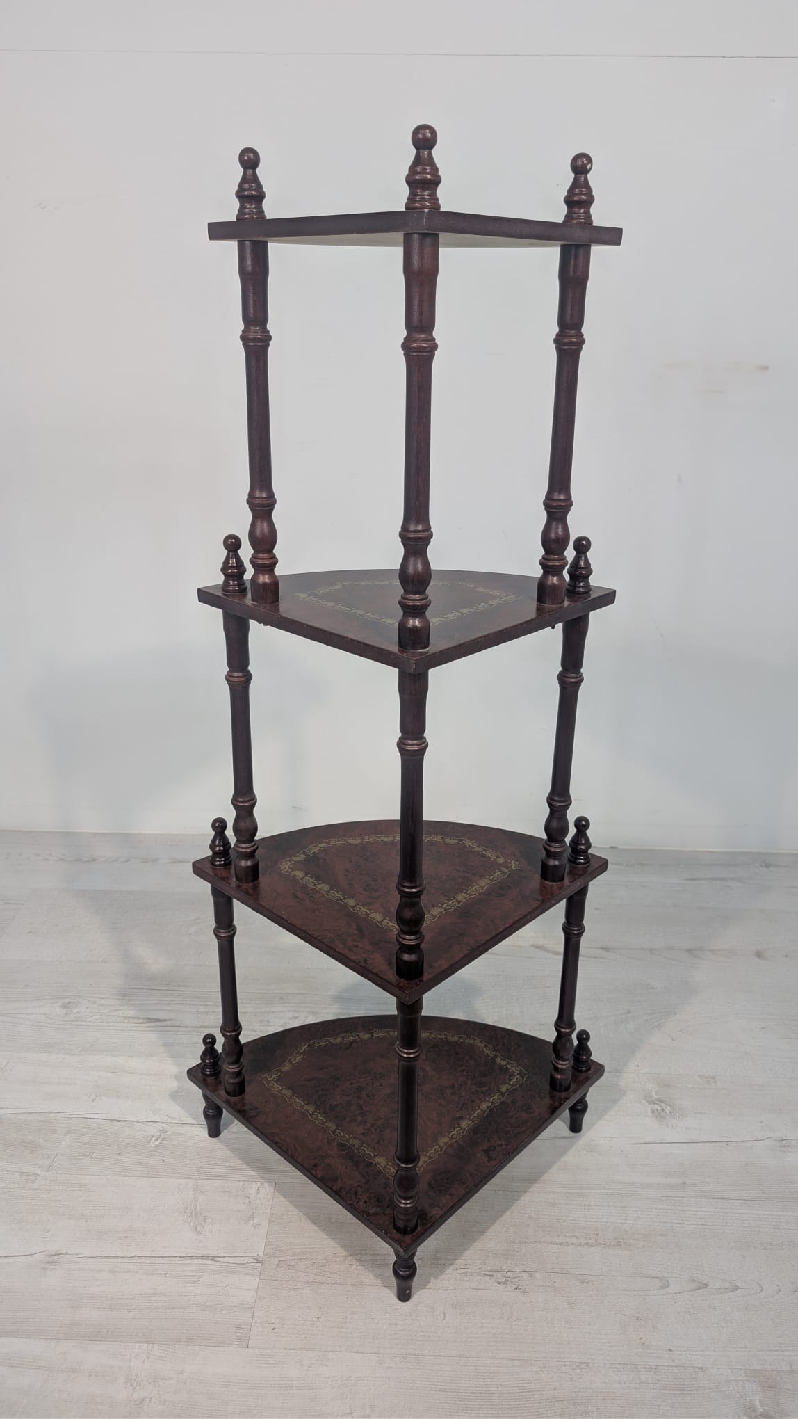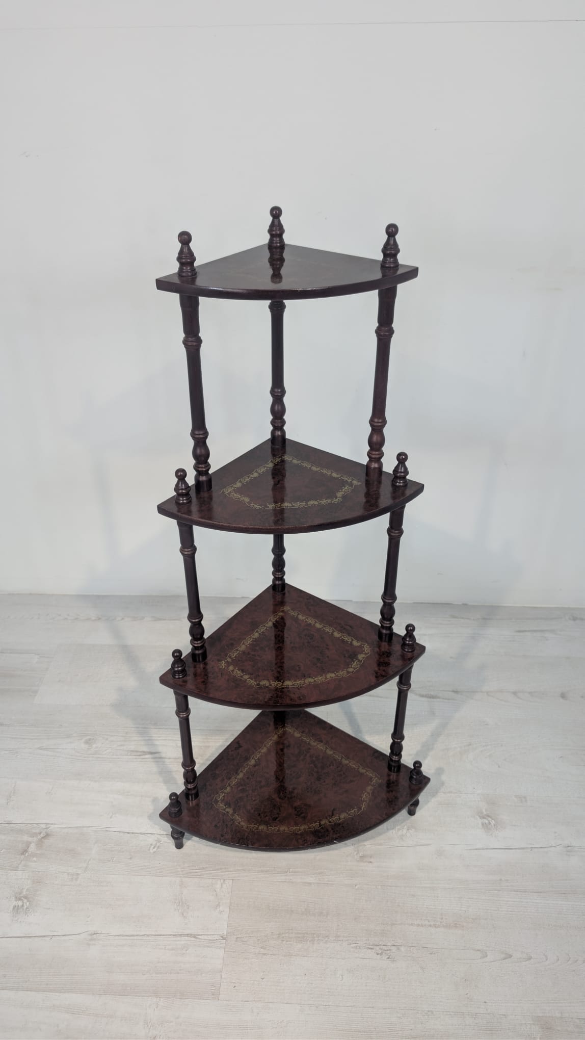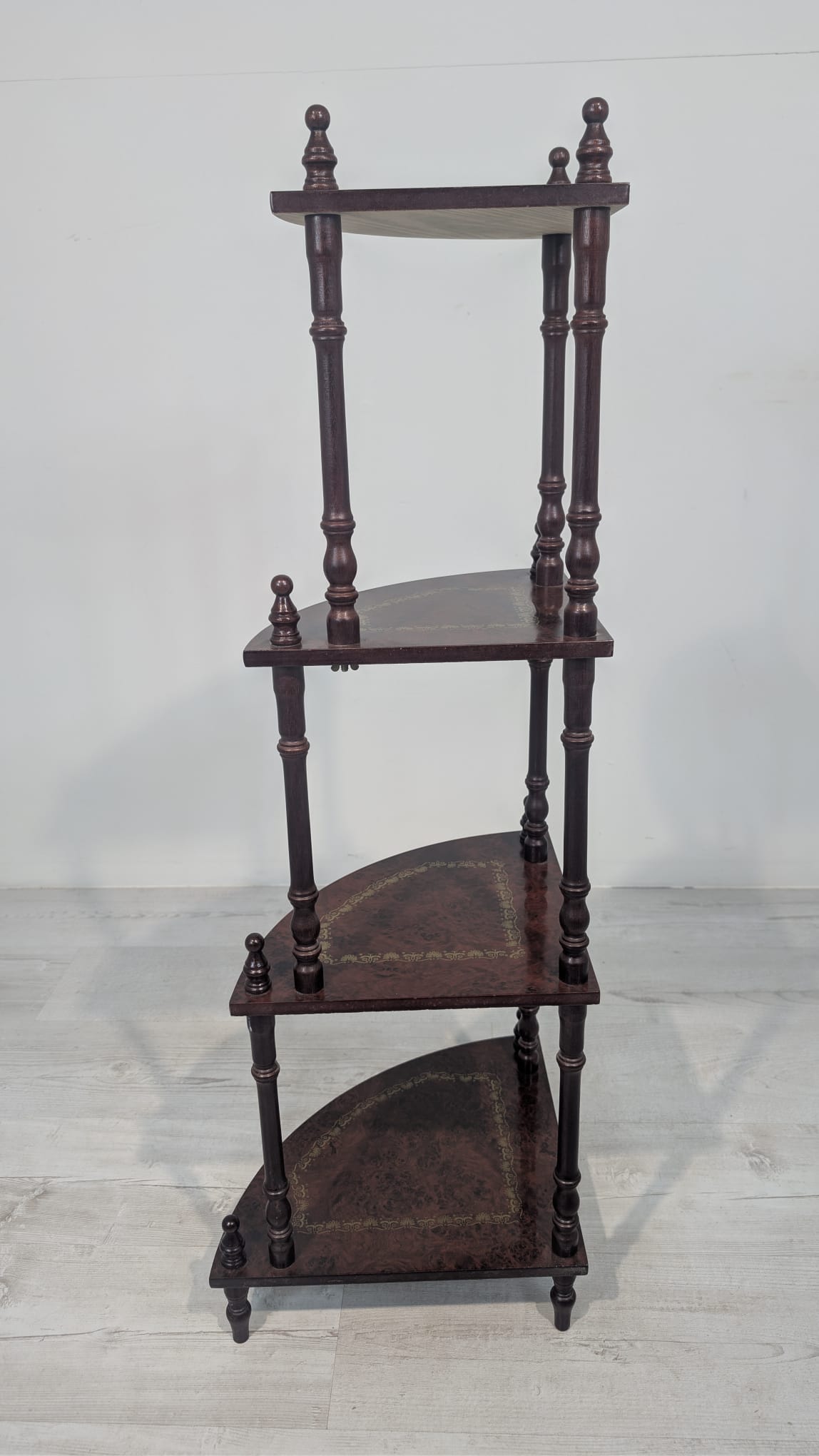 Stylowy regał na kwiaty z drewnianymi, toczonymi nogami w kolorze orzecha. Mebel posiada ozdobne, złote zdobienia, nadające mu elegancki wygląd. Idealny do stworzenia przytulnego kącika w domu lub na tarasie.