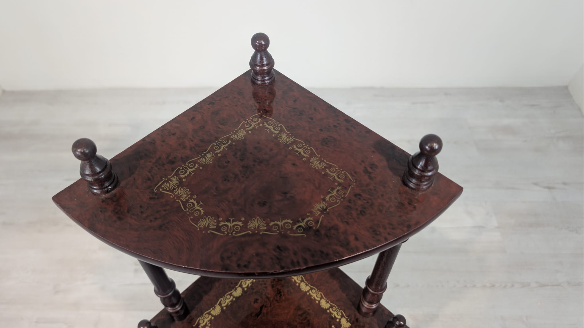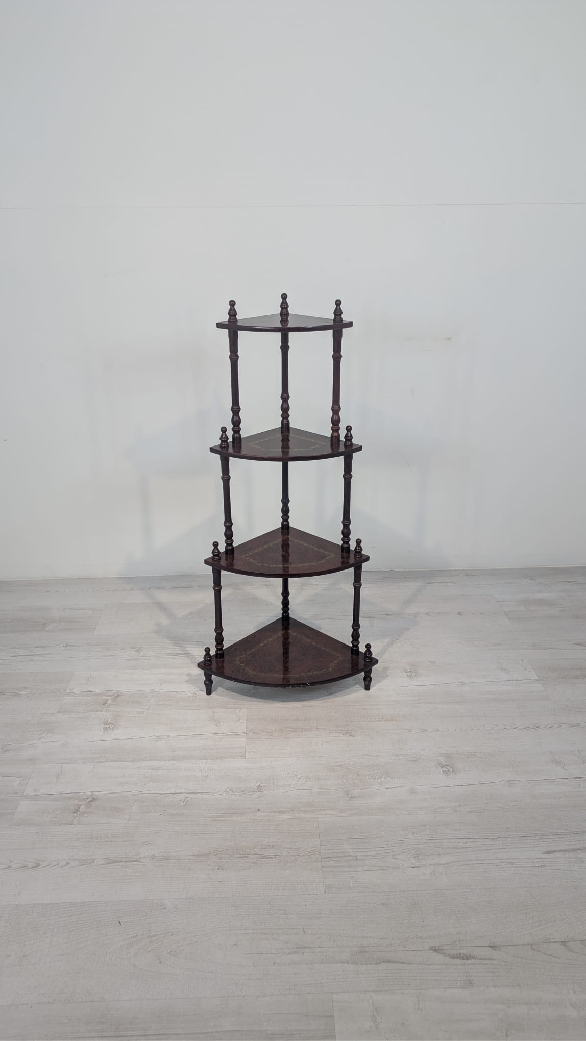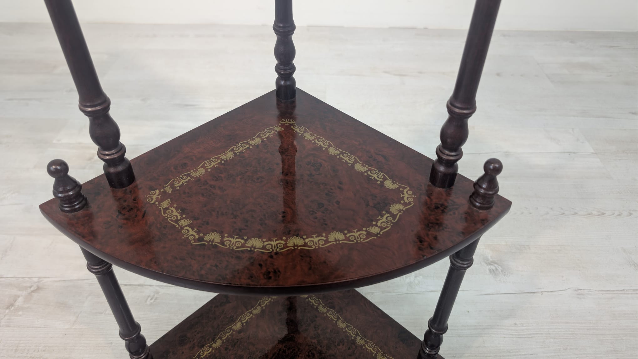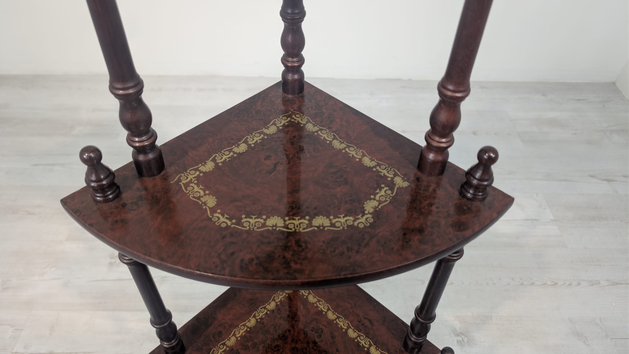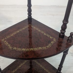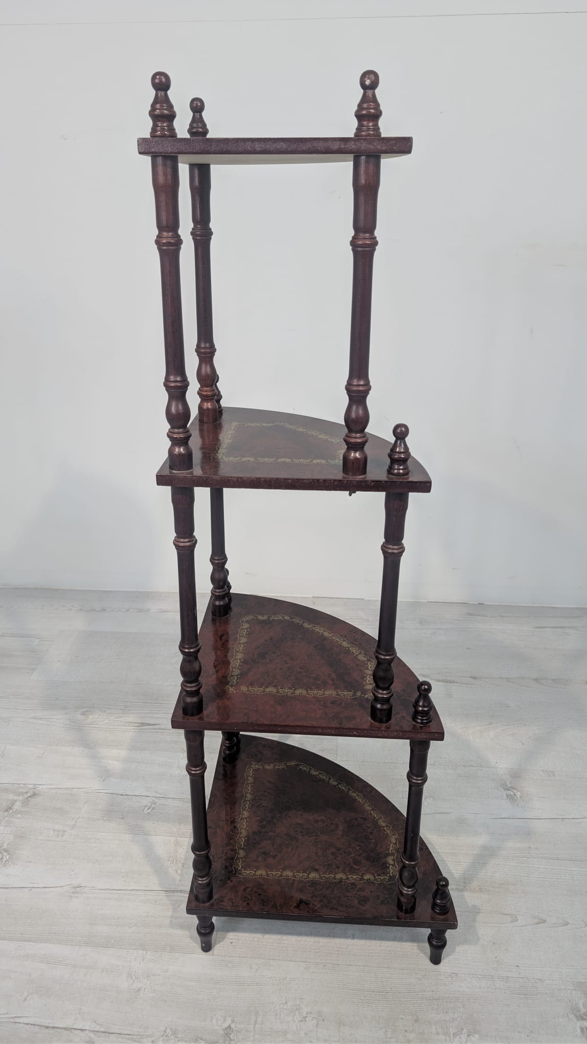 Stylowy regał na kwiaty z drewnianymi, toczonymi nogami w kolorze orzecha. Mebel posiada ozdobne, złote zdobienia, nadające mu elegancki wygląd. Idealny do stworzenia przytulnego kącika w domu lub na tarasie.