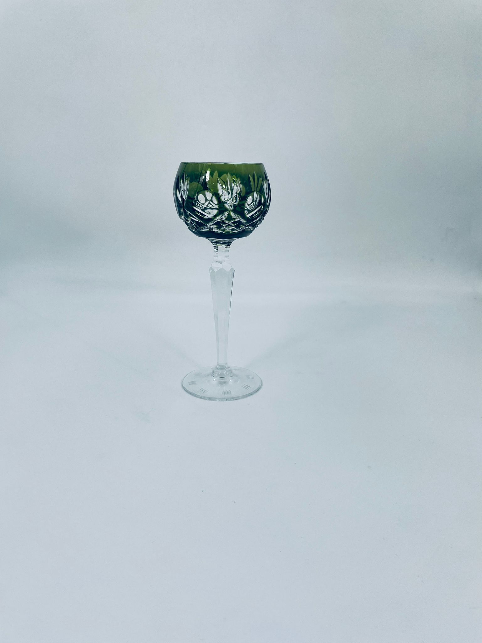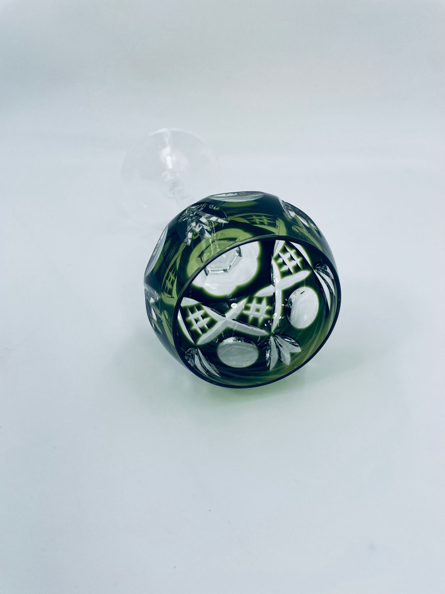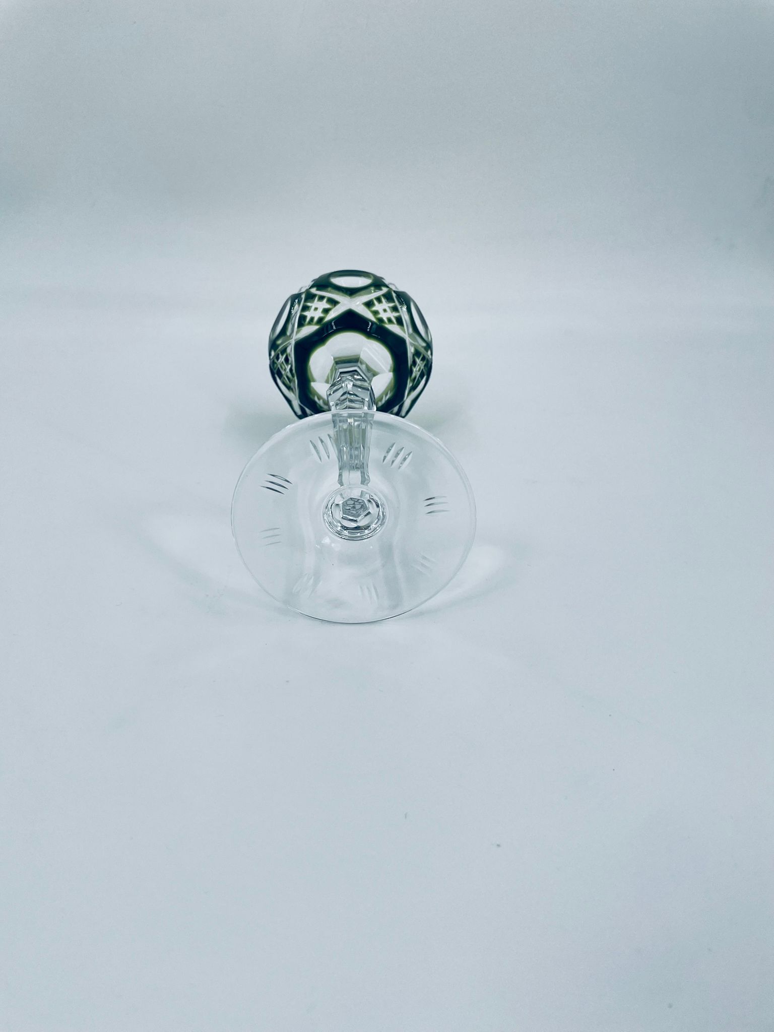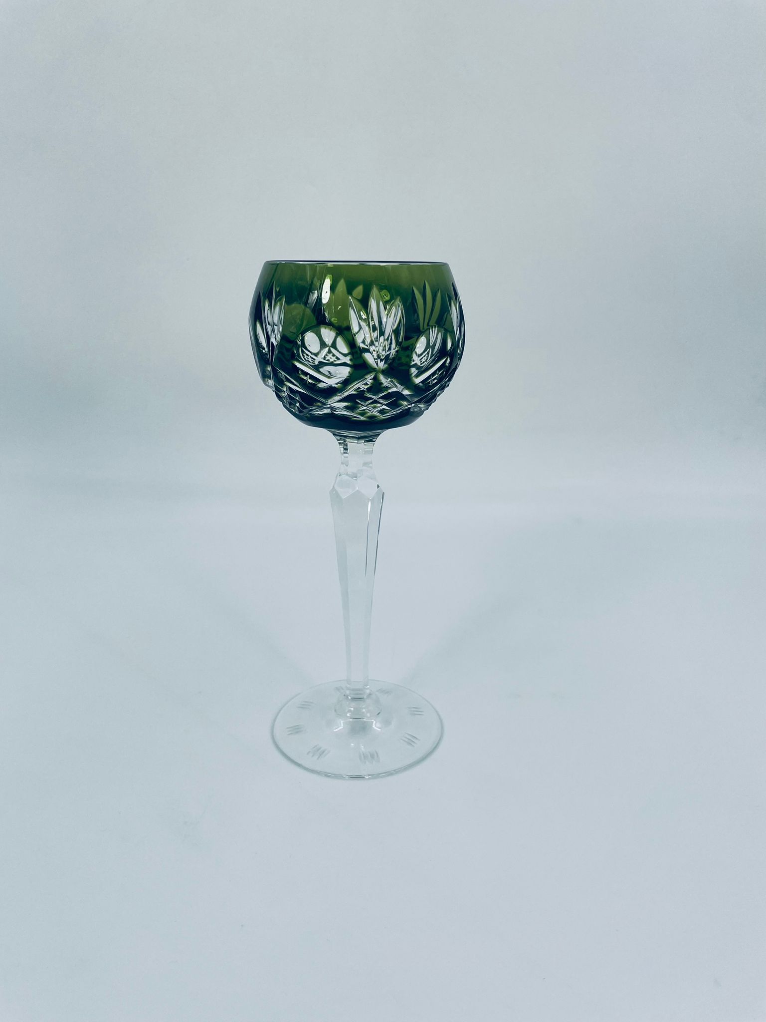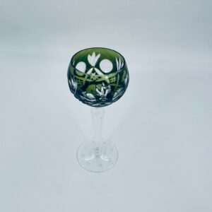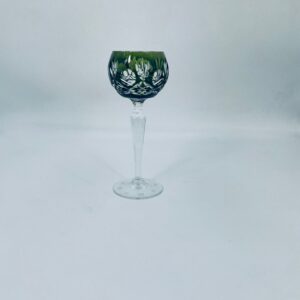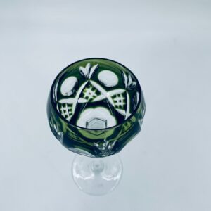 Römer type wine glass, made of high quality lead crystal glass. Bottle-green coloured bowl, hand-cut with decorative cut-out pattern, leg and decorative transparent base.