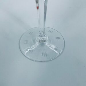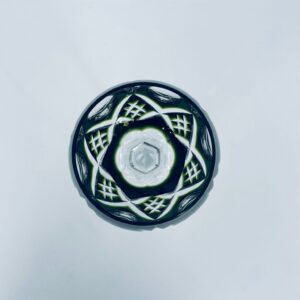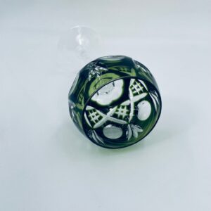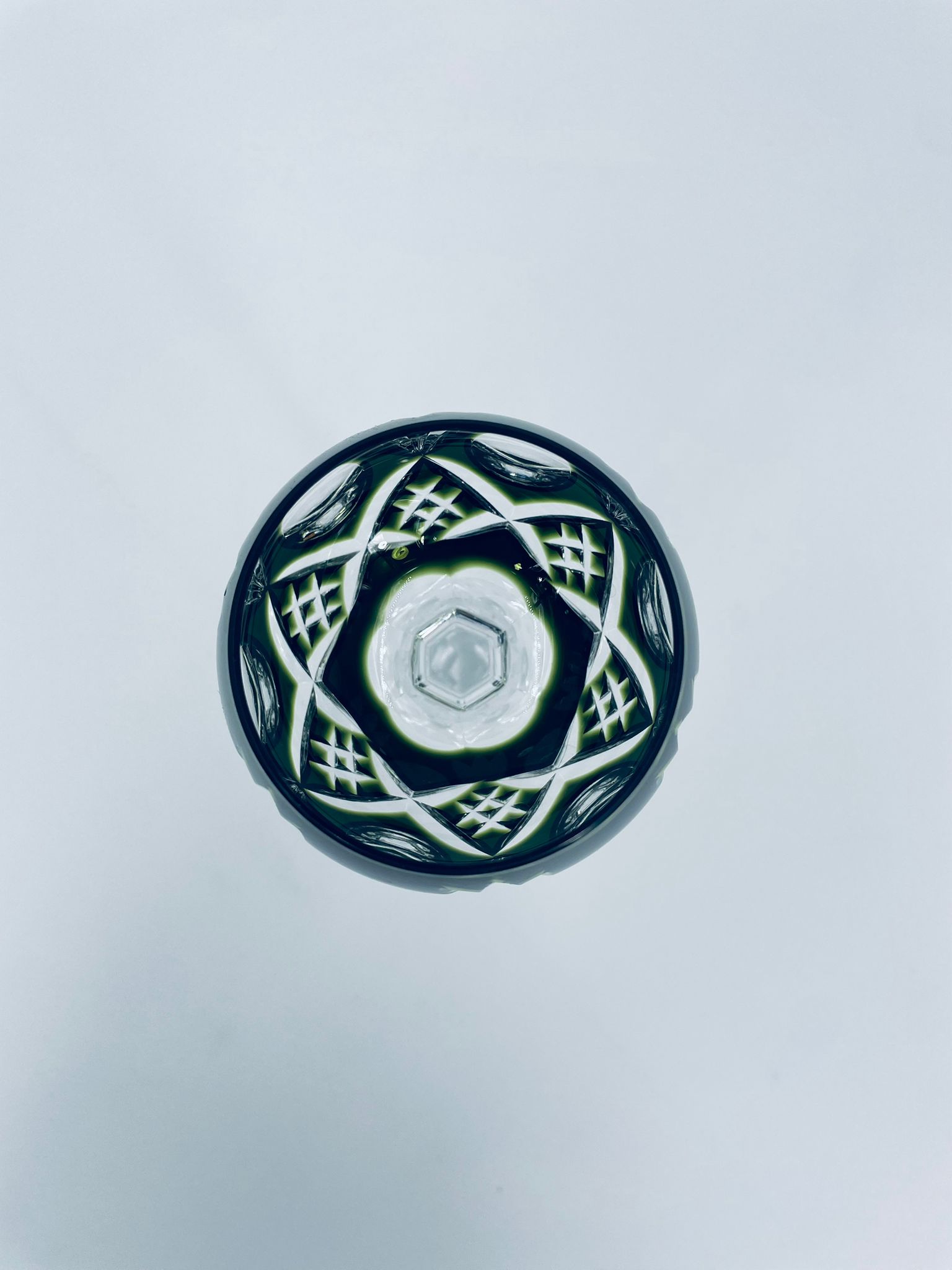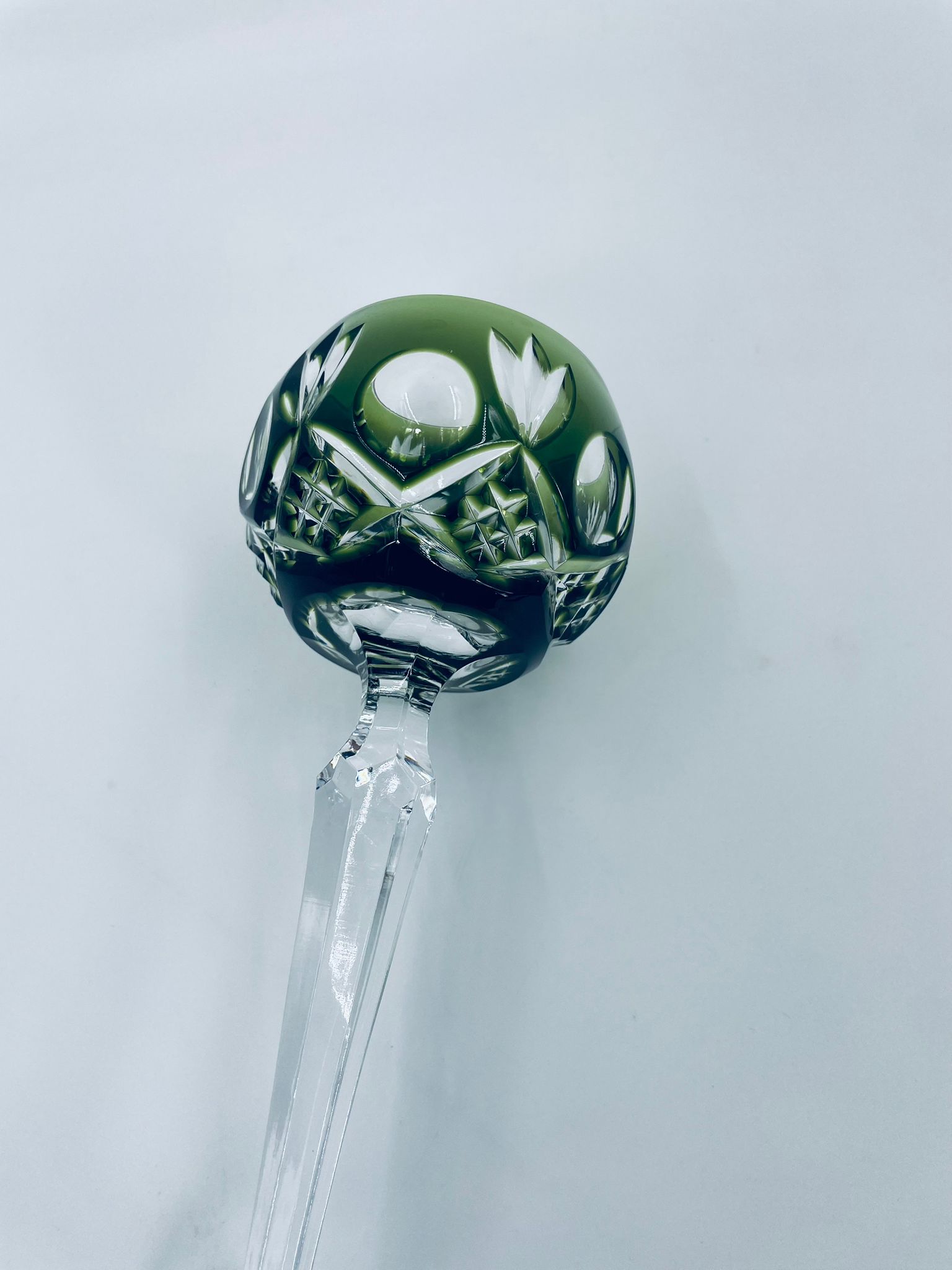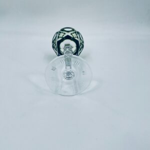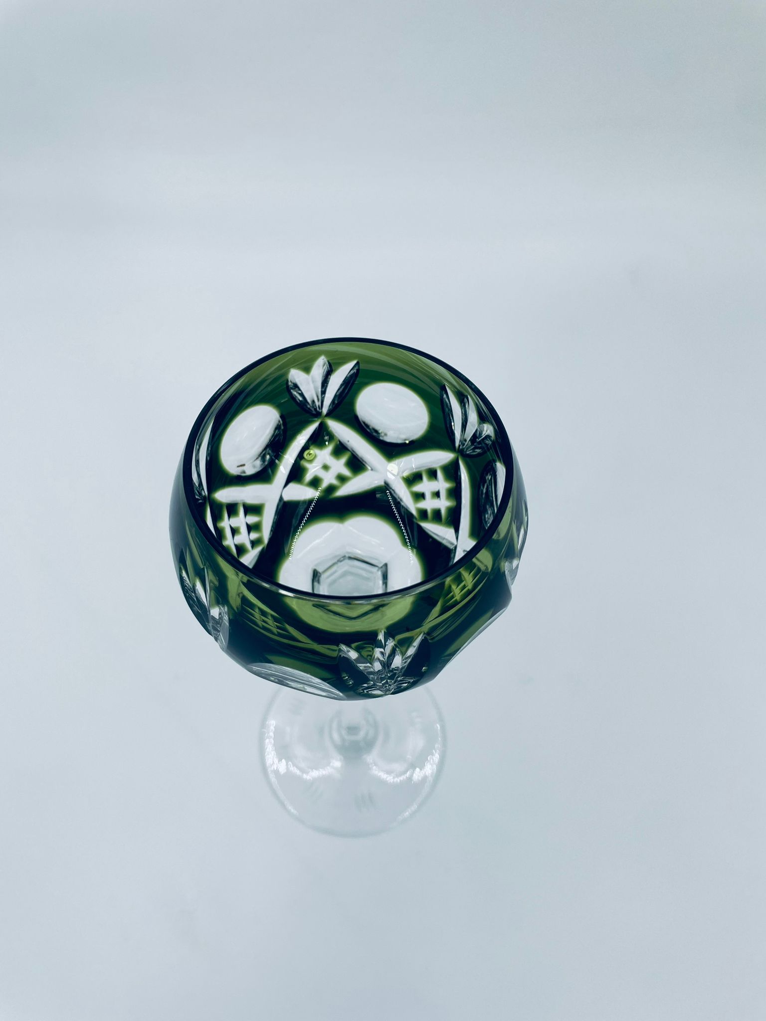 Römer type wine glass, made of high quality lead crystal glass. Bottle-green coloured bowl, hand-cut with decorative cut-out pattern, leg and decorative transparent base.