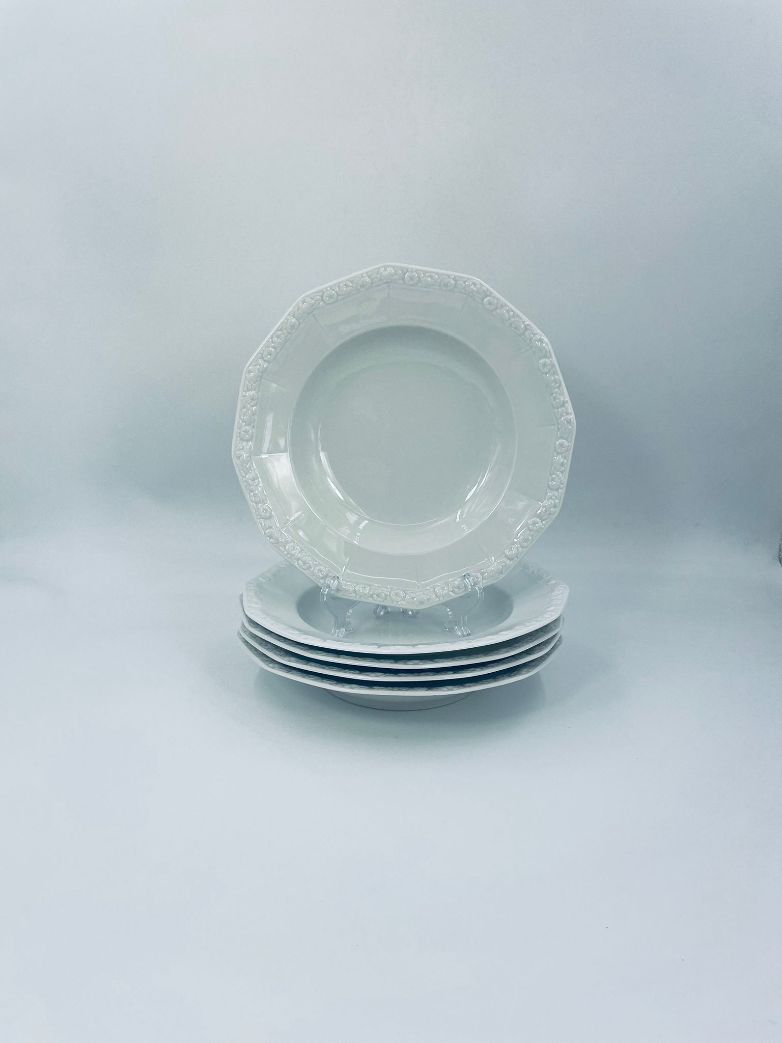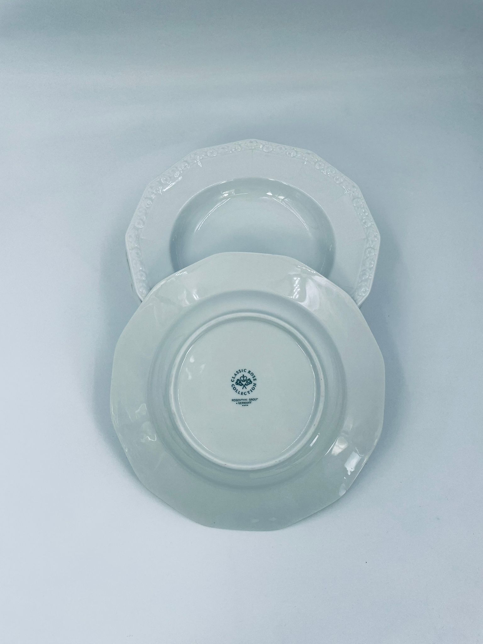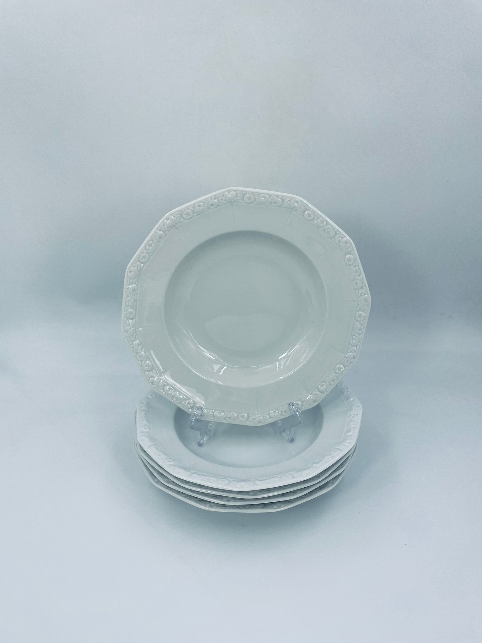A deep plate from the Rosenthal collection Classic Rose, Maria Weiss, made of high quality white porcelain. The plate has a classic design with an embossed rose motif on the rim. One plate has a small damage to the underside at the rim, hardly visible.