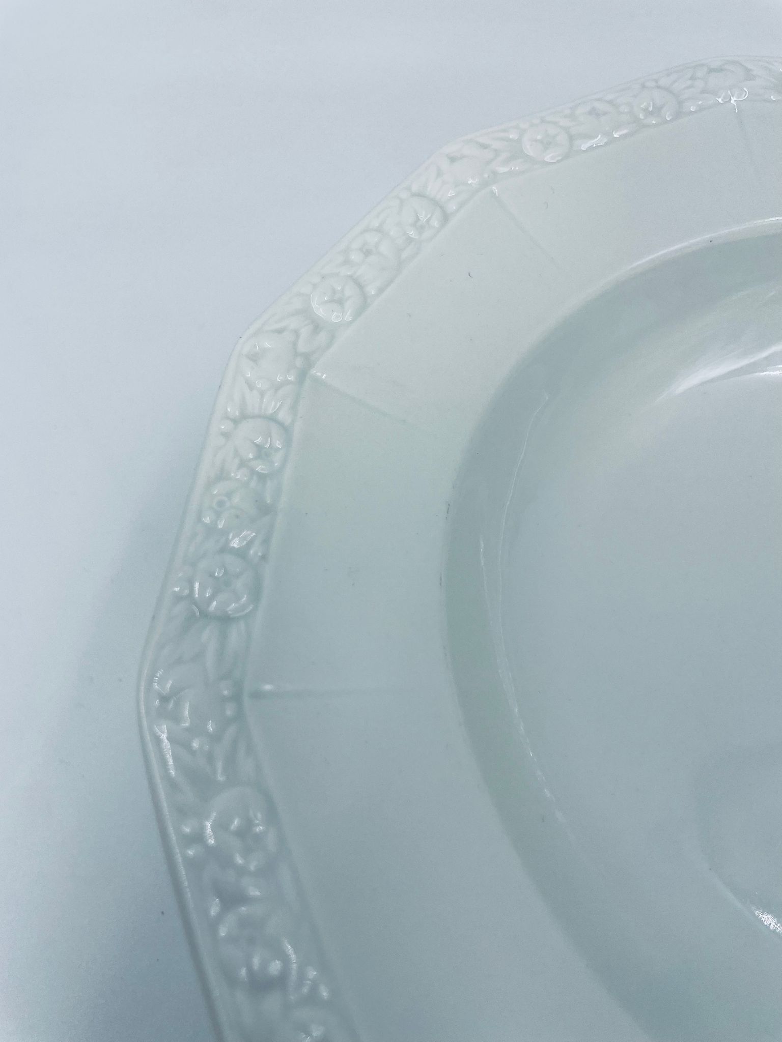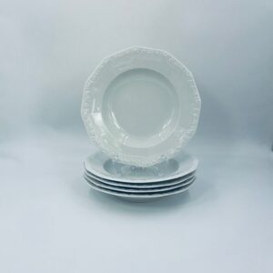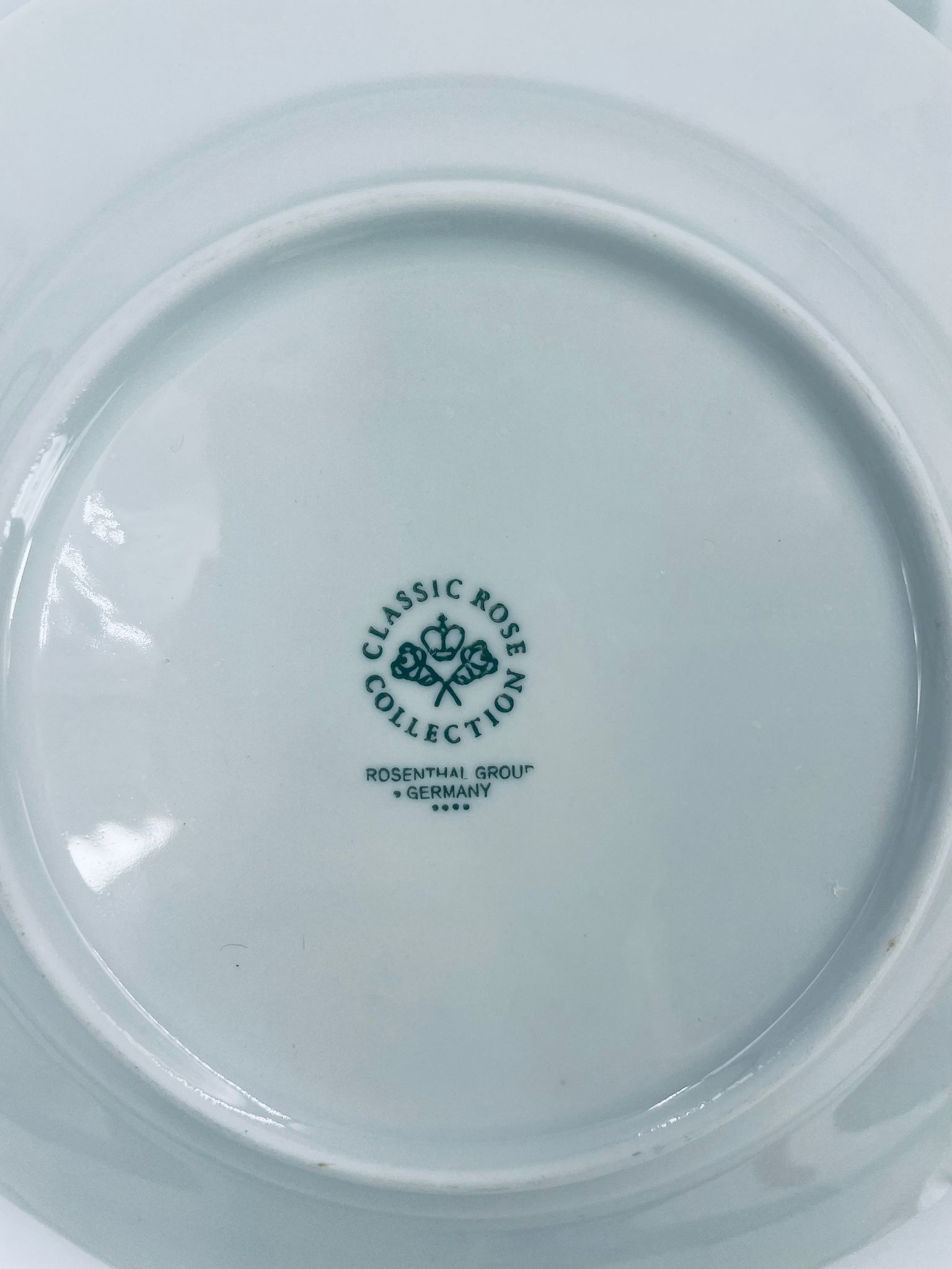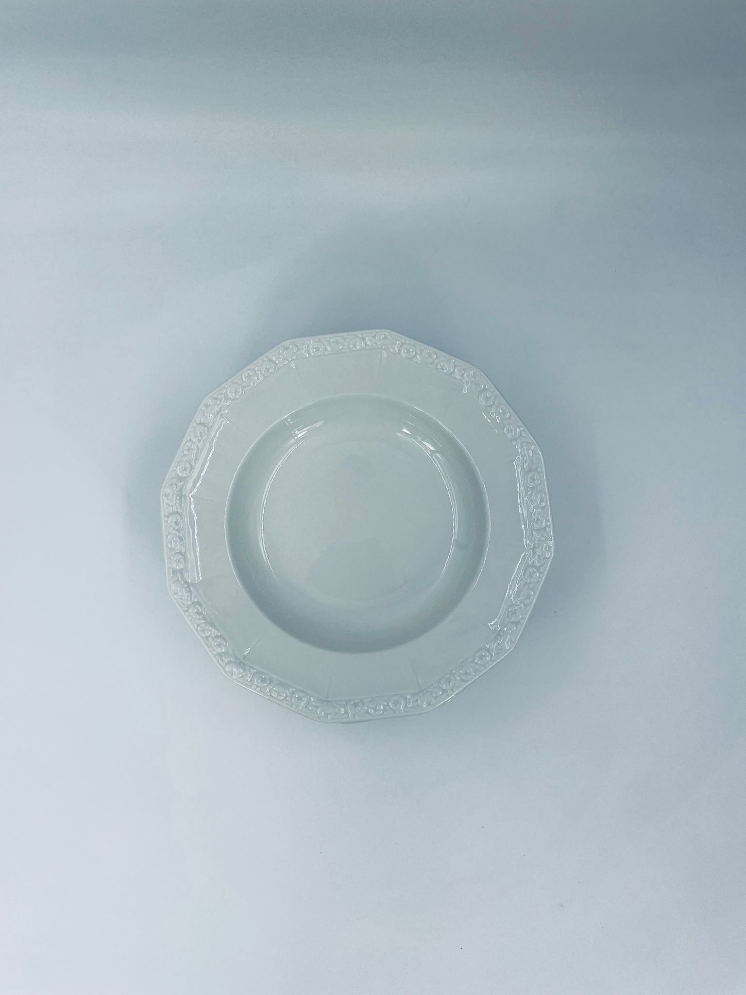 A deep plate from the Rosenthal collection Classic Rose, Maria Weiss, made of high quality white porcelain. The plate has a classic design with an embossed rose motif on the rim. One plate has a small damage to the underside at the rim, hardly visible.
