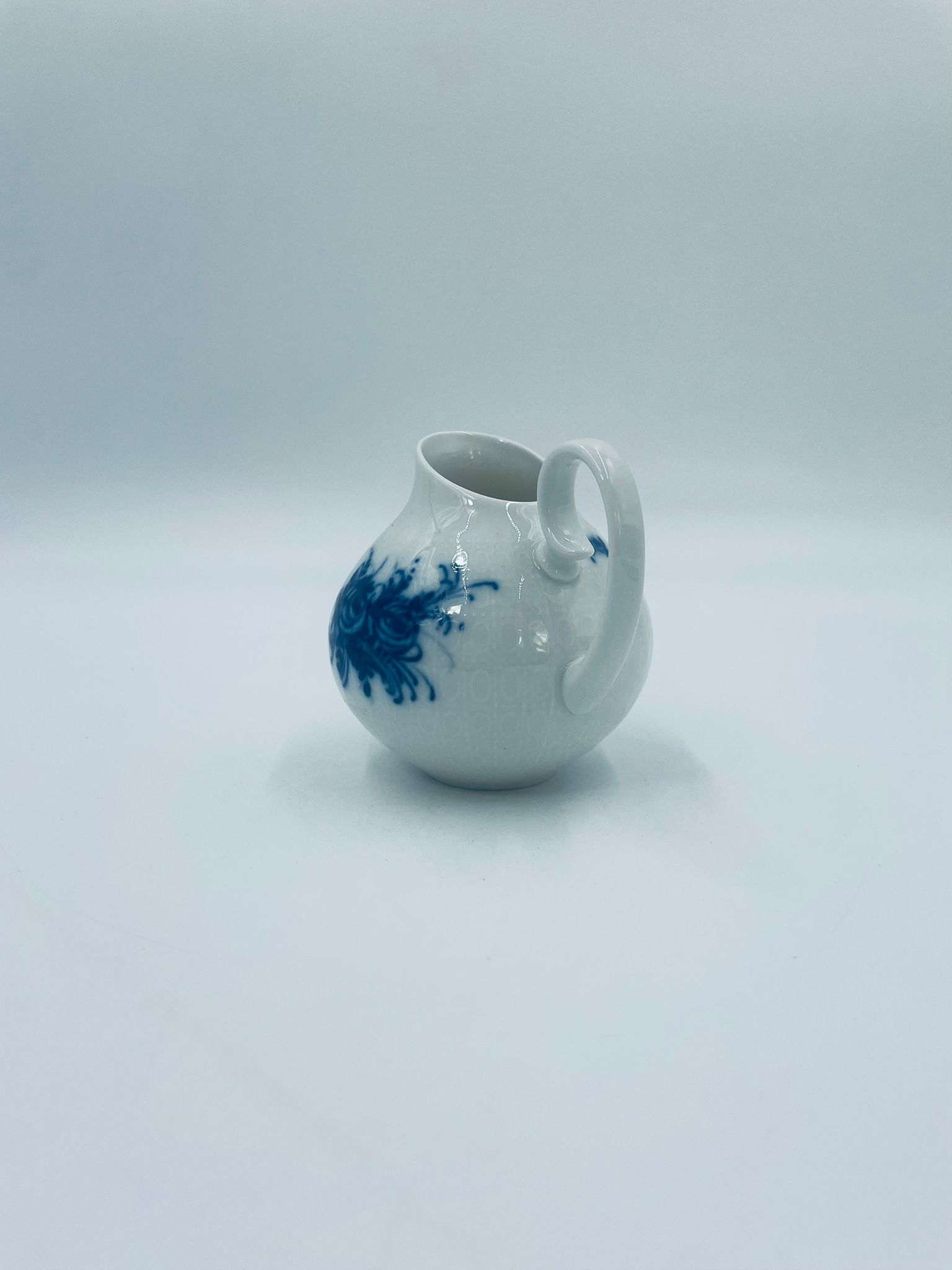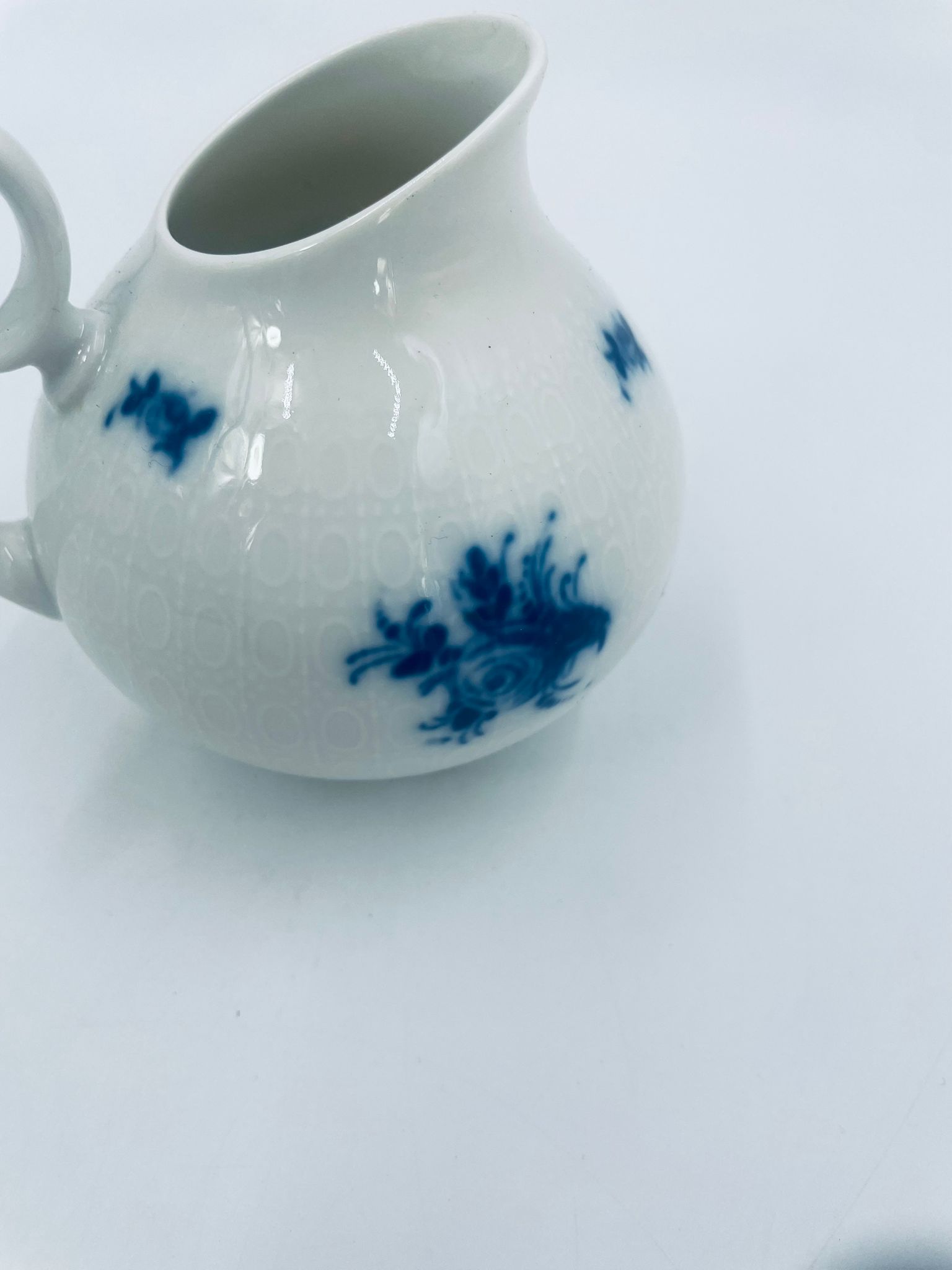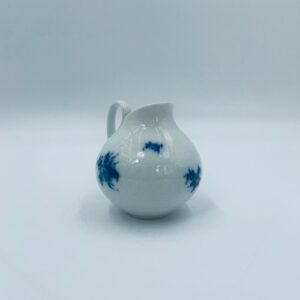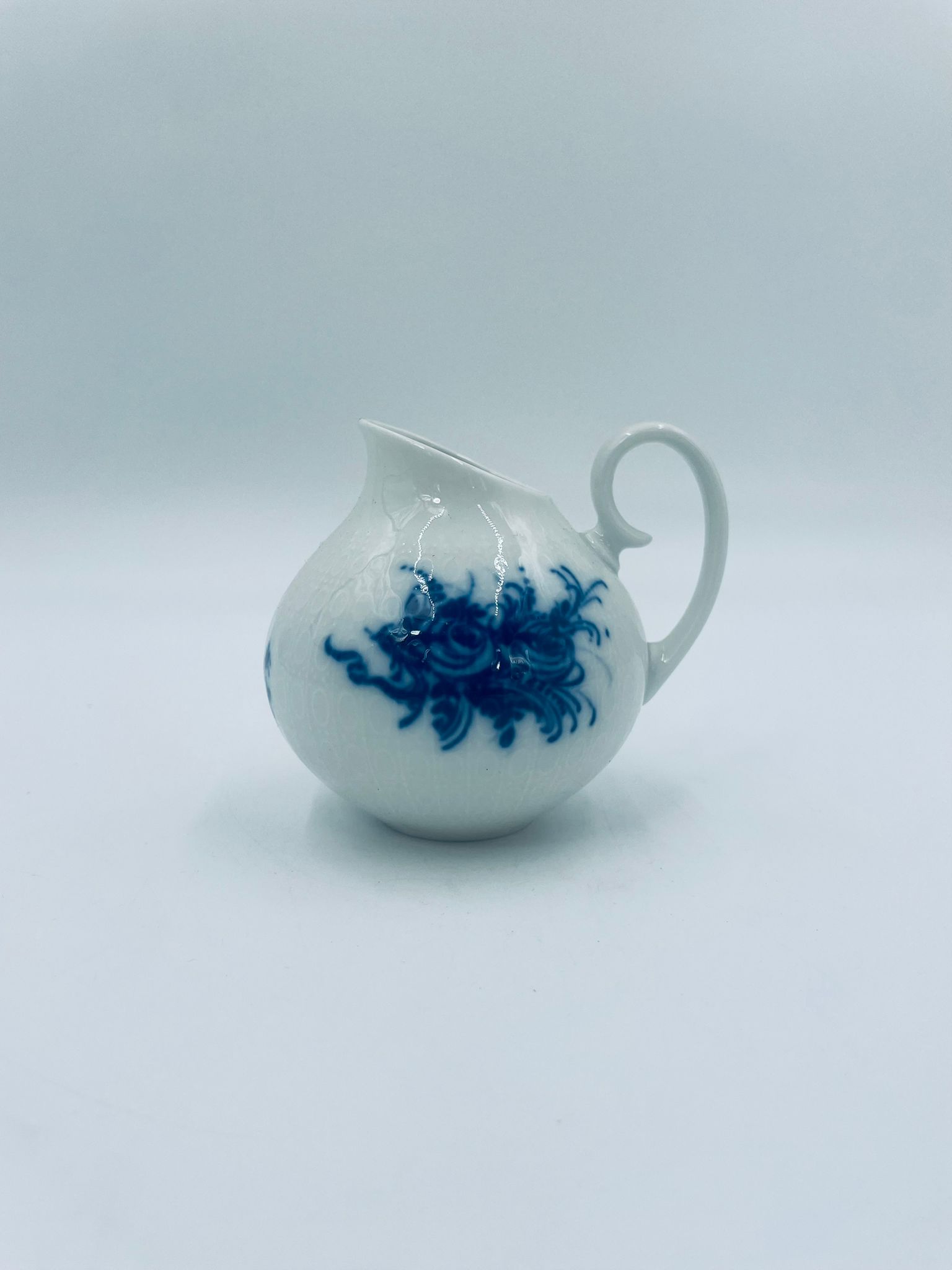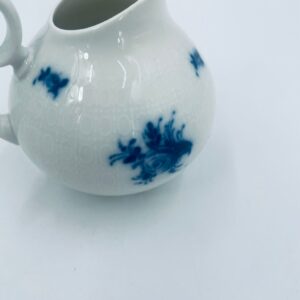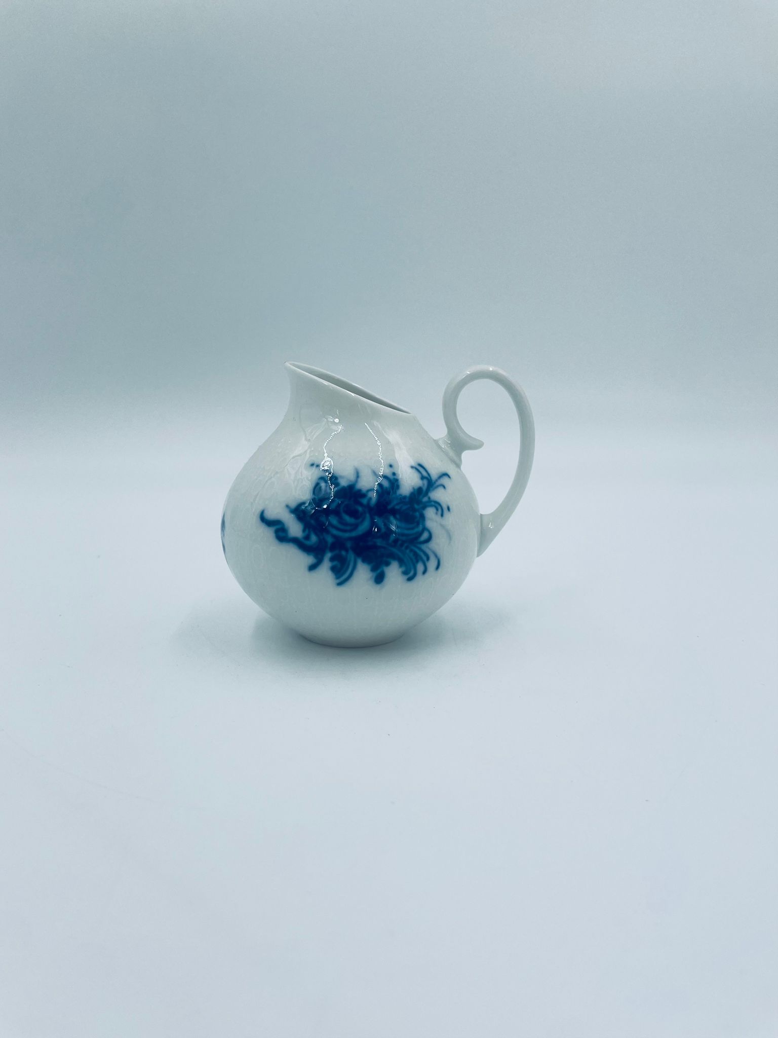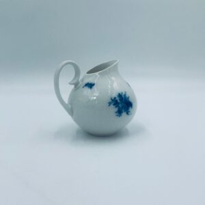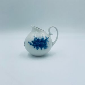 Creamer by the renowned Rosenthal factory, designed by Danish artist Bjorn Wiinblad in the 1960s-70s, made of high-quality white porcelain. An elegant jug, in the Romanze in Blau pattern, characterised by a blue floral motif and a relief pattern.