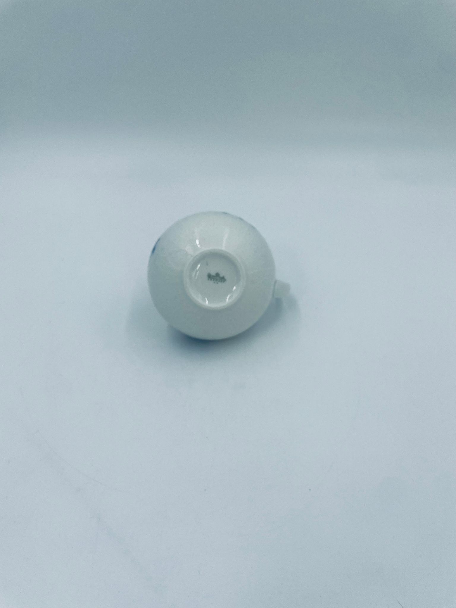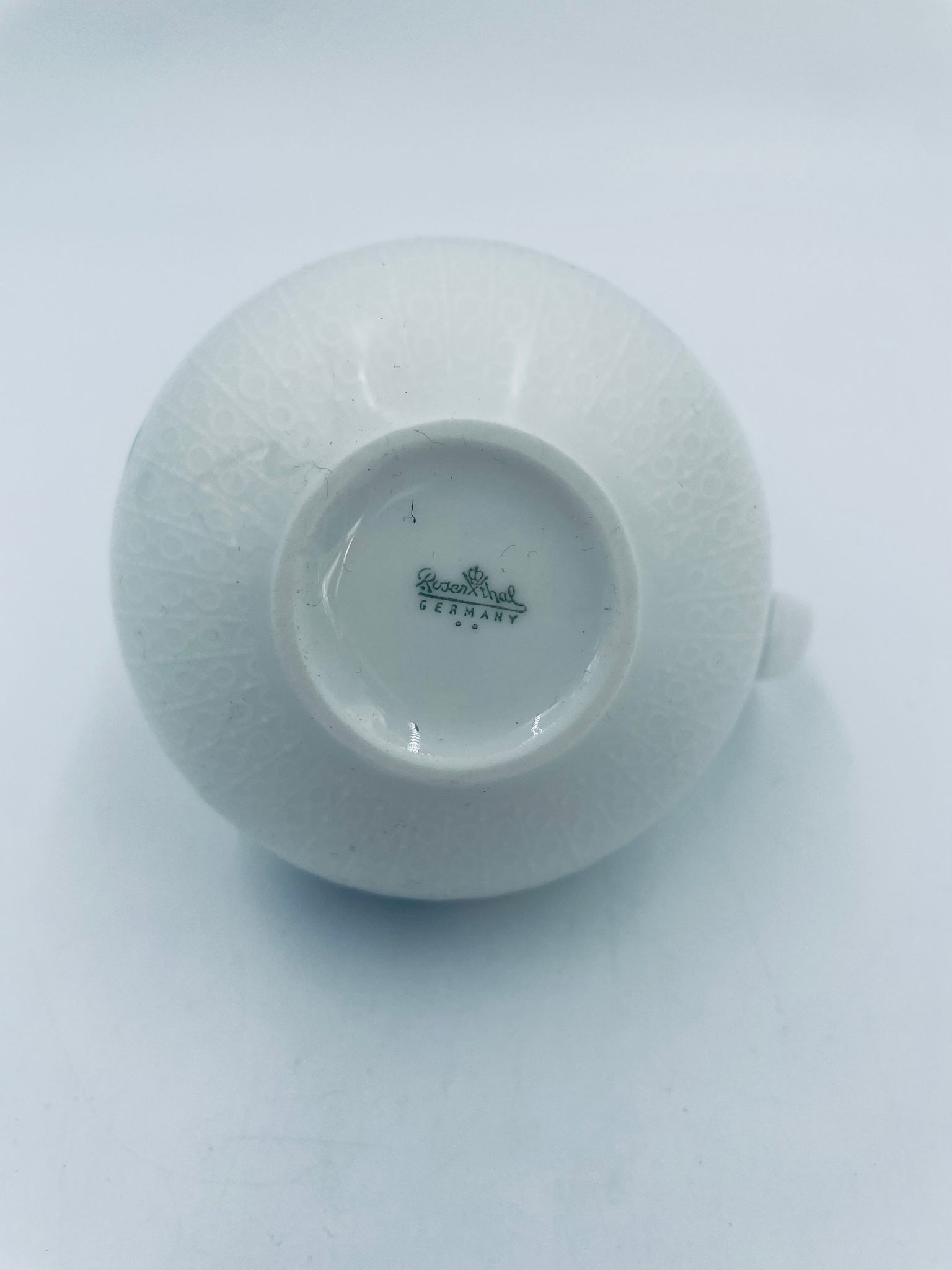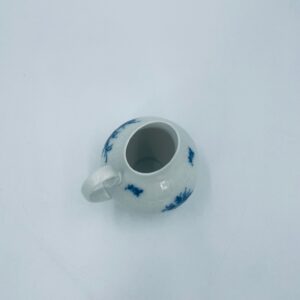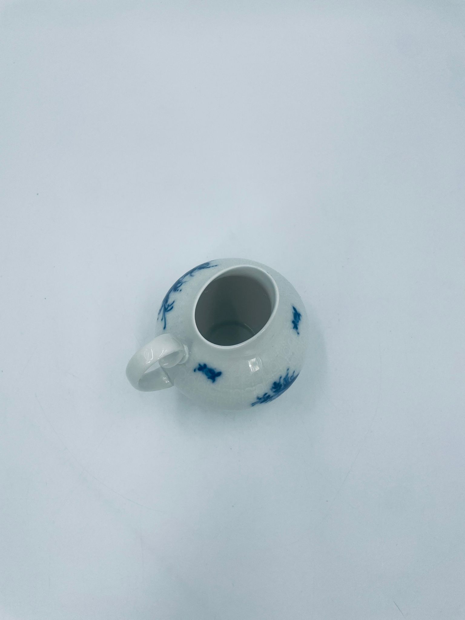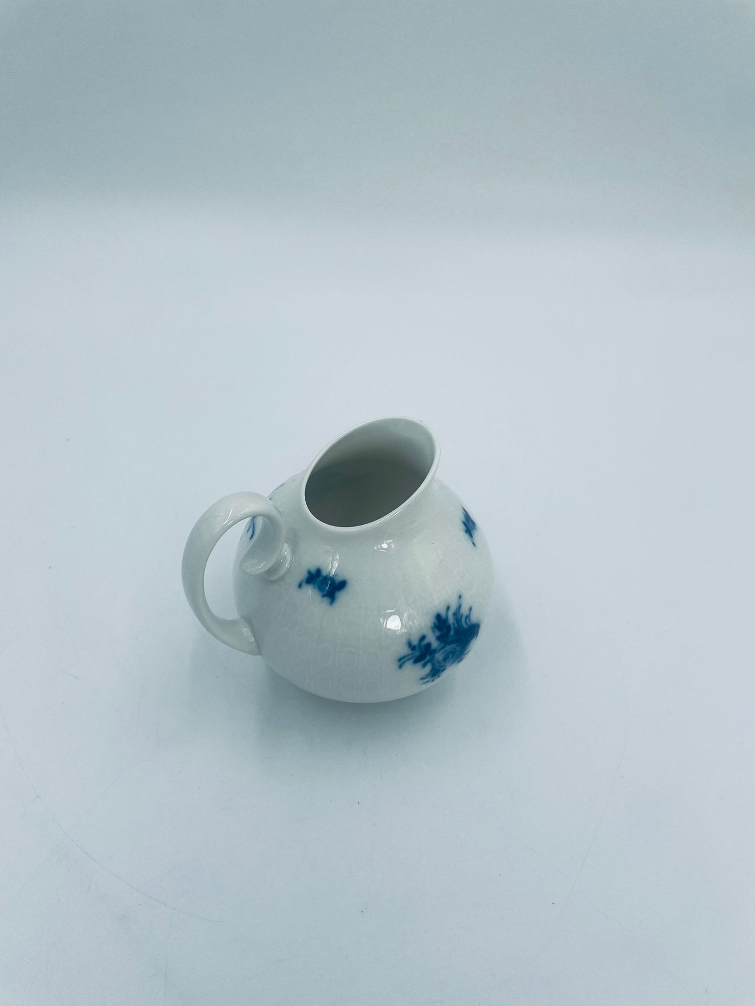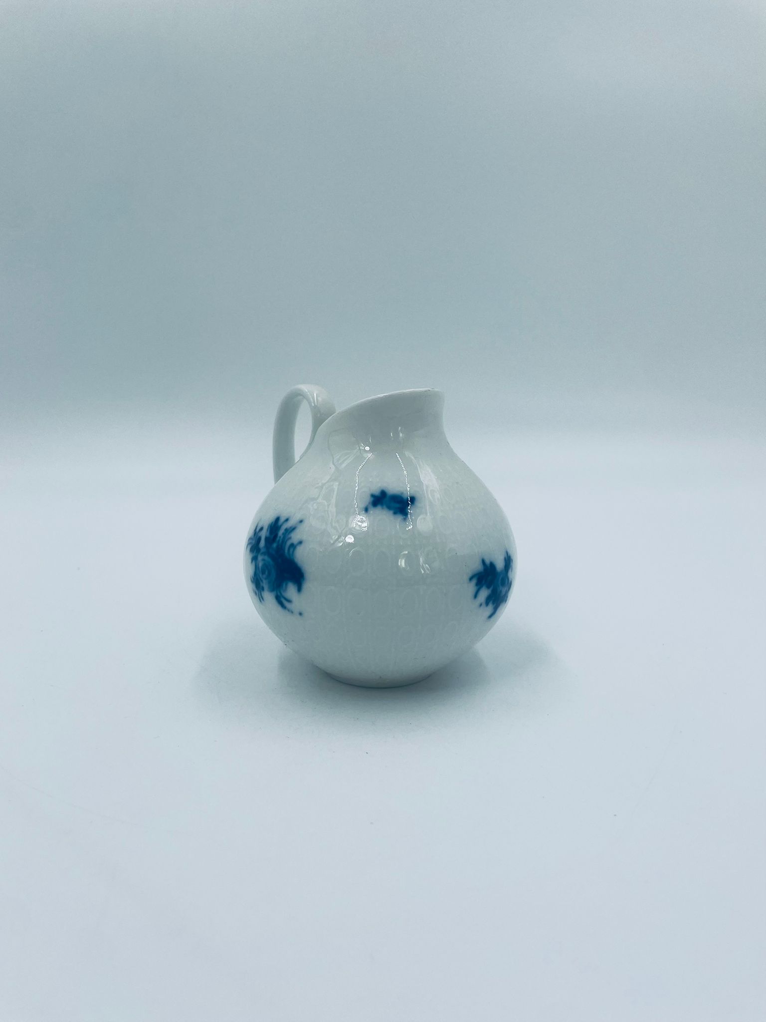 Creamer by the renowned Rosenthal factory, designed by Danish artist Bjorn Wiinblad in the 1960s-70s, made of high-quality white porcelain. An elegant jug, in the Romanze in Blau pattern, characterised by a blue floral motif and a relief pattern.