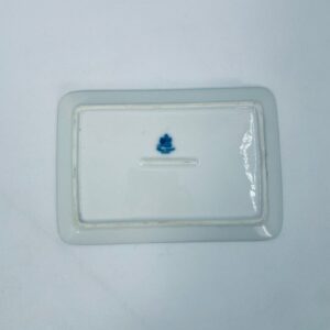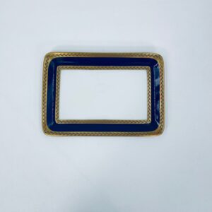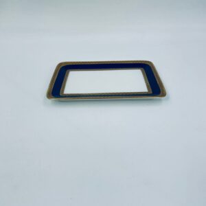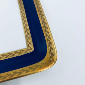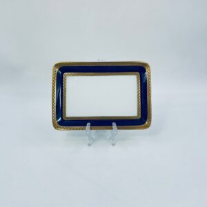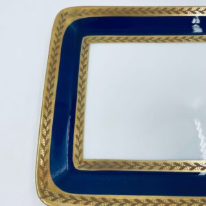 Patera wytwórni Royal Tettau, wykonana z wysokiej jakości białej porcelany. Patera podłużna, ozdobiona jest szerokim, kobaltowo-niebieskim pasem, wykończona złoceniem ze wzorem liści.