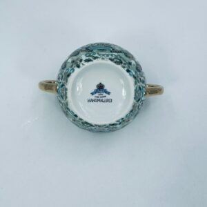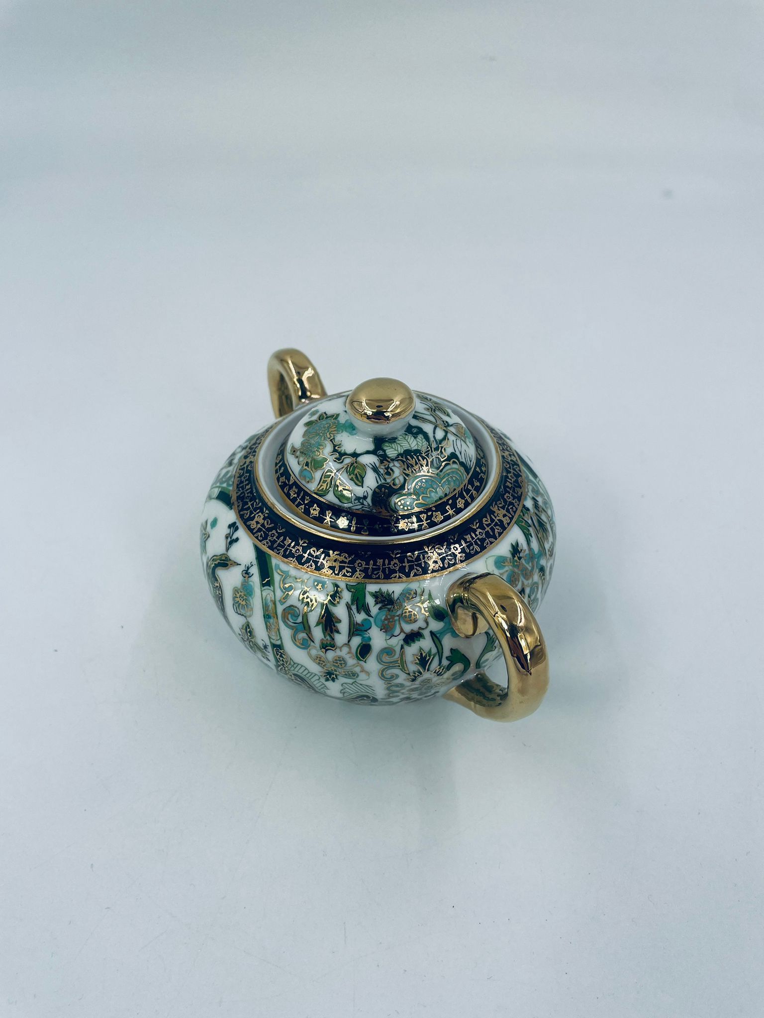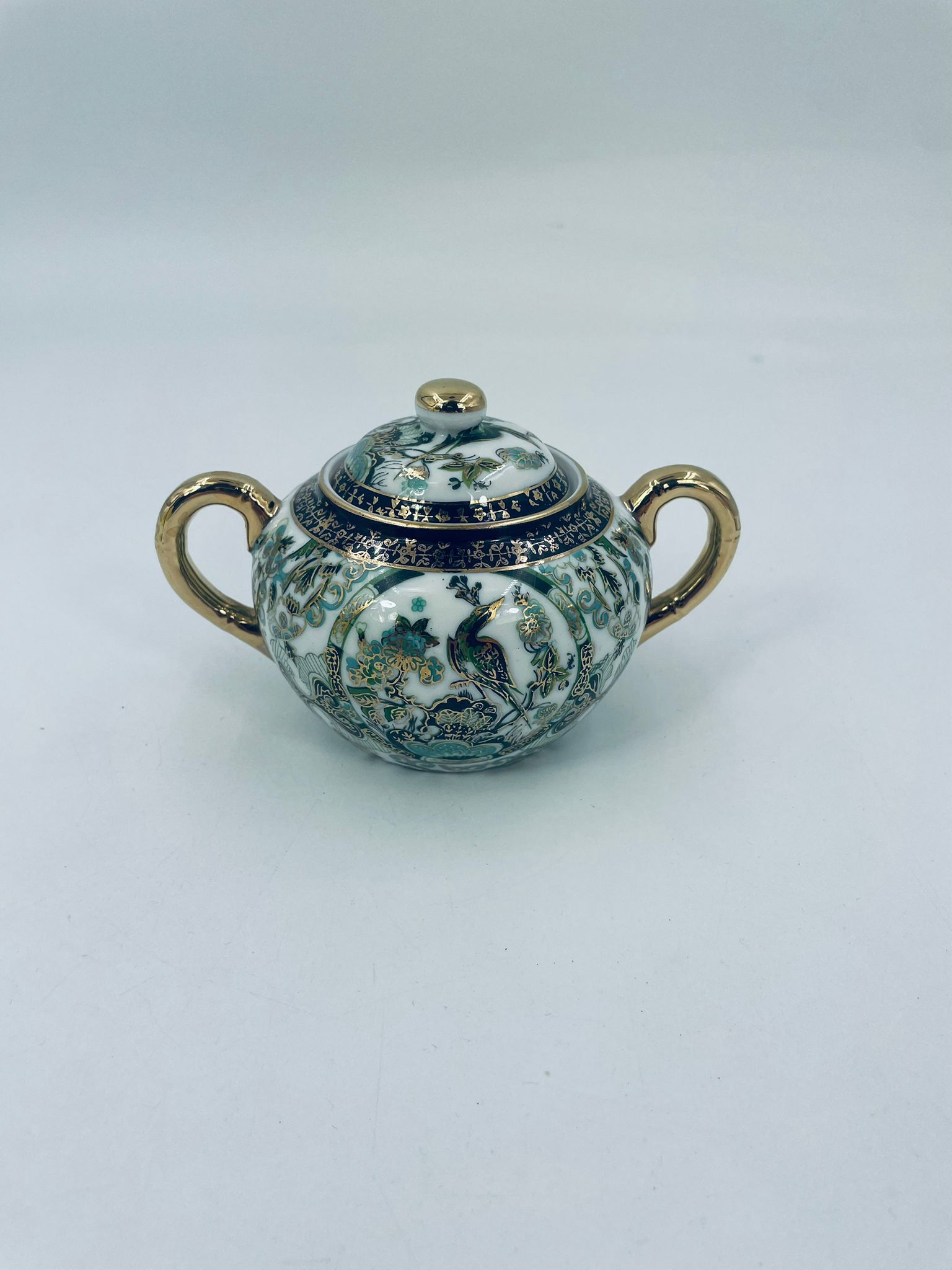 Saji Japan Fine China sugar bowl. Green porcelain with gold stenciling. The motif on the sugar bowl is a circular medallion with a peacock, surrounded by floral decoration and decorative motifs. Hand-painted porcelain.