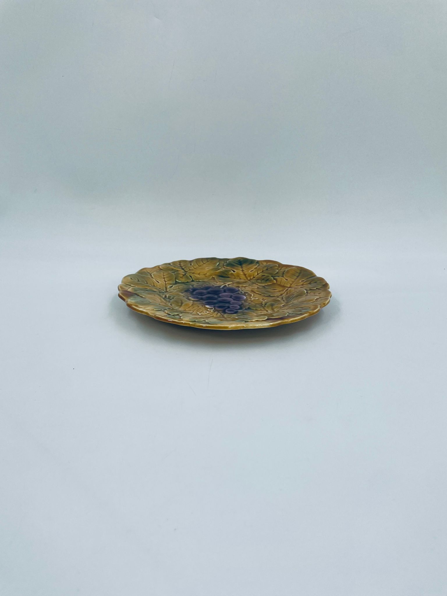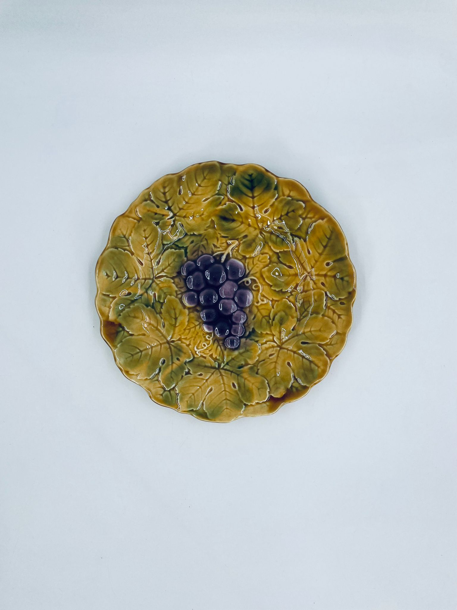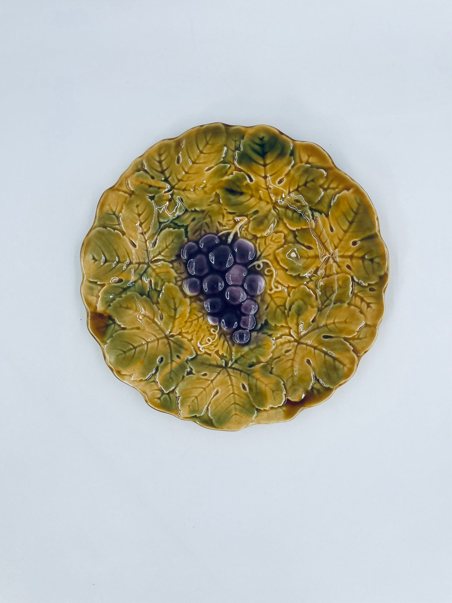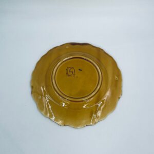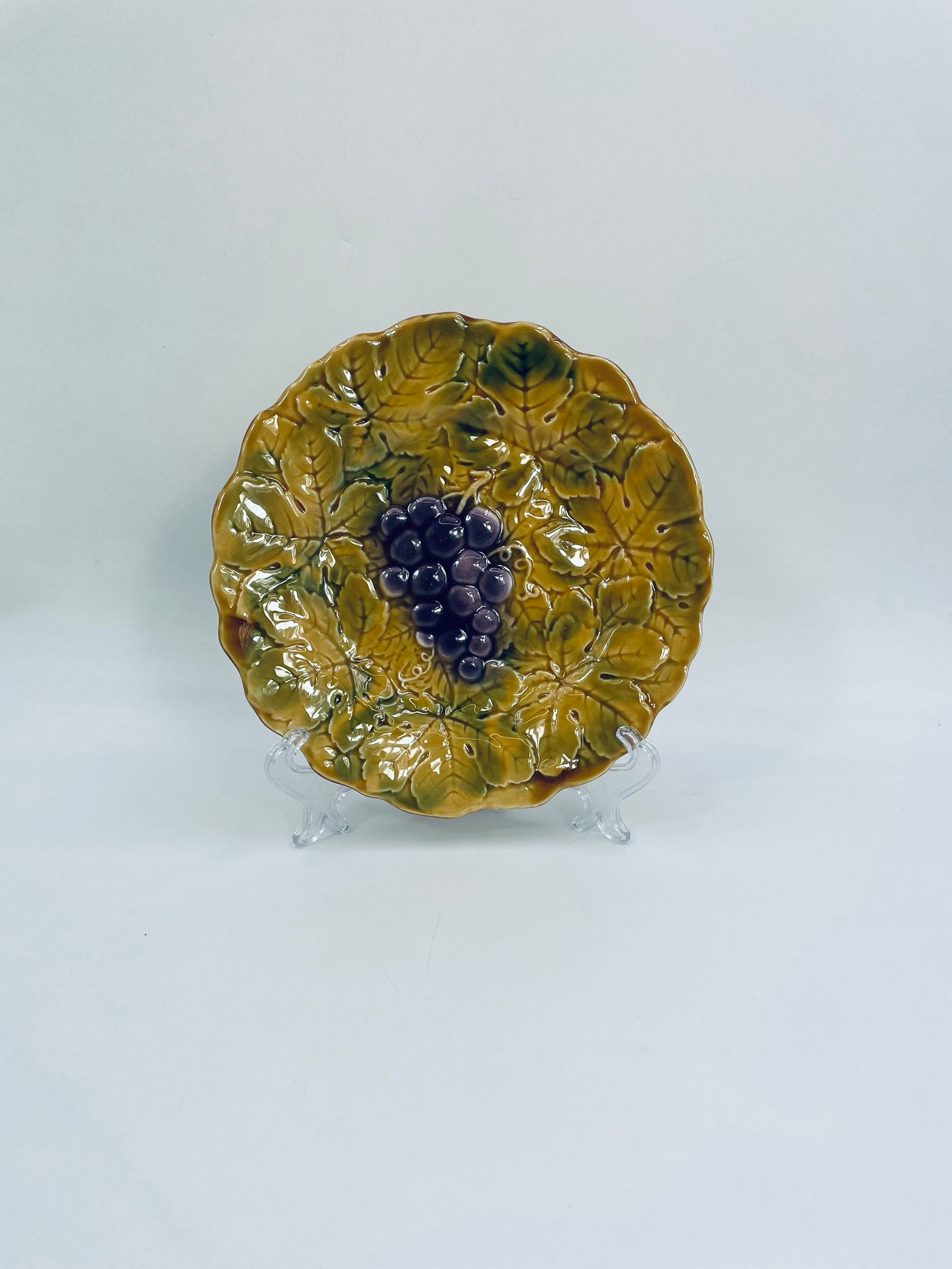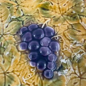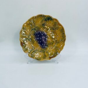 Talerz dekoracyjny francuskiej wytwórni Sarreguemines, wykonany z fajansu w kolorze musztardowym. Talerz dekorowany reliefowym wzorem winogron otoczonych liśćmi, wykończony falistym obrzeżem. Posiada pęknięcie szkliwa.