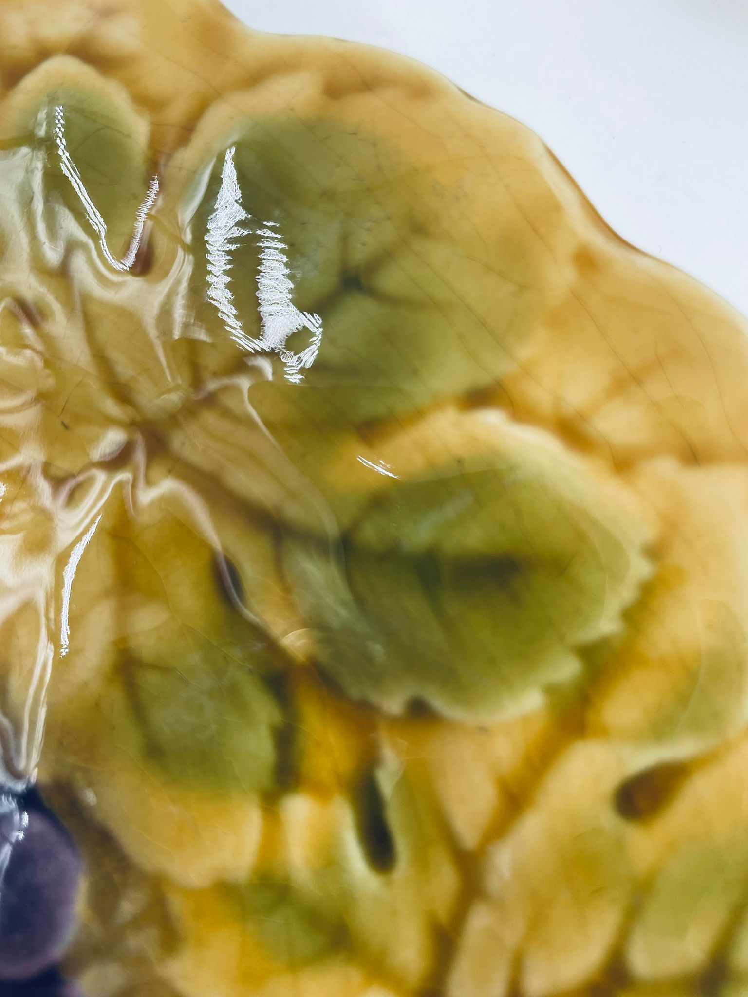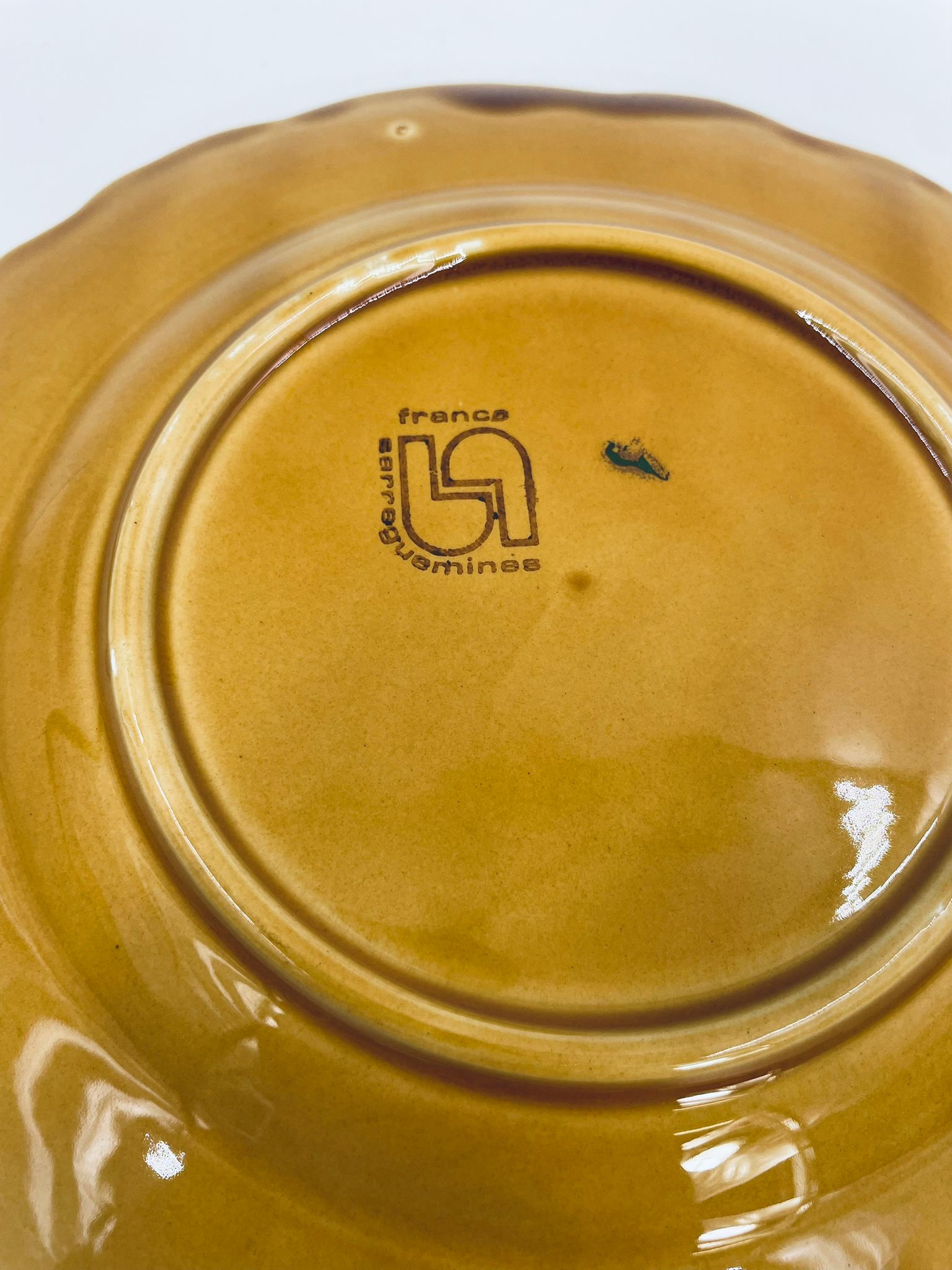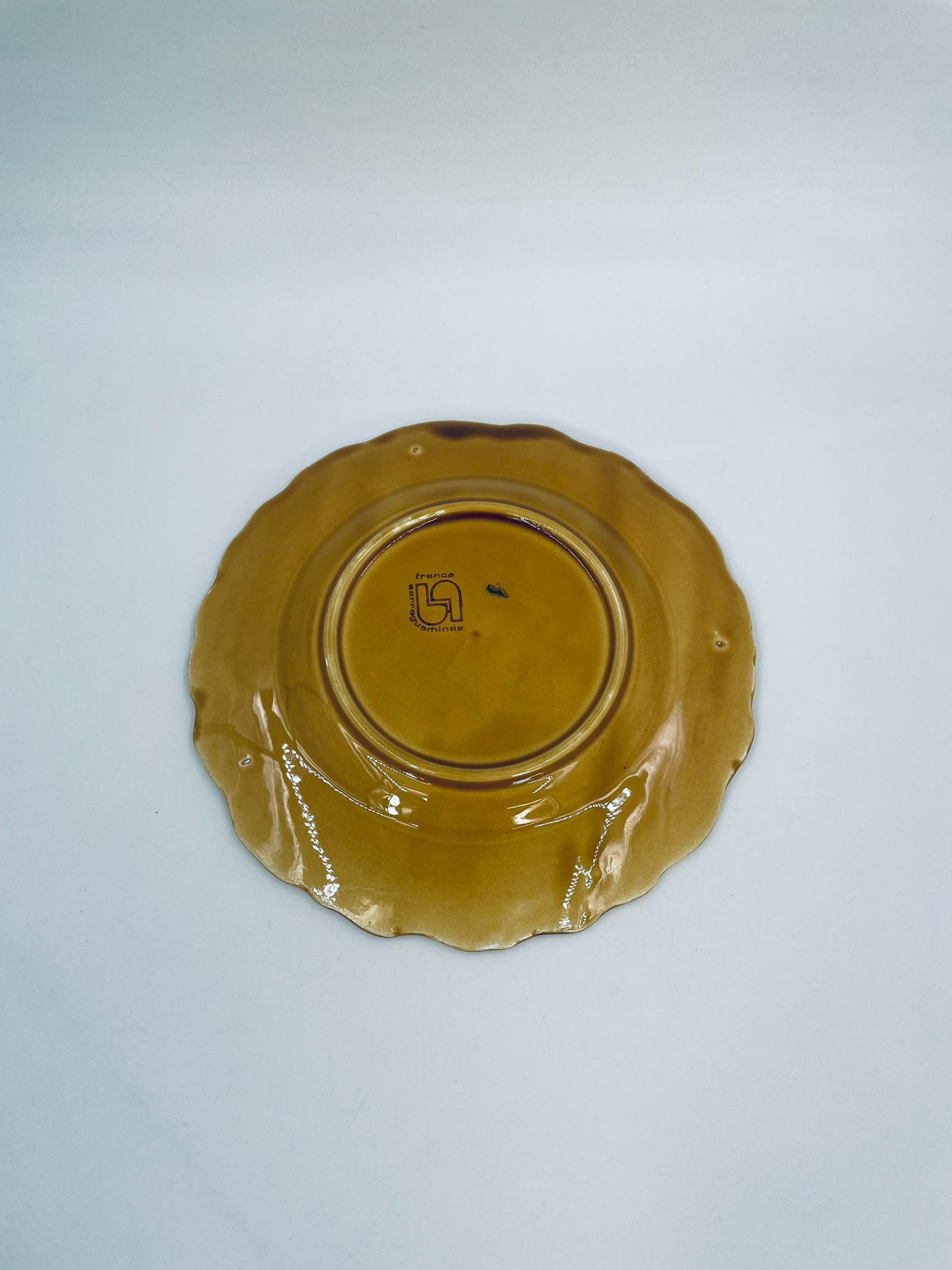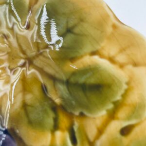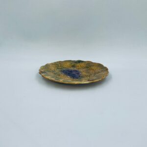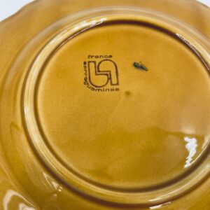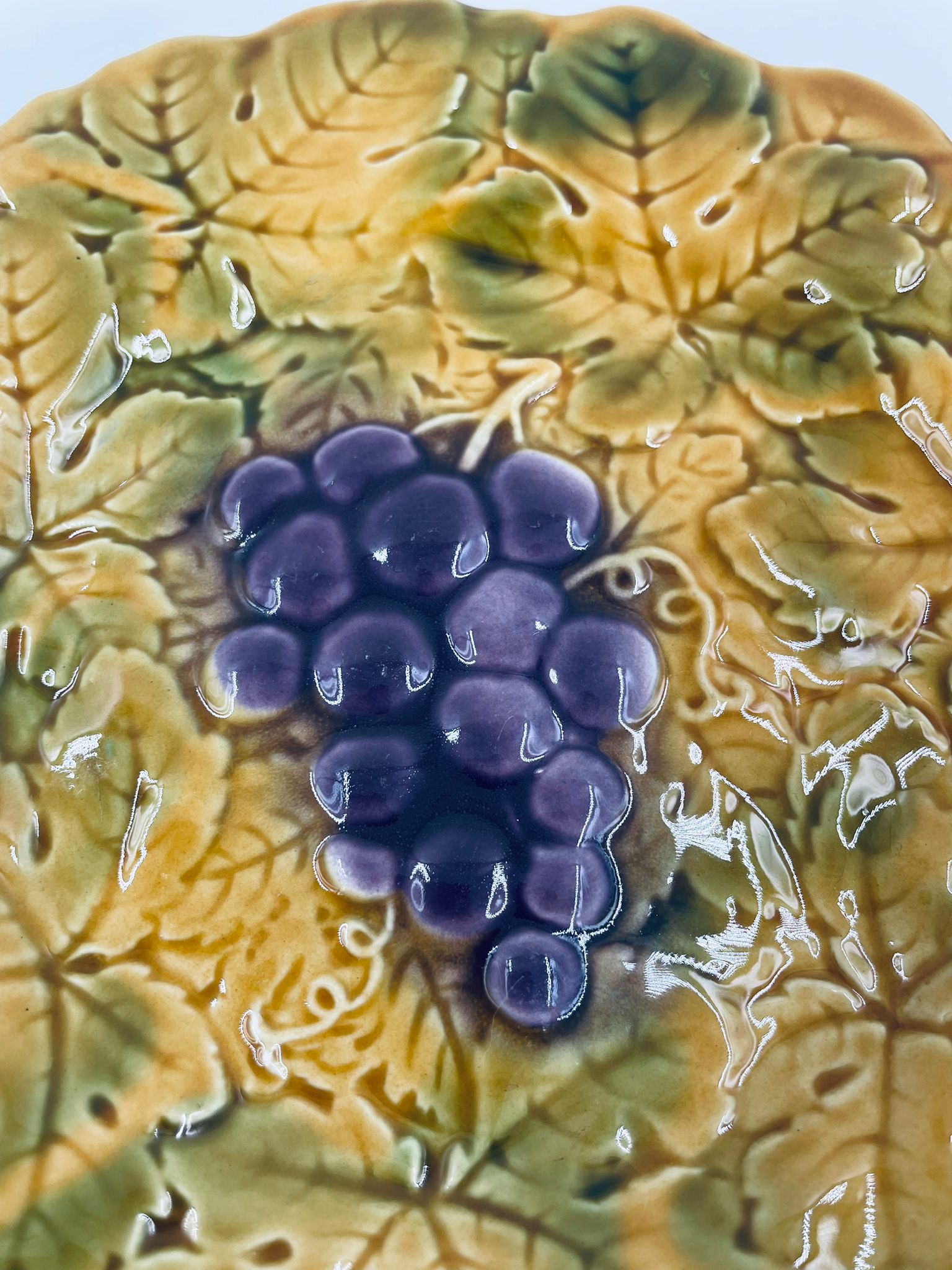 Talerz dekoracyjny francuskiej wytwórni Sarreguemines, wykonany z fajansu w kolorze musztardowym. Talerz dekorowany reliefowym wzorem winogron otoczonych liśćmi, wykończony falistym obrzeżem. Posiada pęknięcie szkliwa.