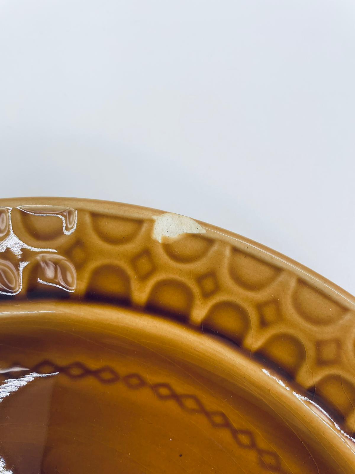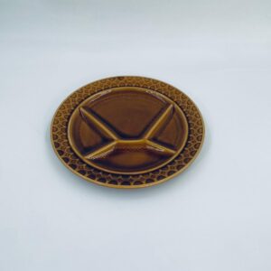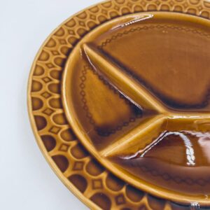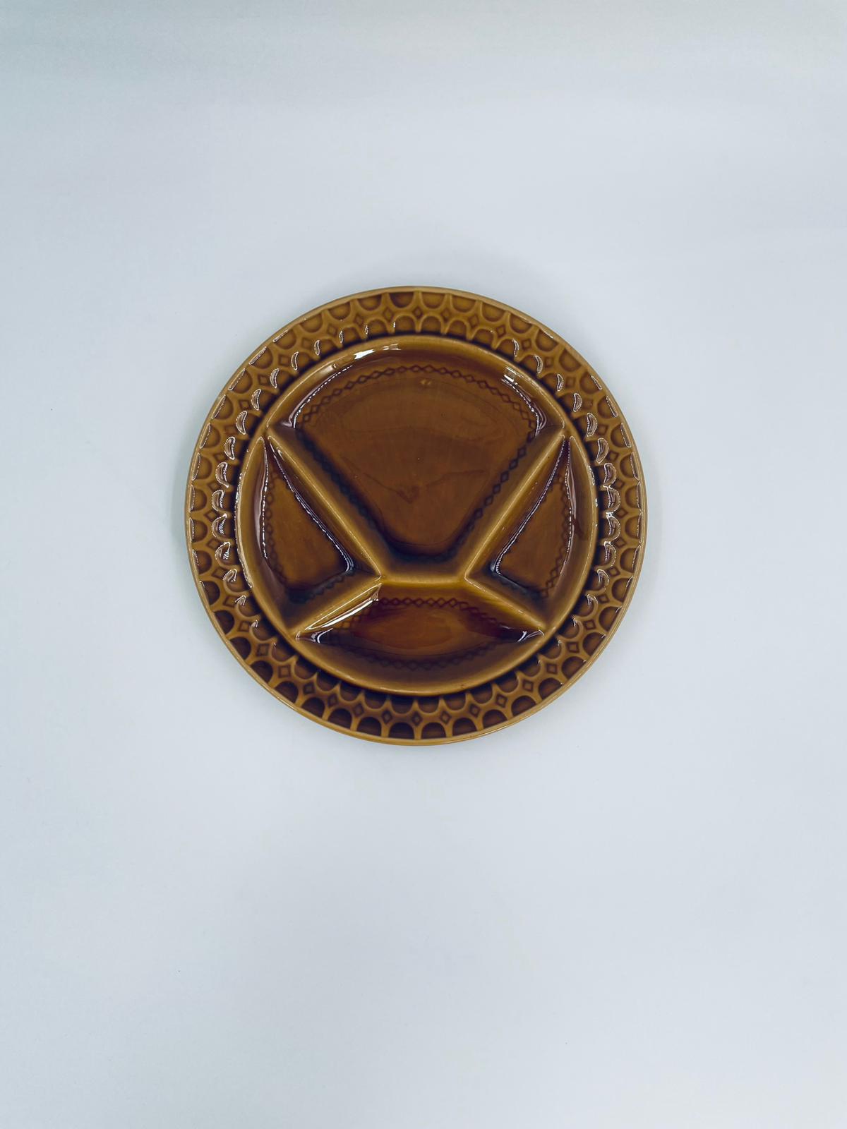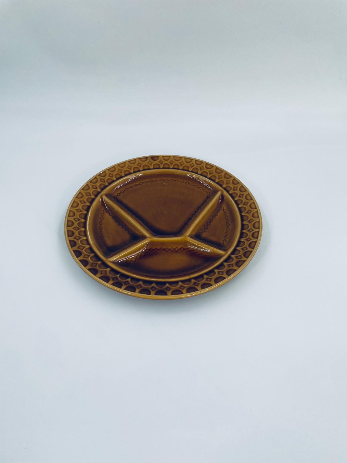 A plate from the French manufacturer Sarreguemines, made of majolica (faience) ceramic. It is characterised by a shiny, caramel shade with patterns on the rim. The plate is designed with divisions that are ideal for serving fondue, raclette and various other appetisers. It has a crack in the glaze and a chip.