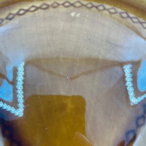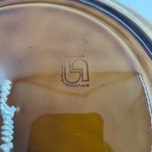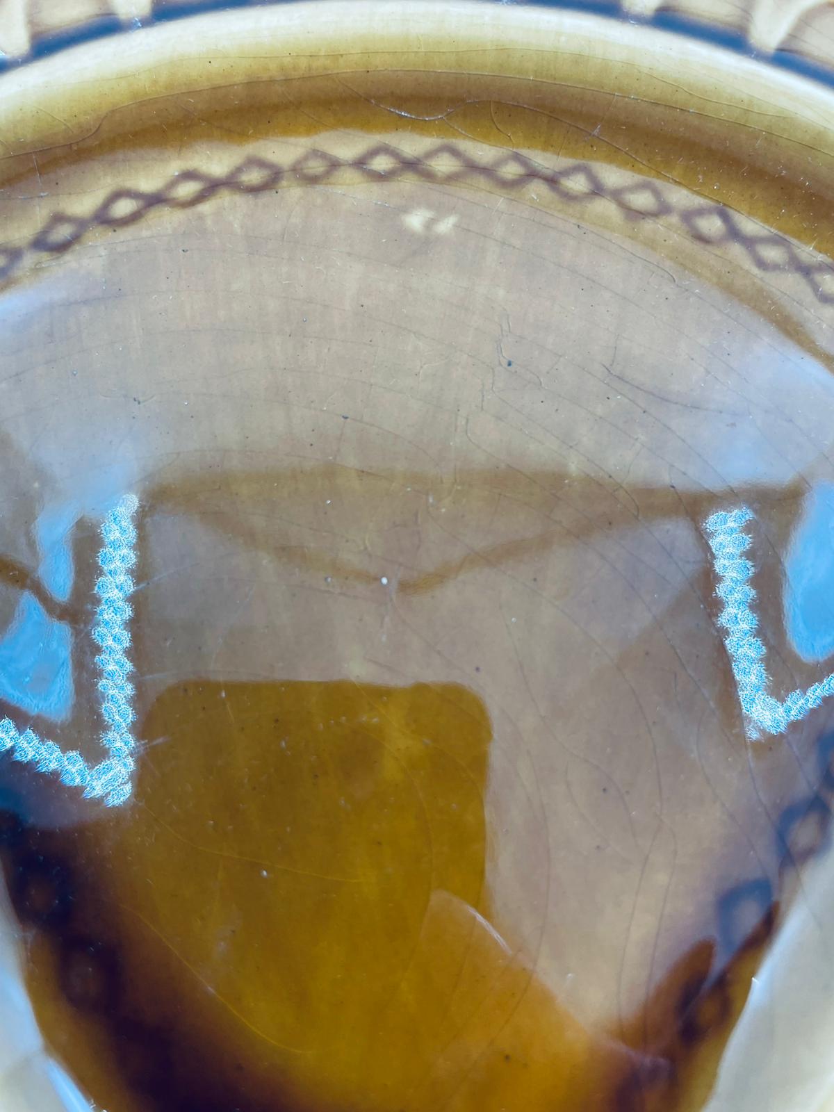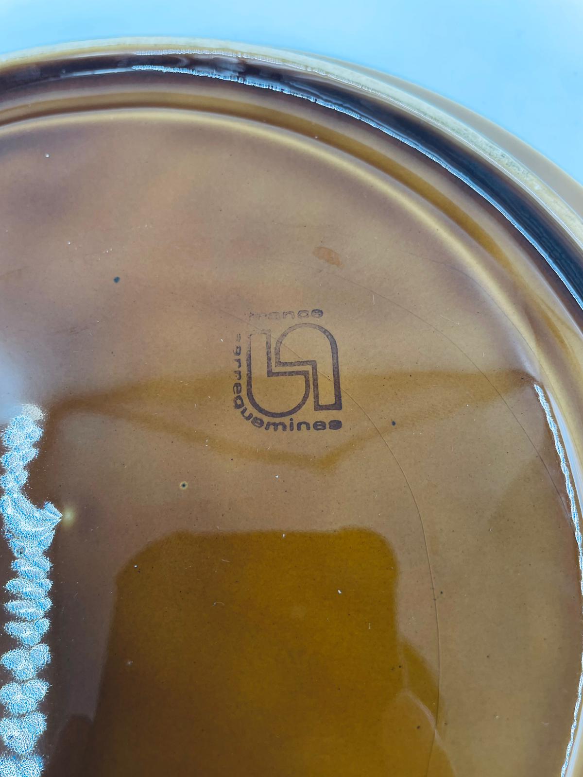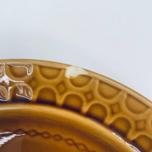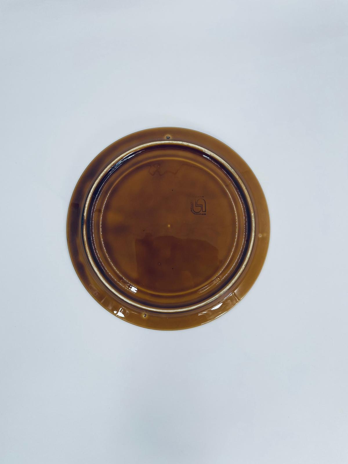 A plate from the French manufacturer Sarreguemines, made of majolica (faience) ceramic. It is characterised by a shiny, caramel shade with patterns on the rim. The plate is designed with divisions that are ideal for serving fondue, raclette and various other appetisers. It has a crack in the glaze and a chip.
