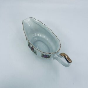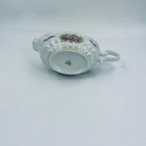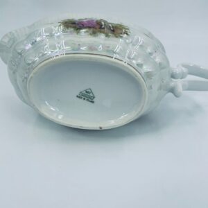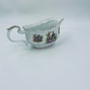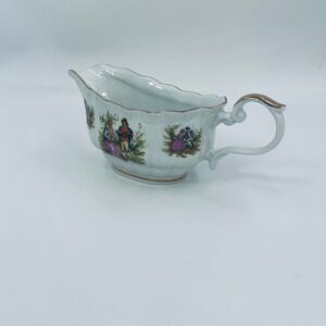 A saucepan with handle by the Polish manufacturer Chodzież, made of high-quality white porcelain with a glossy, multicoloured glossy finish, with a pattern depicting a love scene with a couple in love.