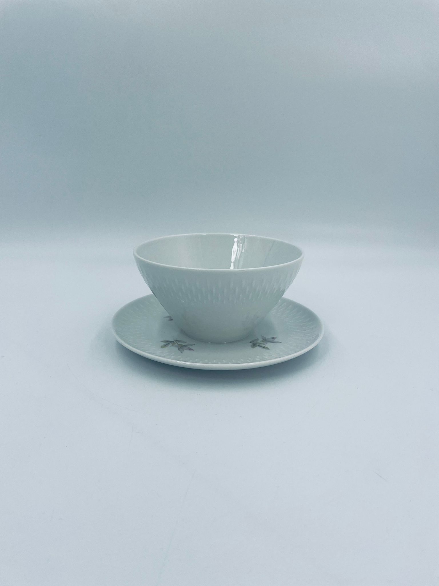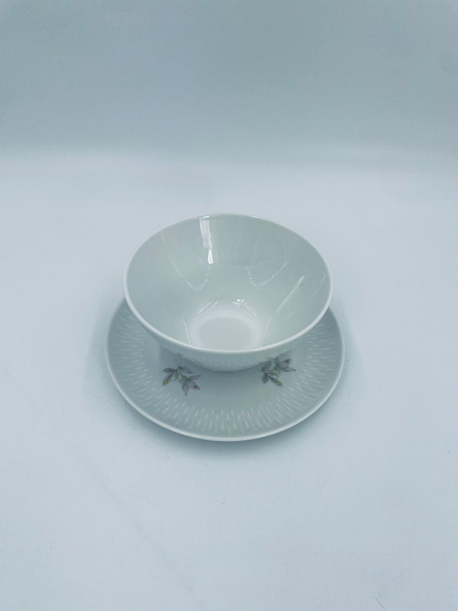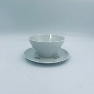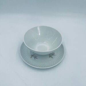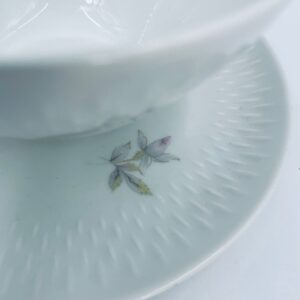 Saucepan with saucer by Edelstein Bavaria, made of high-quality white porcelain. The saucer is decorated with a floral motif and a relief pattern in the shape of tears on the rim.