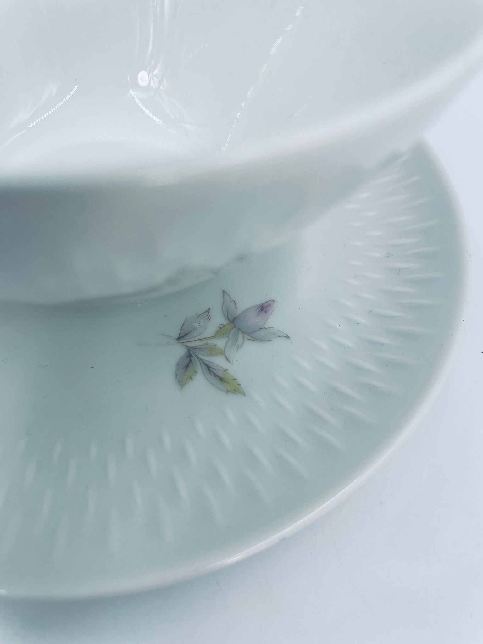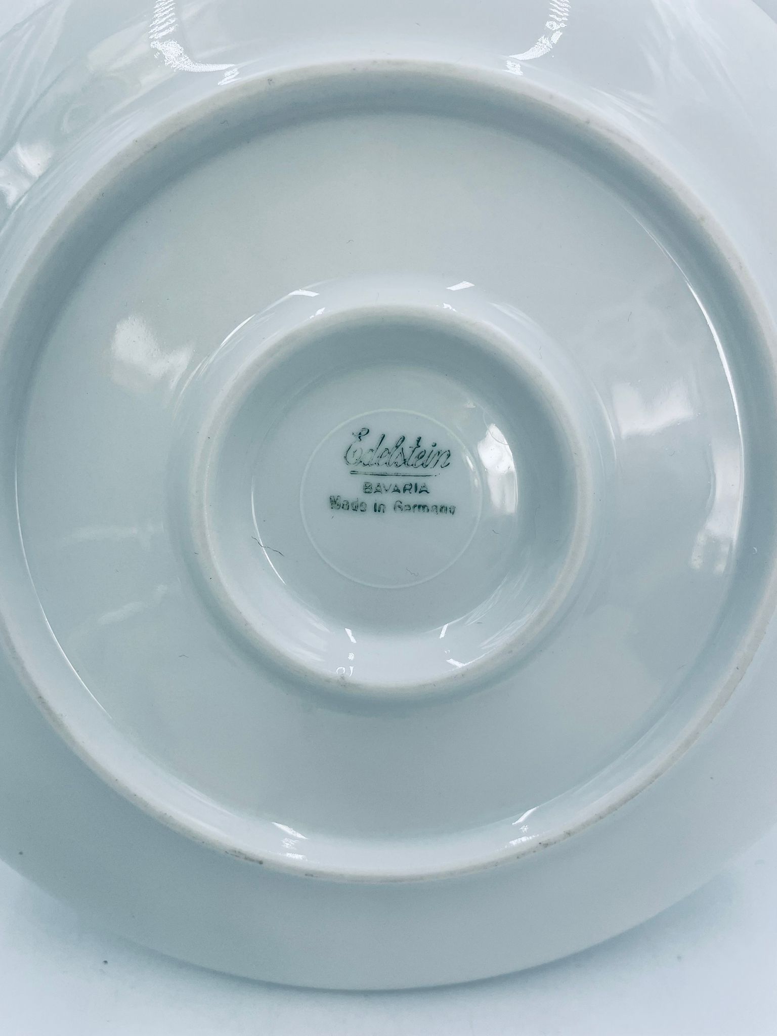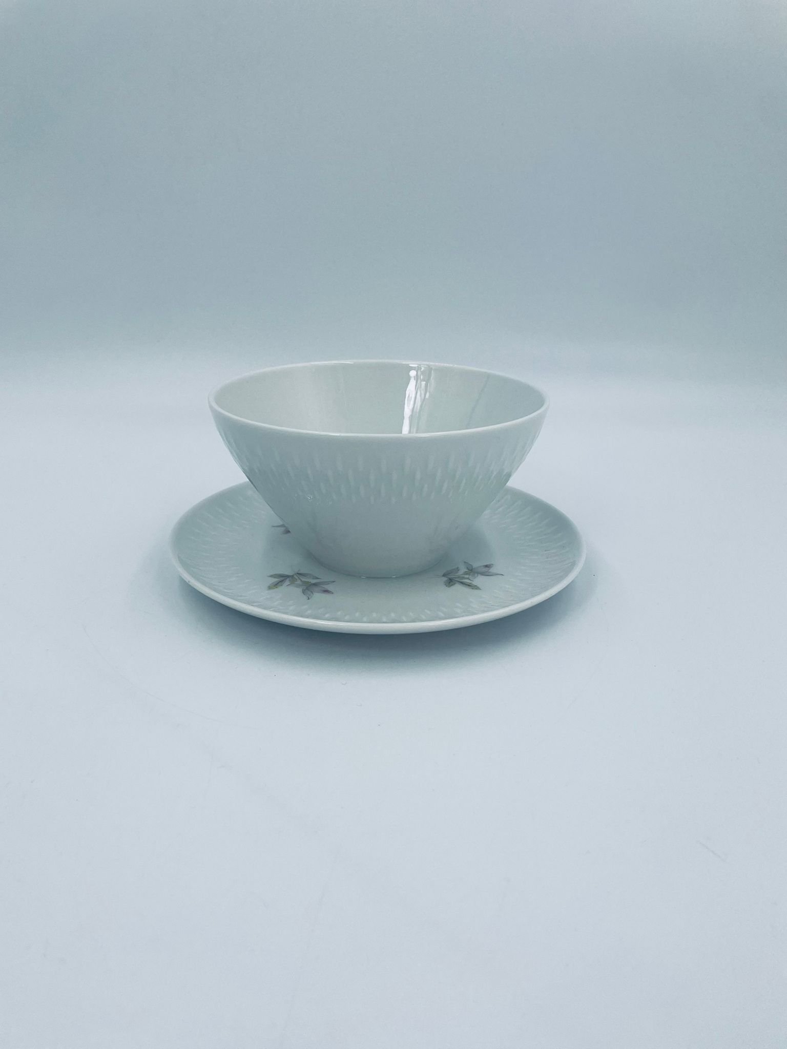 Saucepan with saucer by Edelstein Bavaria, made of high-quality white porcelain. The saucer is decorated with a floral motif and a relief pattern in the shape of tears on the rim.