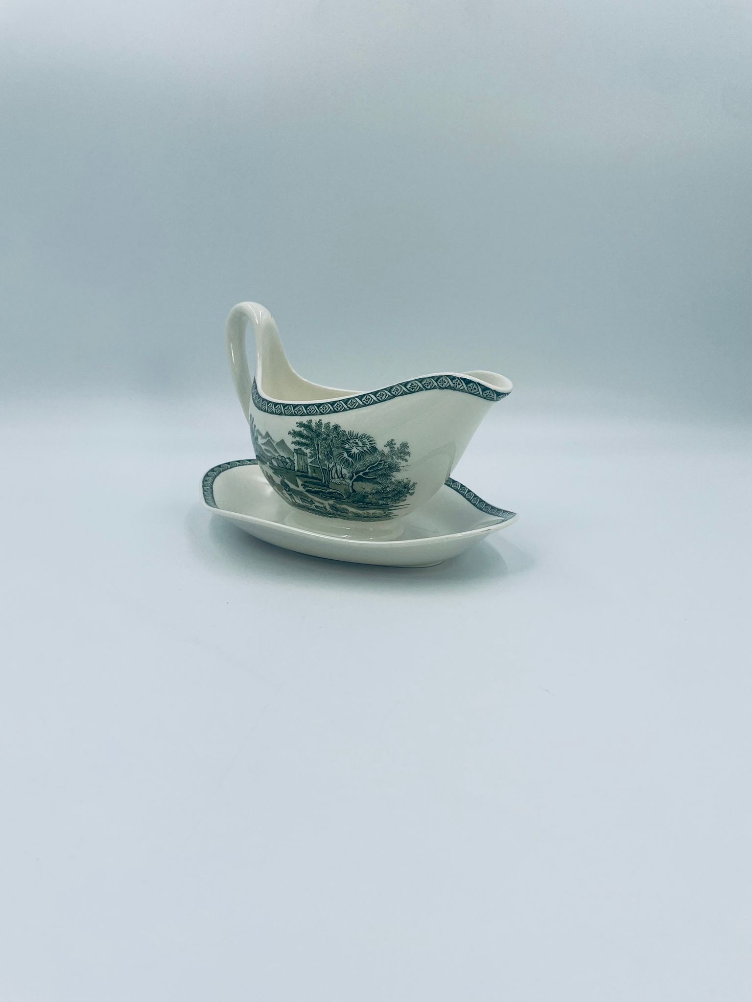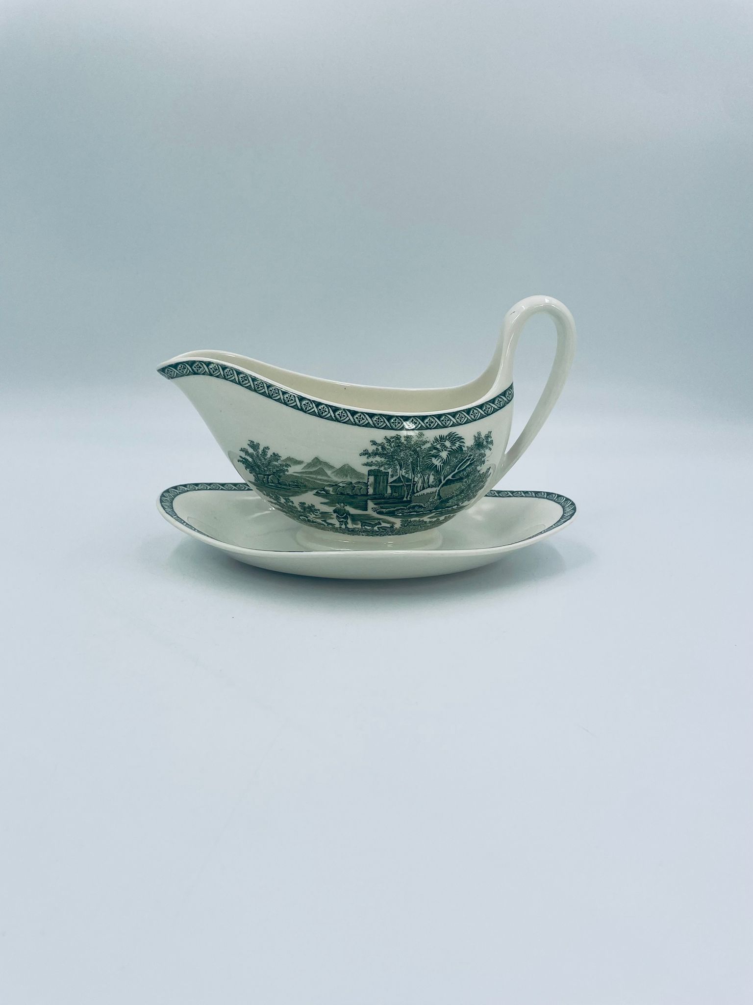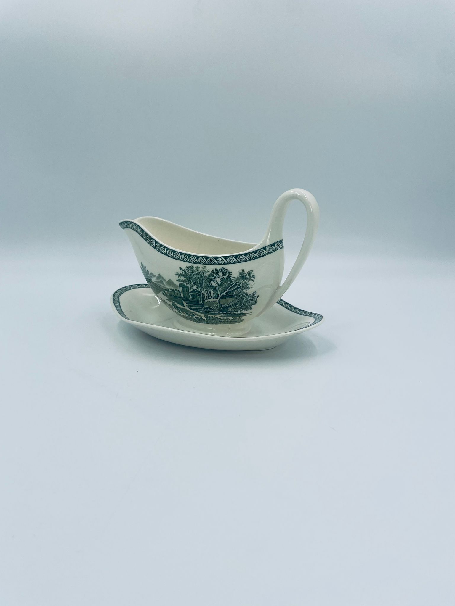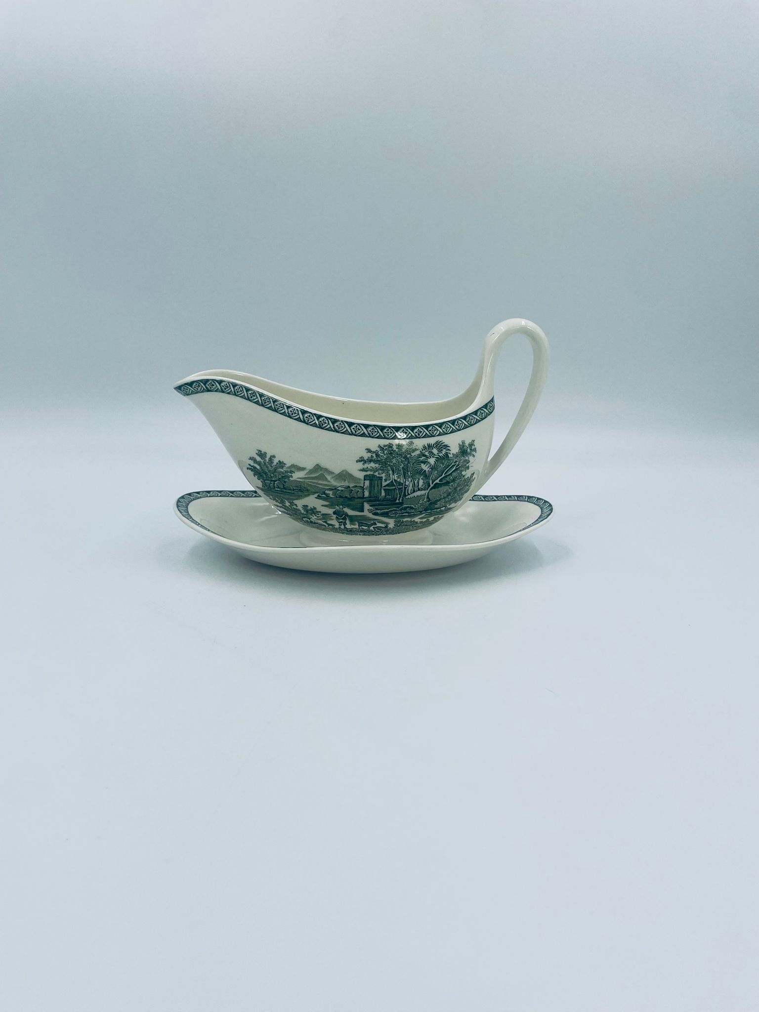 A saucepan with saucer by British label Wedgwood of Etriuria & Barlaston from the 1960s Lugano series, made from high quality porcelain in ecru. The saucer features green decoration depicting idyllic landscapes and architecture, finished with a green garland on the rim. It has a crack in the glaze.