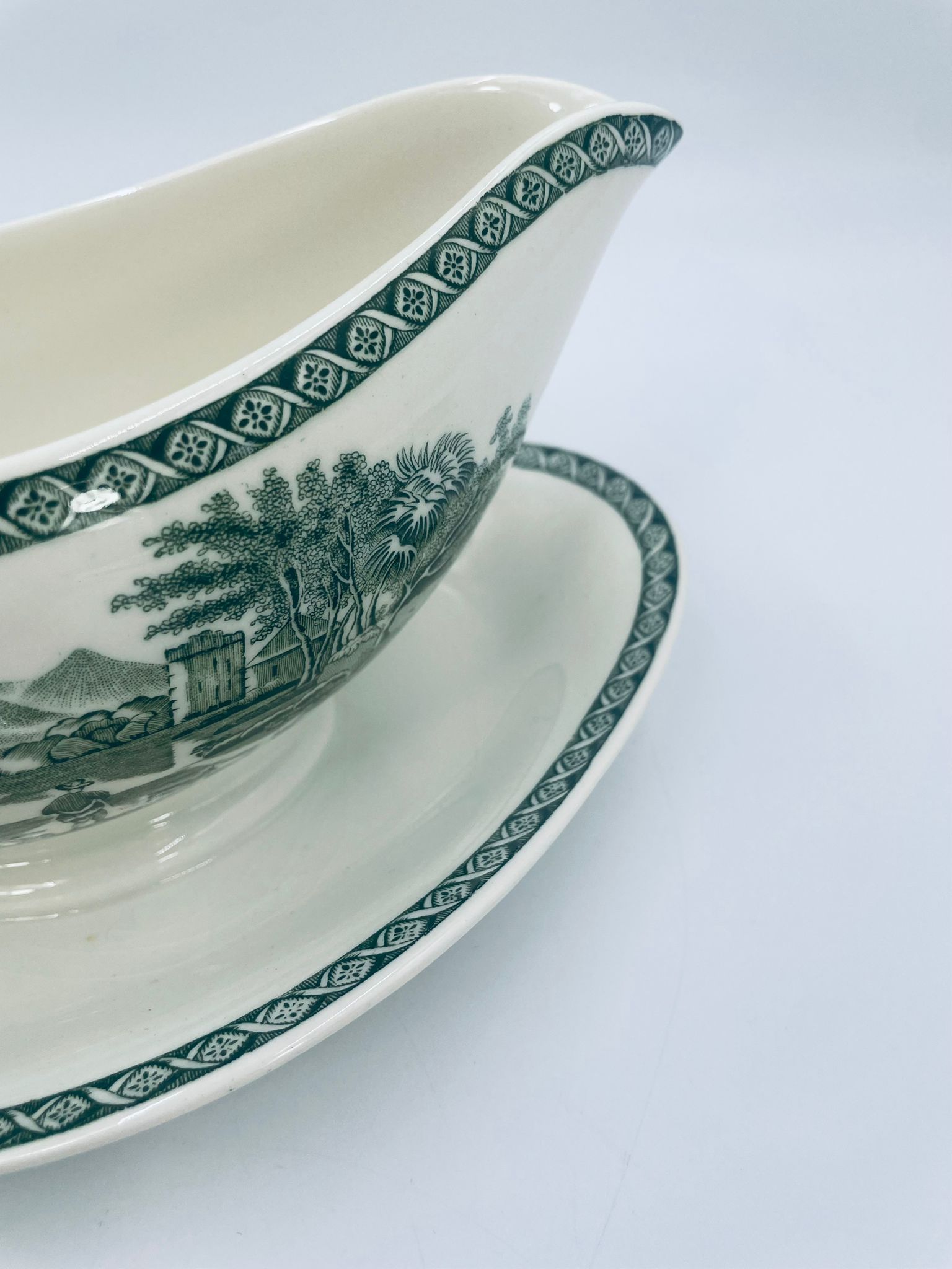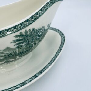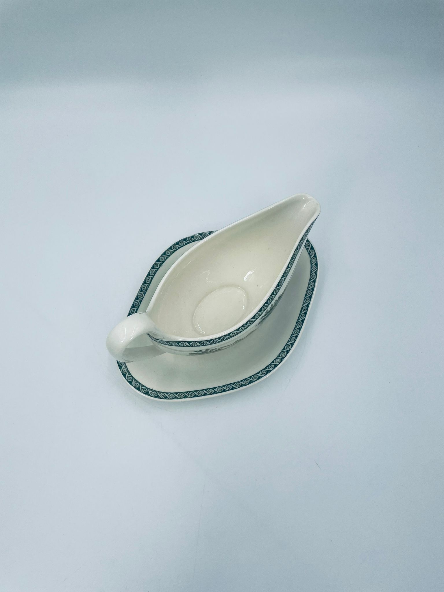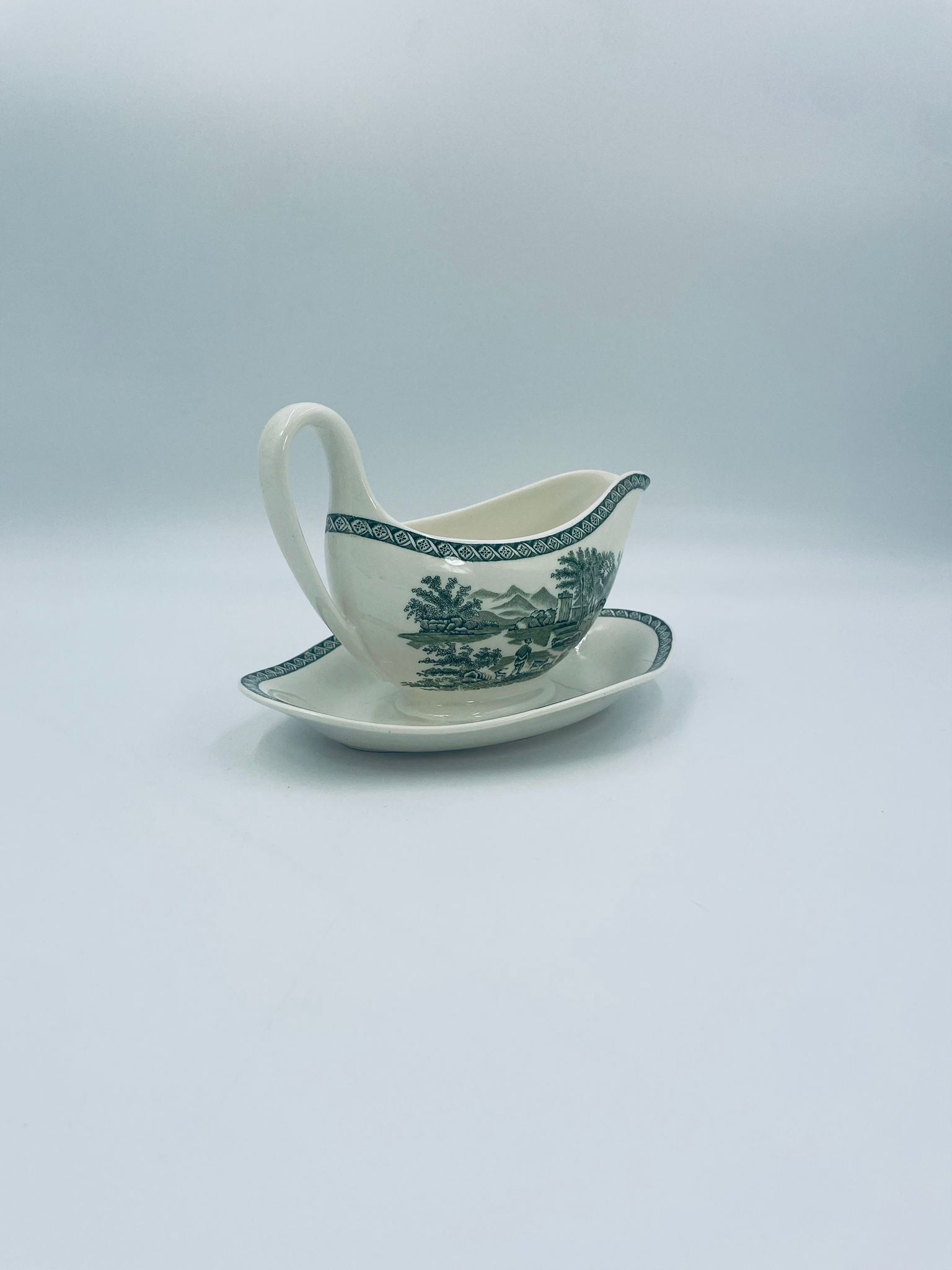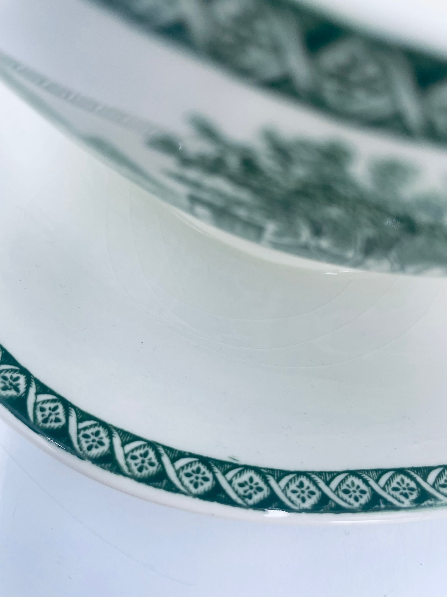 A saucepan with saucer by British label Wedgwood of Etriuria & Barlaston from the 1960s Lugano series, made from high quality porcelain in ecru. The saucer features green decoration depicting idyllic landscapes and architecture, finished with a green garland on the rim. It has a crack in the glaze.