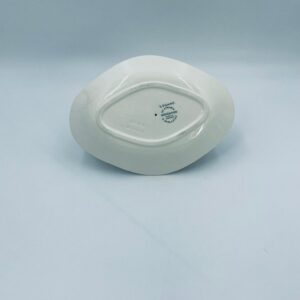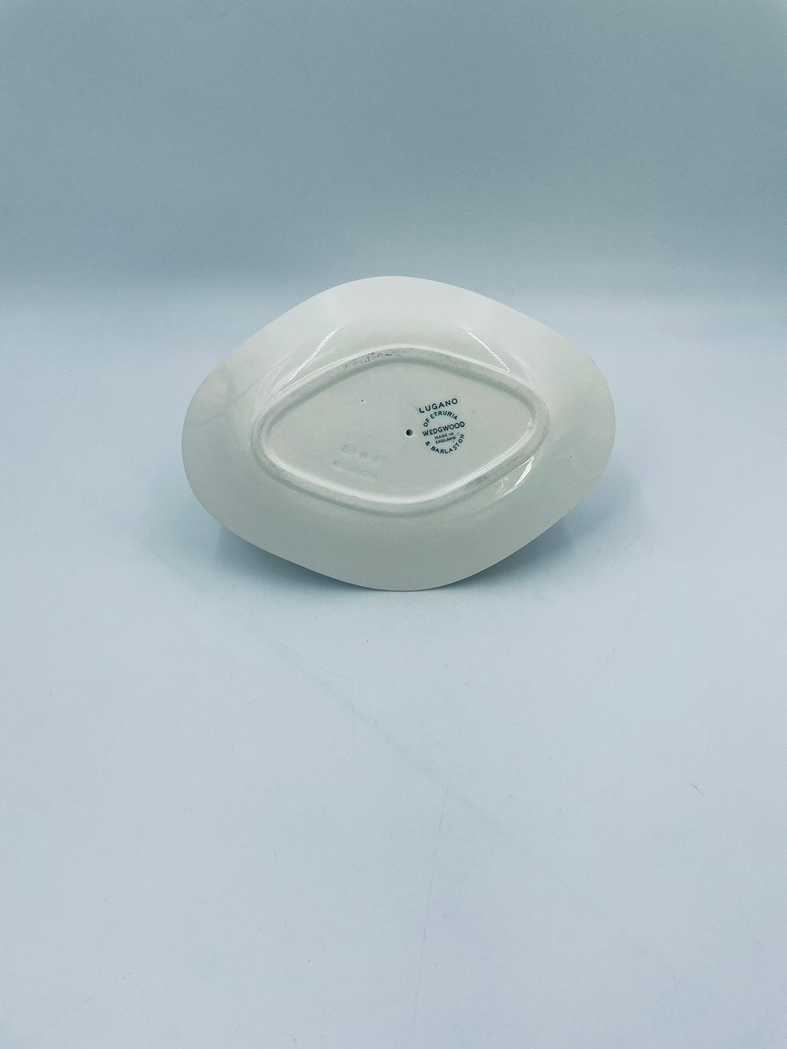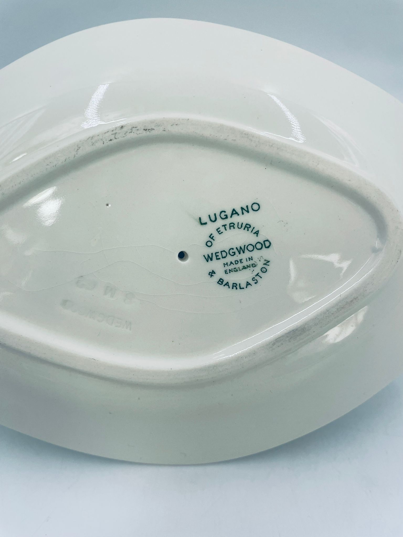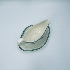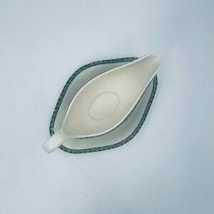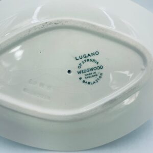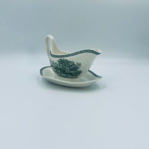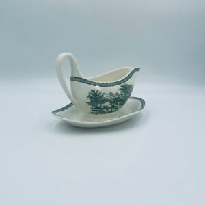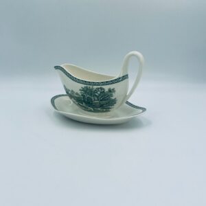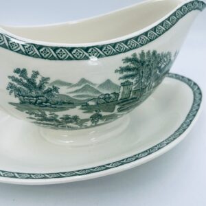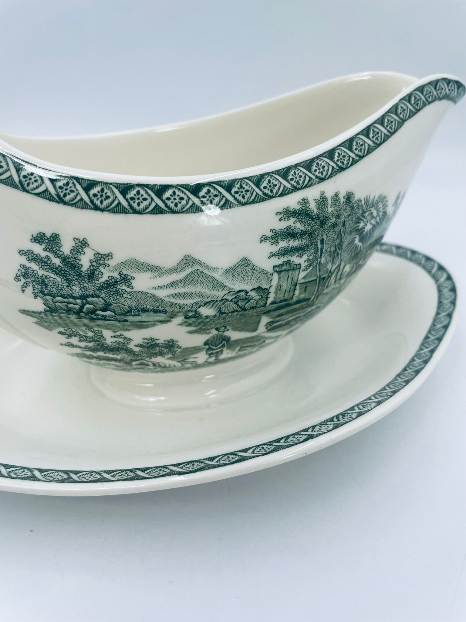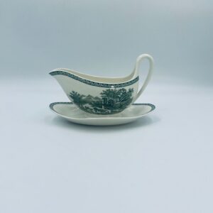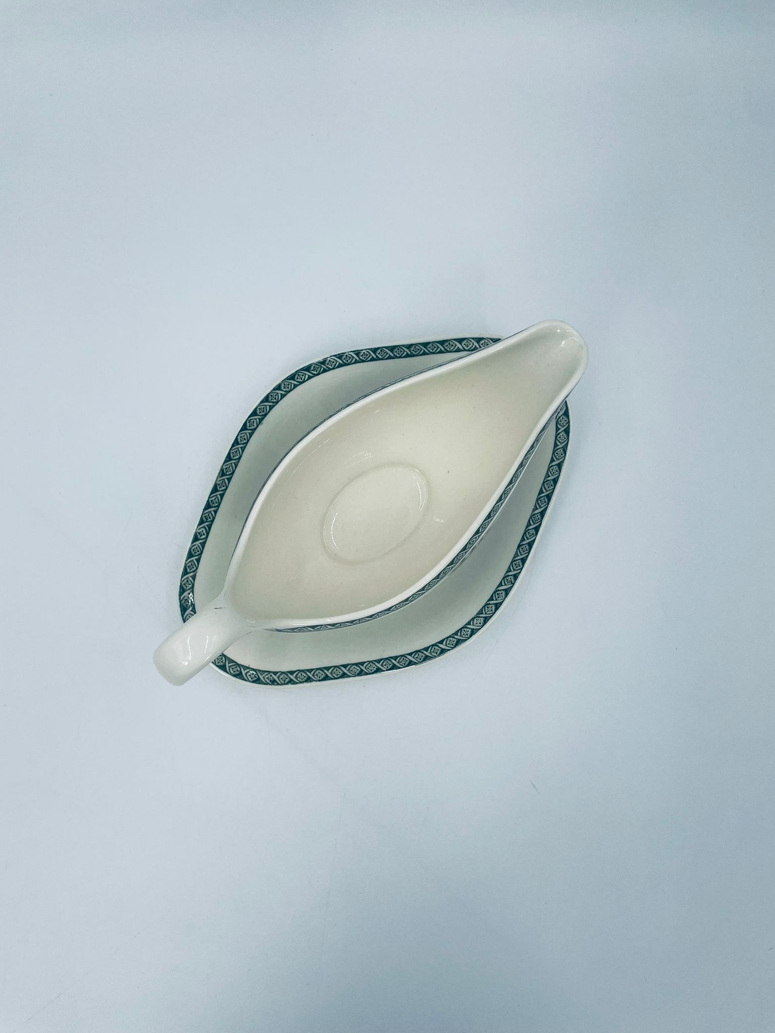 A saucepan with saucer by British label Wedgwood of Etriuria & Barlaston from the 1960s Lugano series, made from high quality porcelain in ecru. The saucer features green decoration depicting idyllic landscapes and architecture, finished with a green garland on the rim. It has a crack in the glaze.