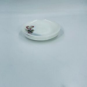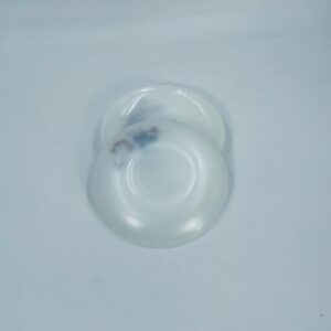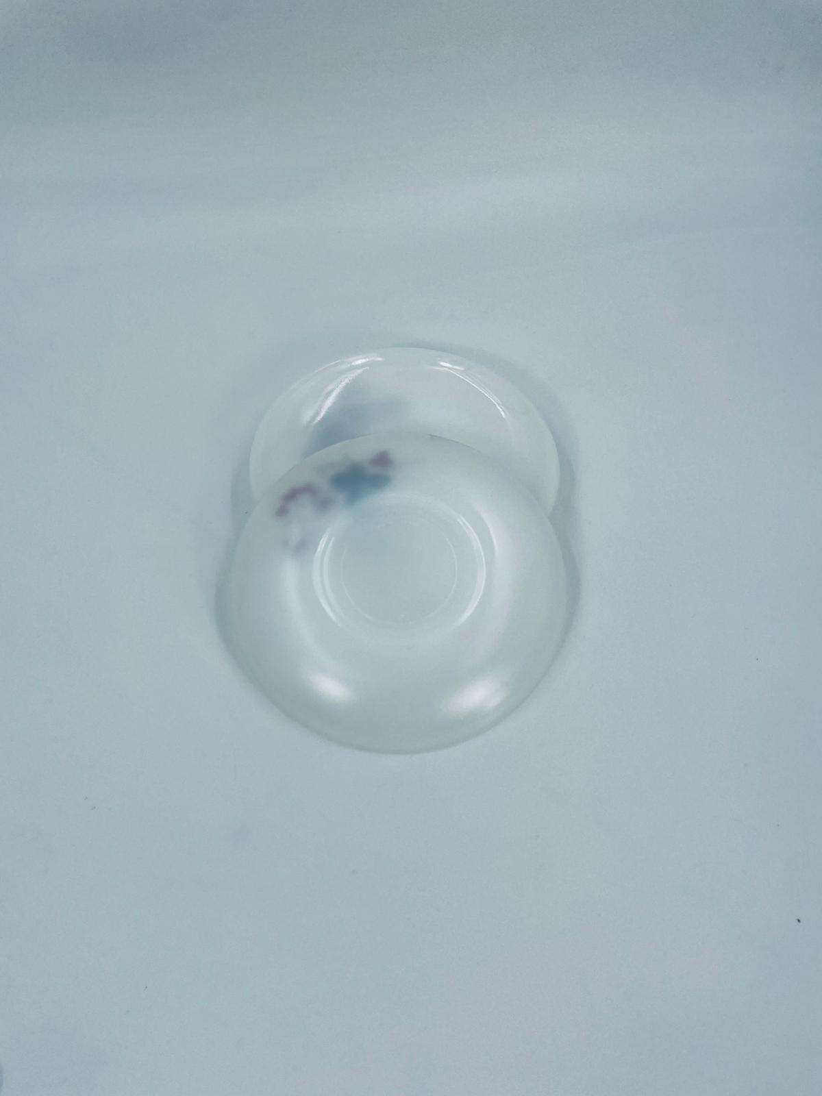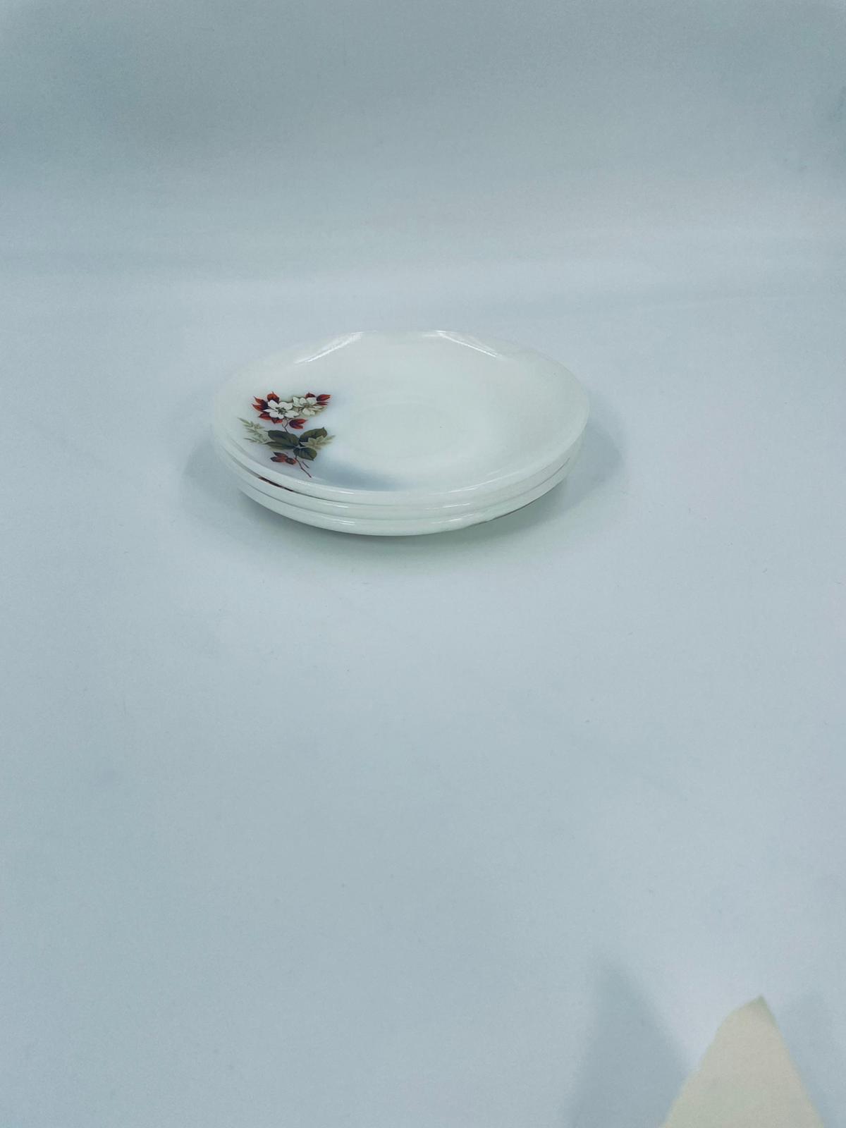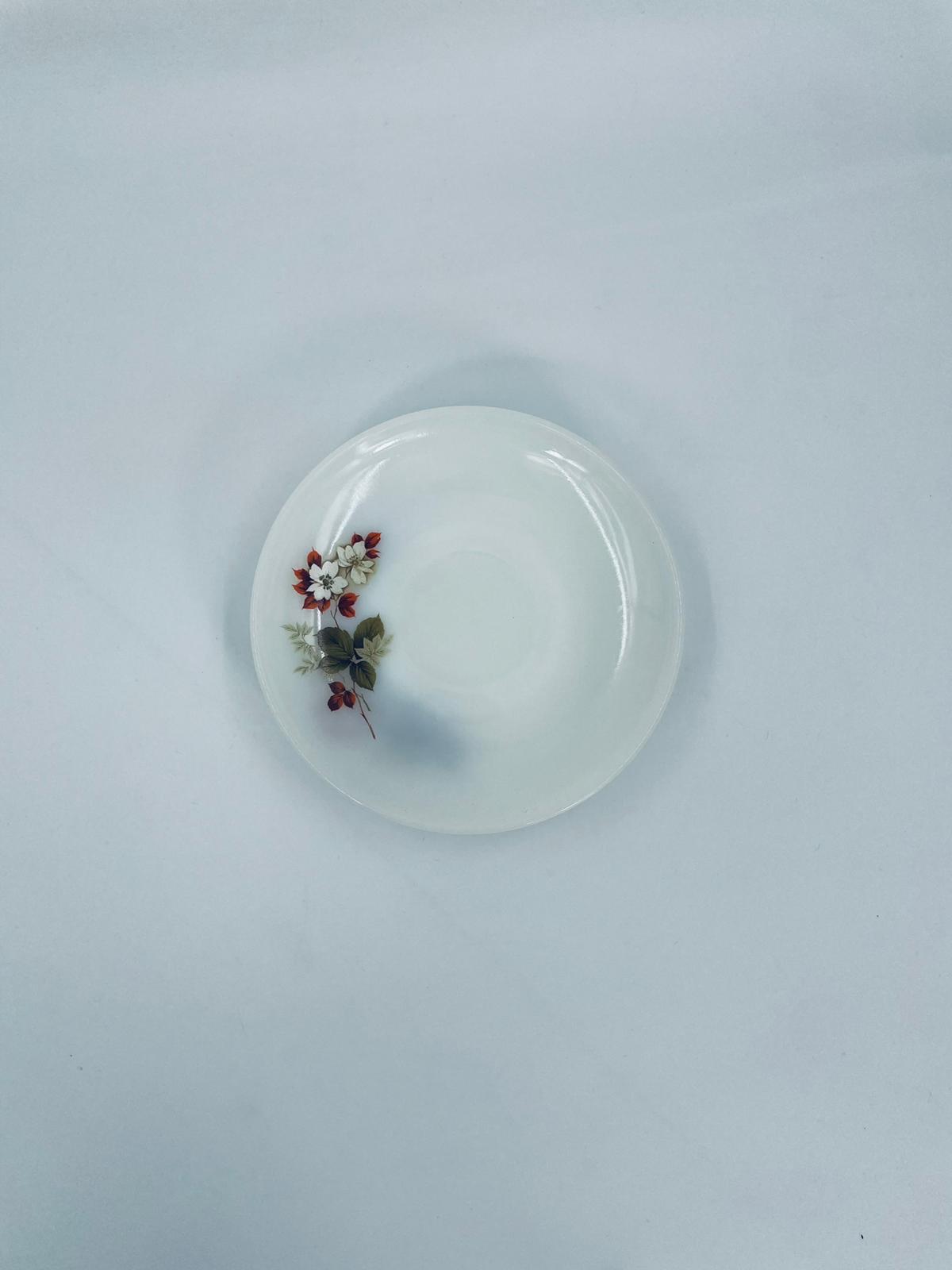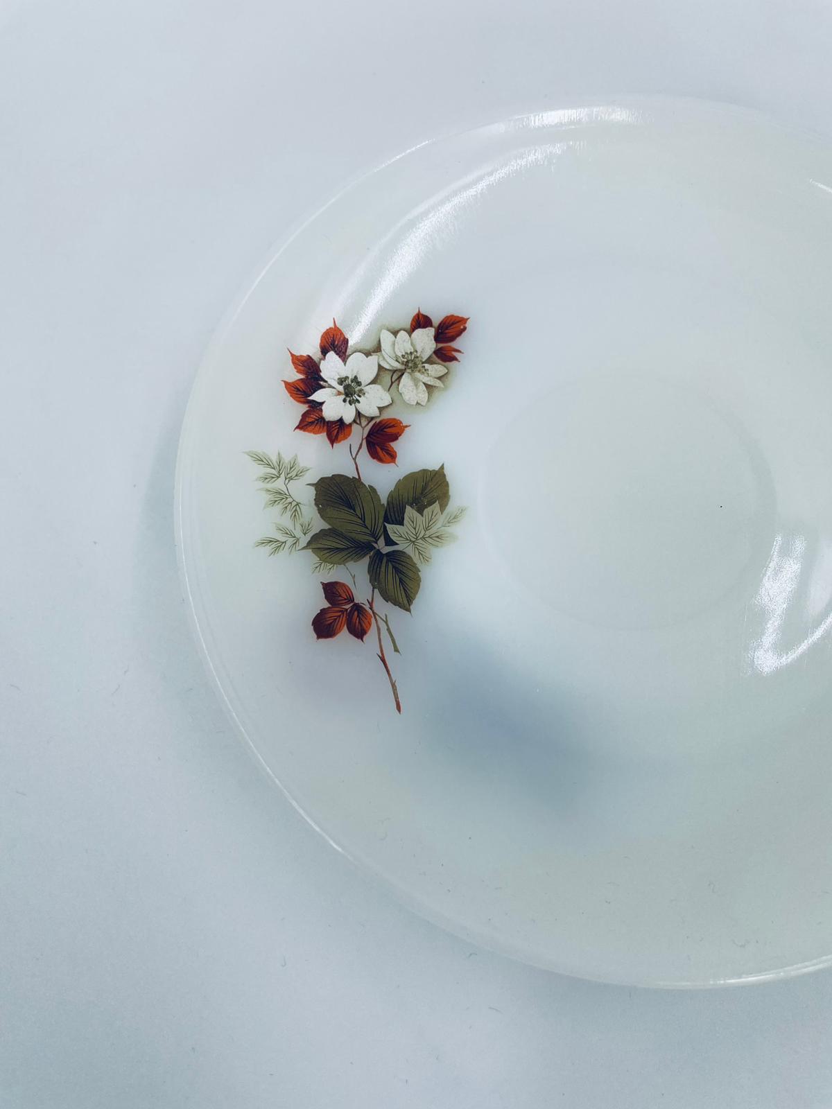 A teacup saucer by the Arcopal label from the 1950s, made from high quality durable opal glass. It features a white colour and a pattern of flowers and hawthorn branches.