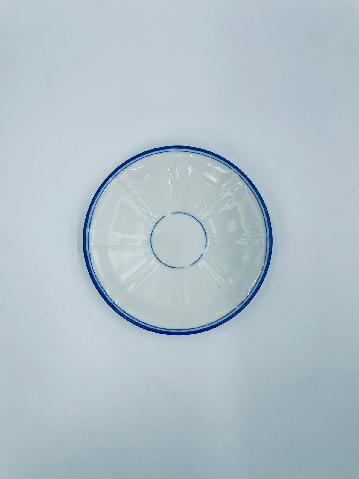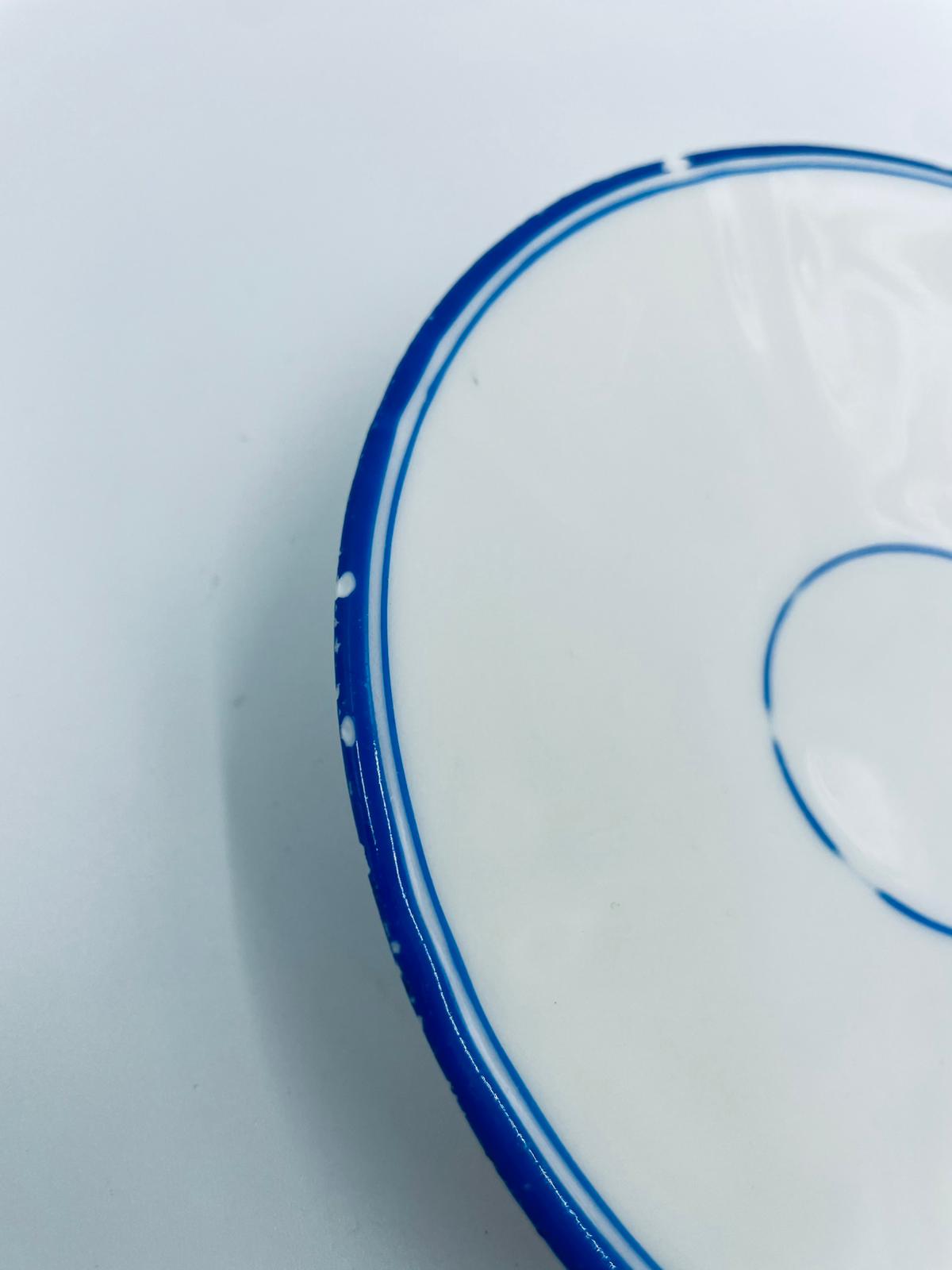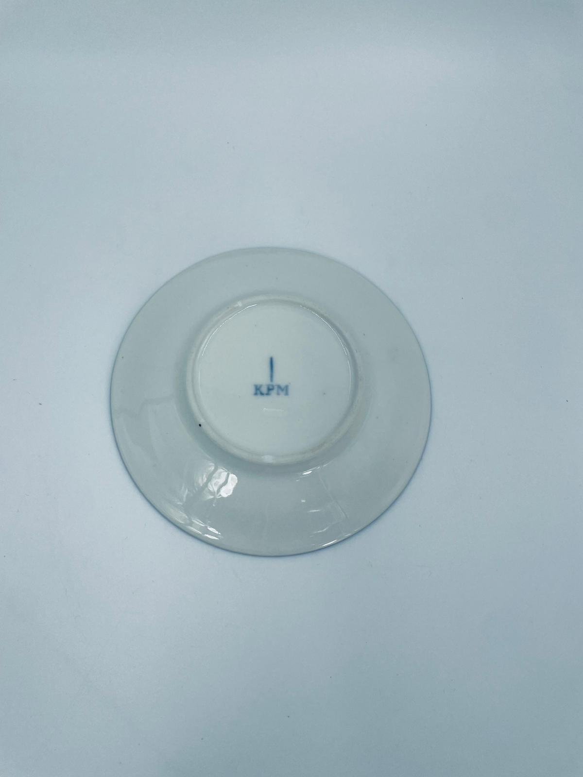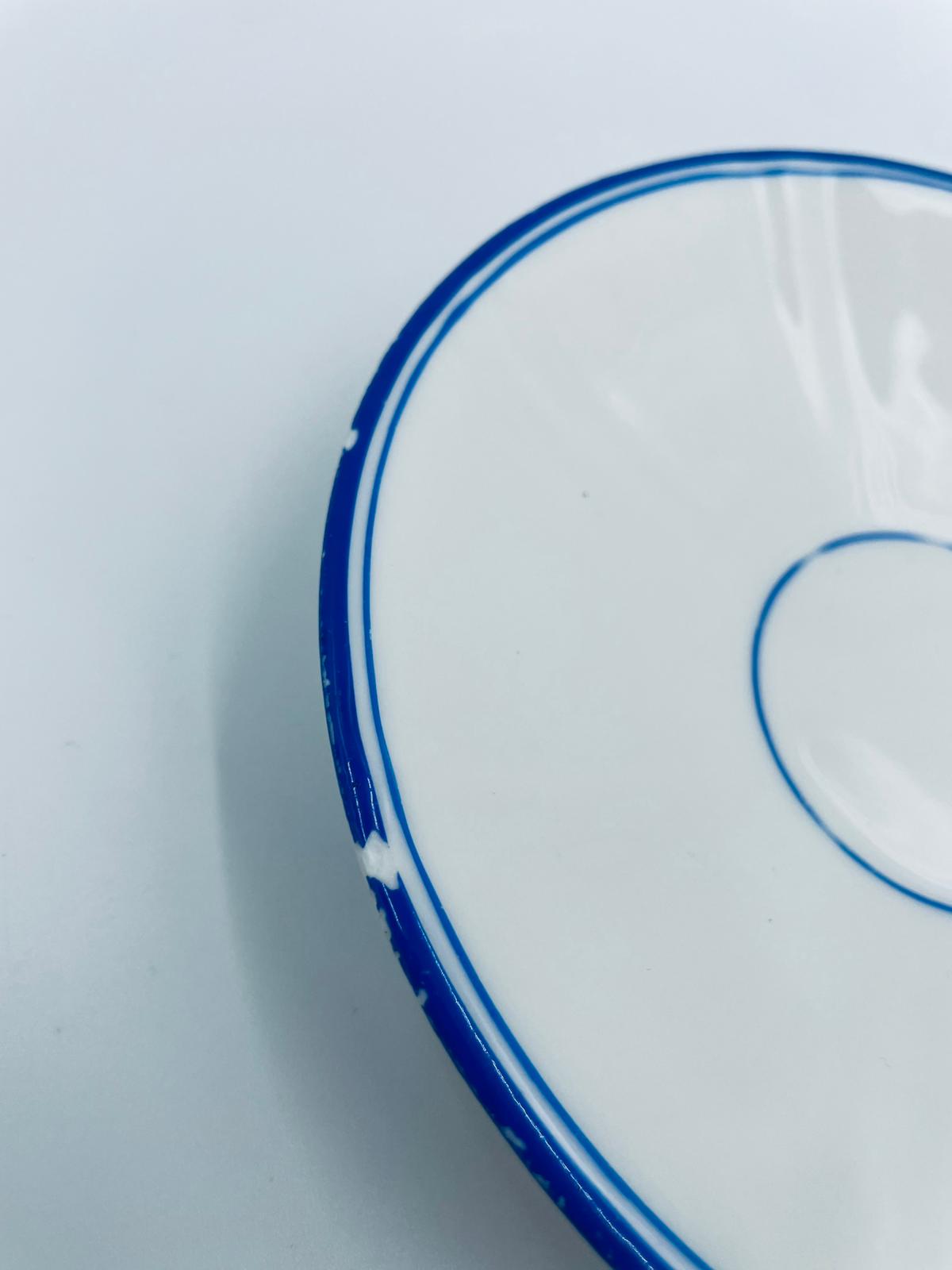 Cup saucer by the royal communist-era KPM Berlin manufactory, made of high-quality white porcelain. The saucer is elegant and classic, decorated with a blue stripe on the edges. It has rubbing and small chips.