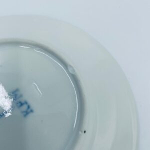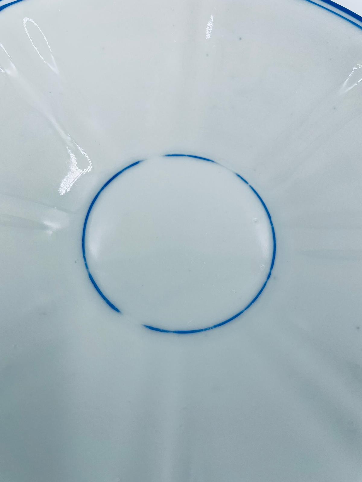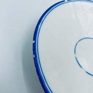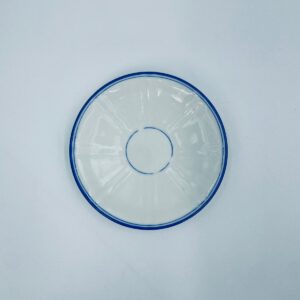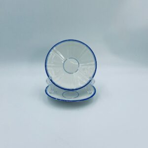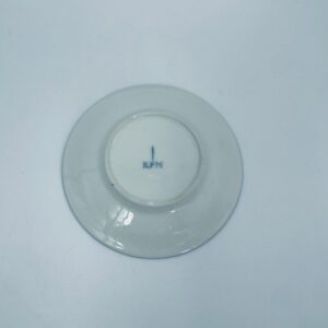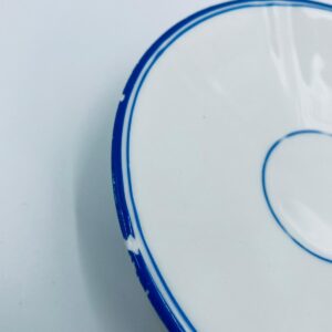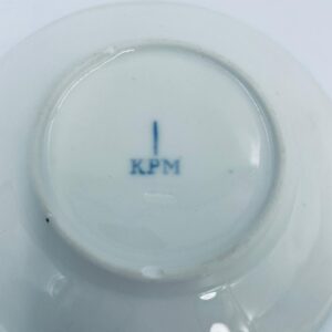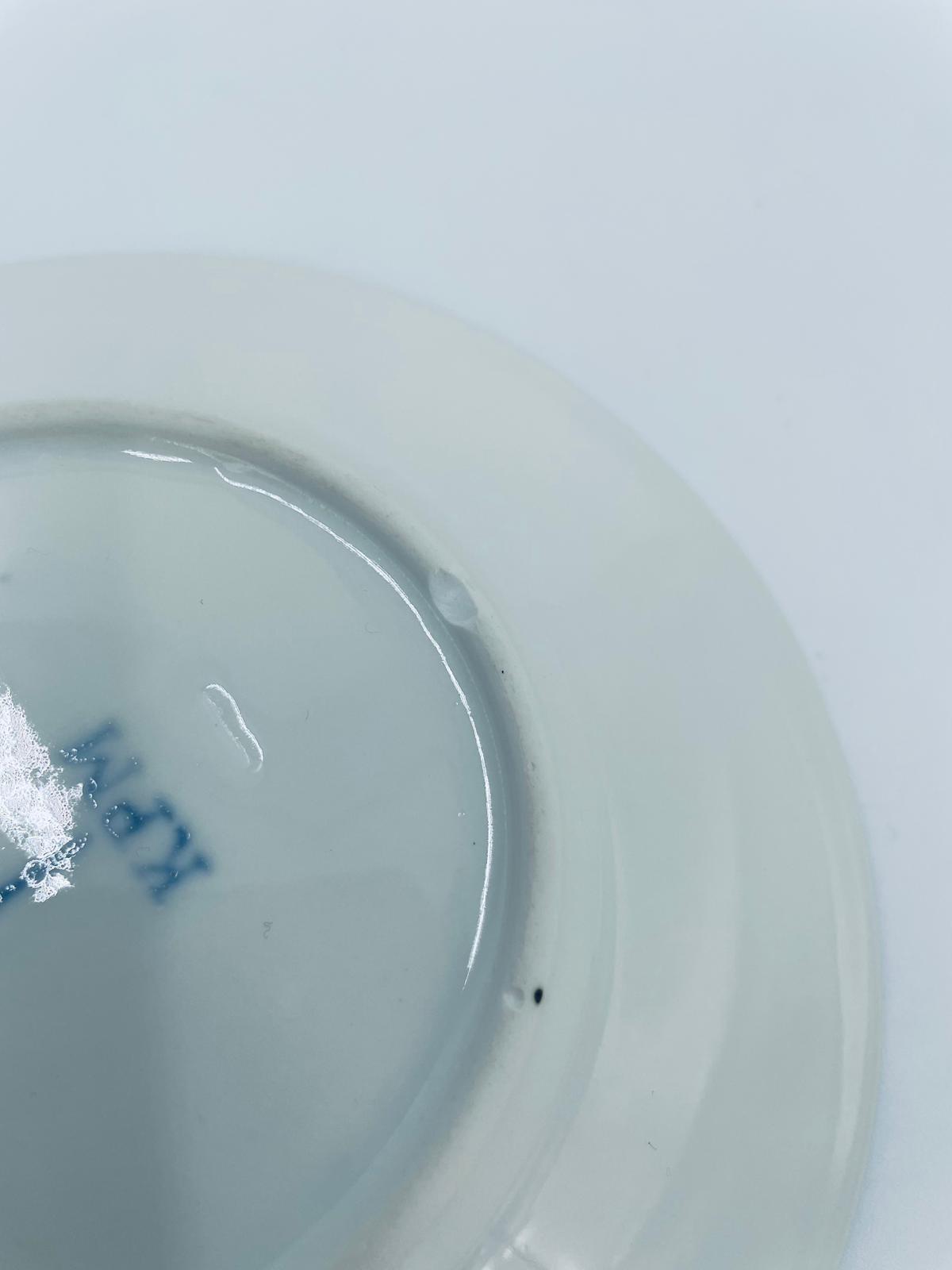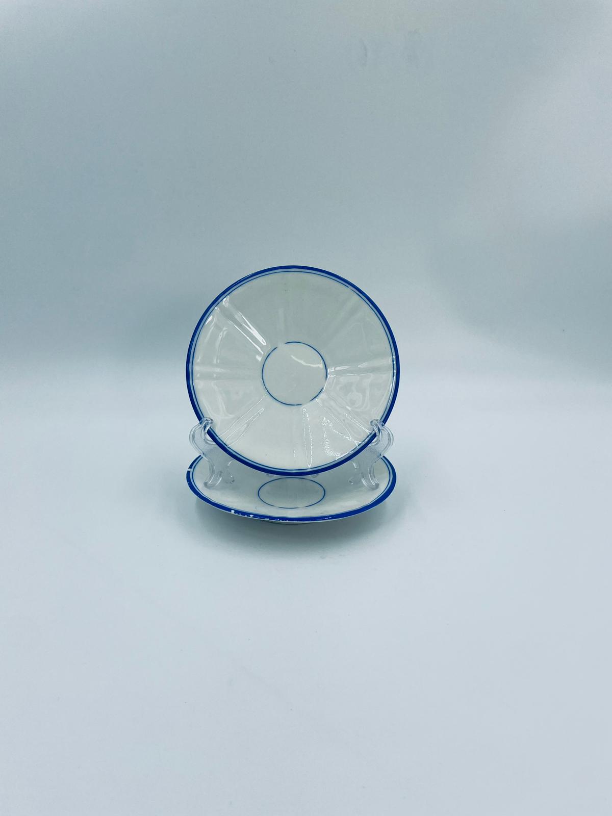 Cup saucer by the royal communist-era KPM Berlin manufactory, made of high-quality white porcelain. The saucer is elegant and classic, decorated with a blue stripe on the edges. It has rubbing and small chips.