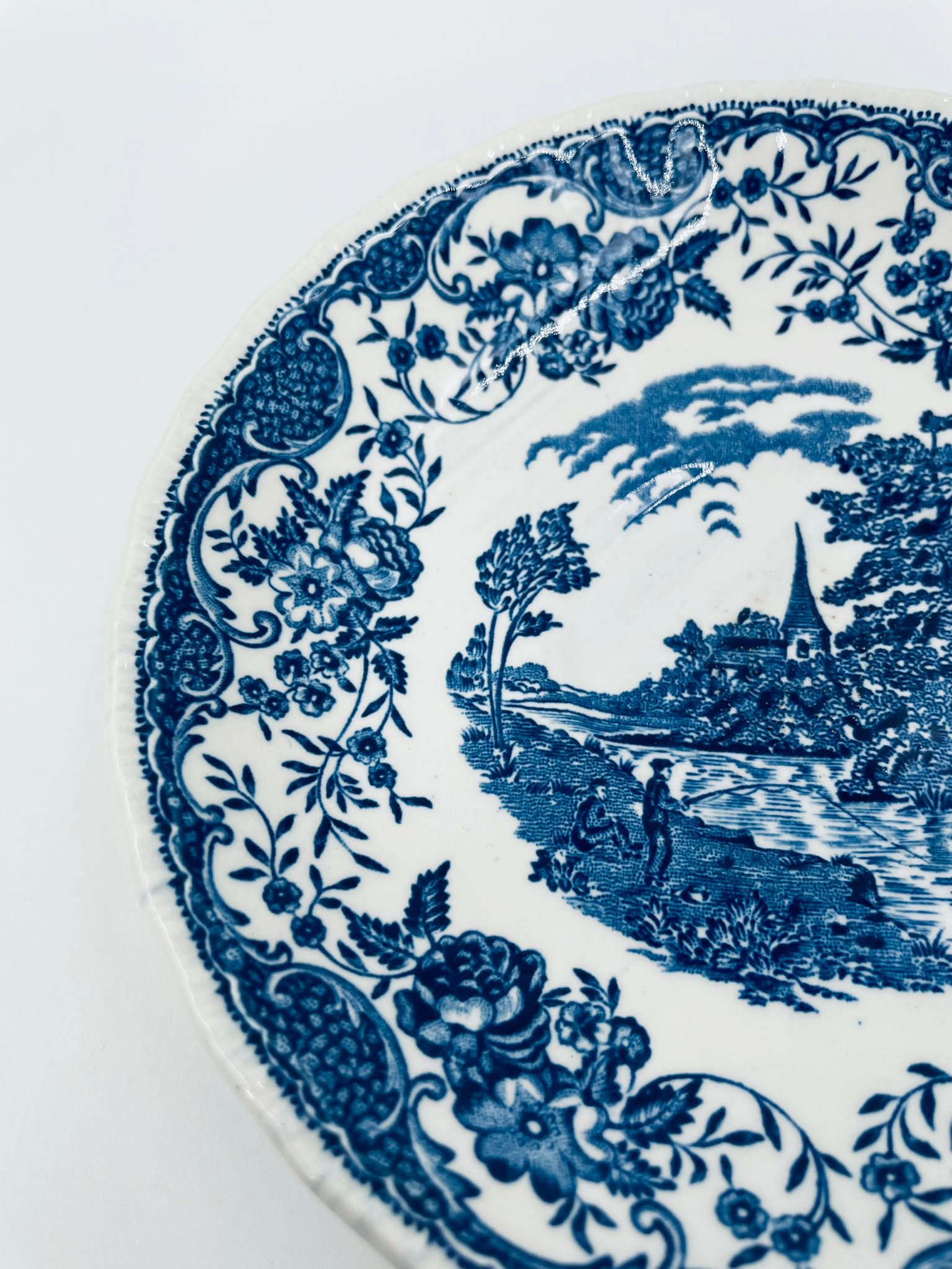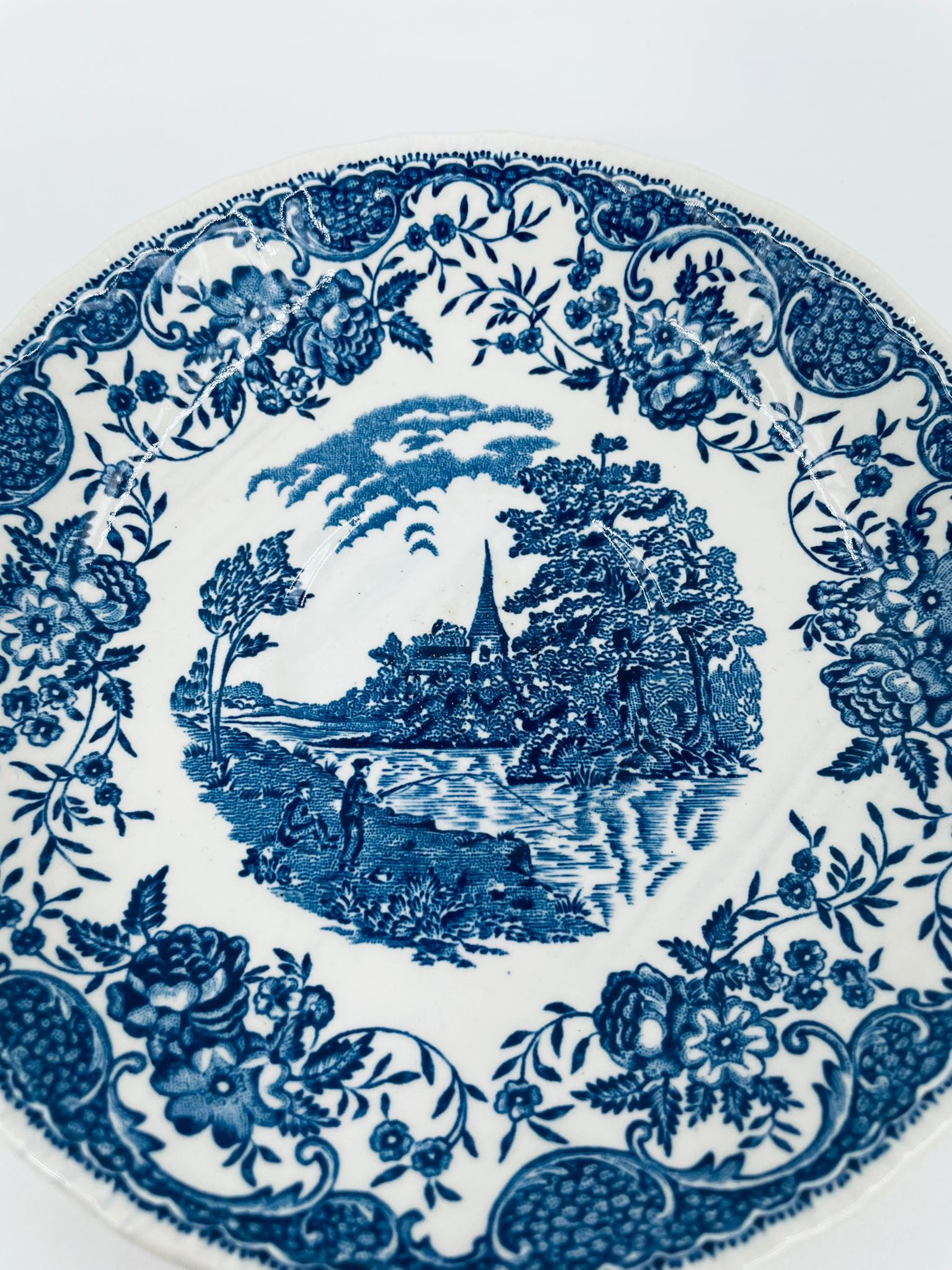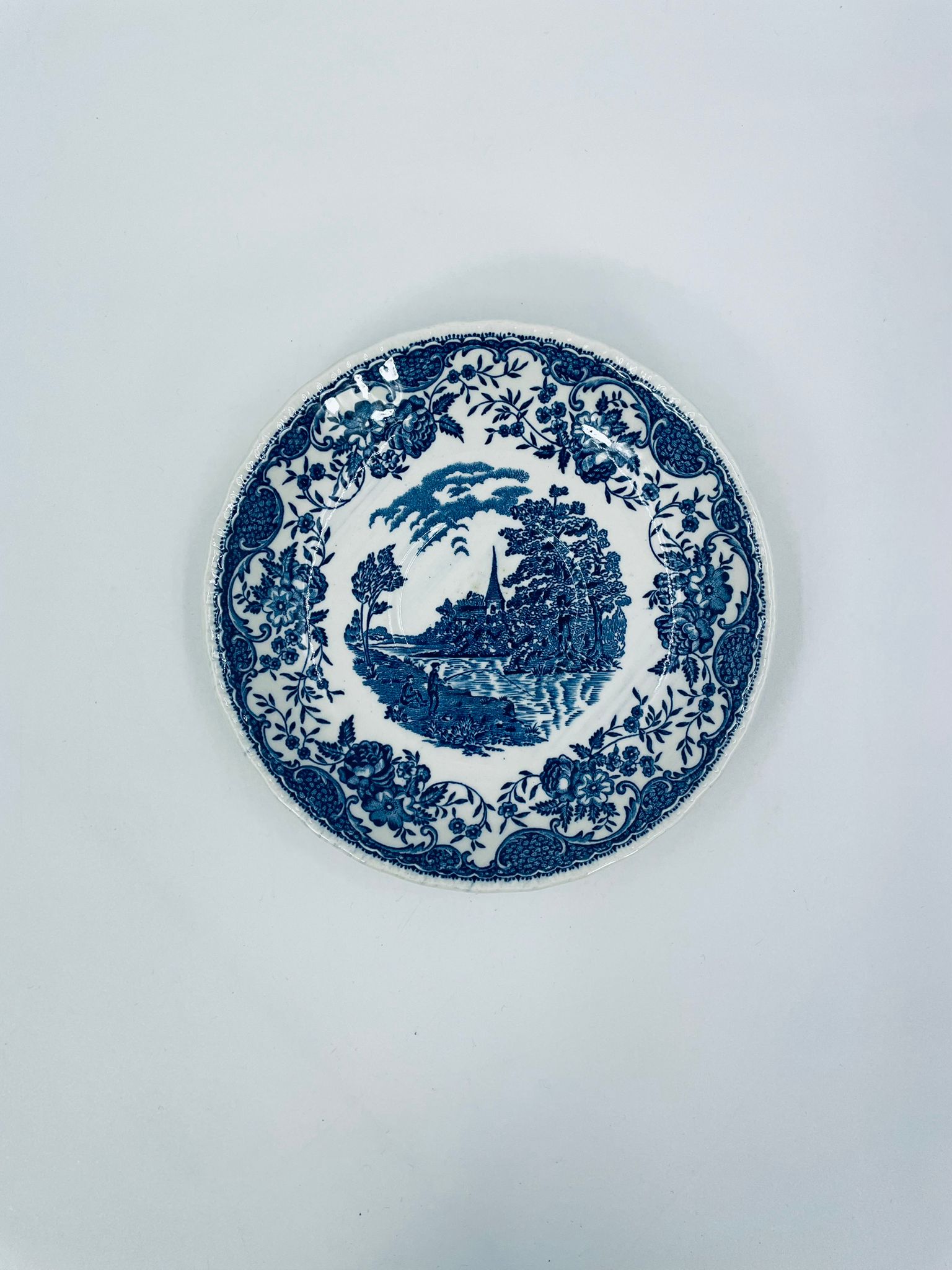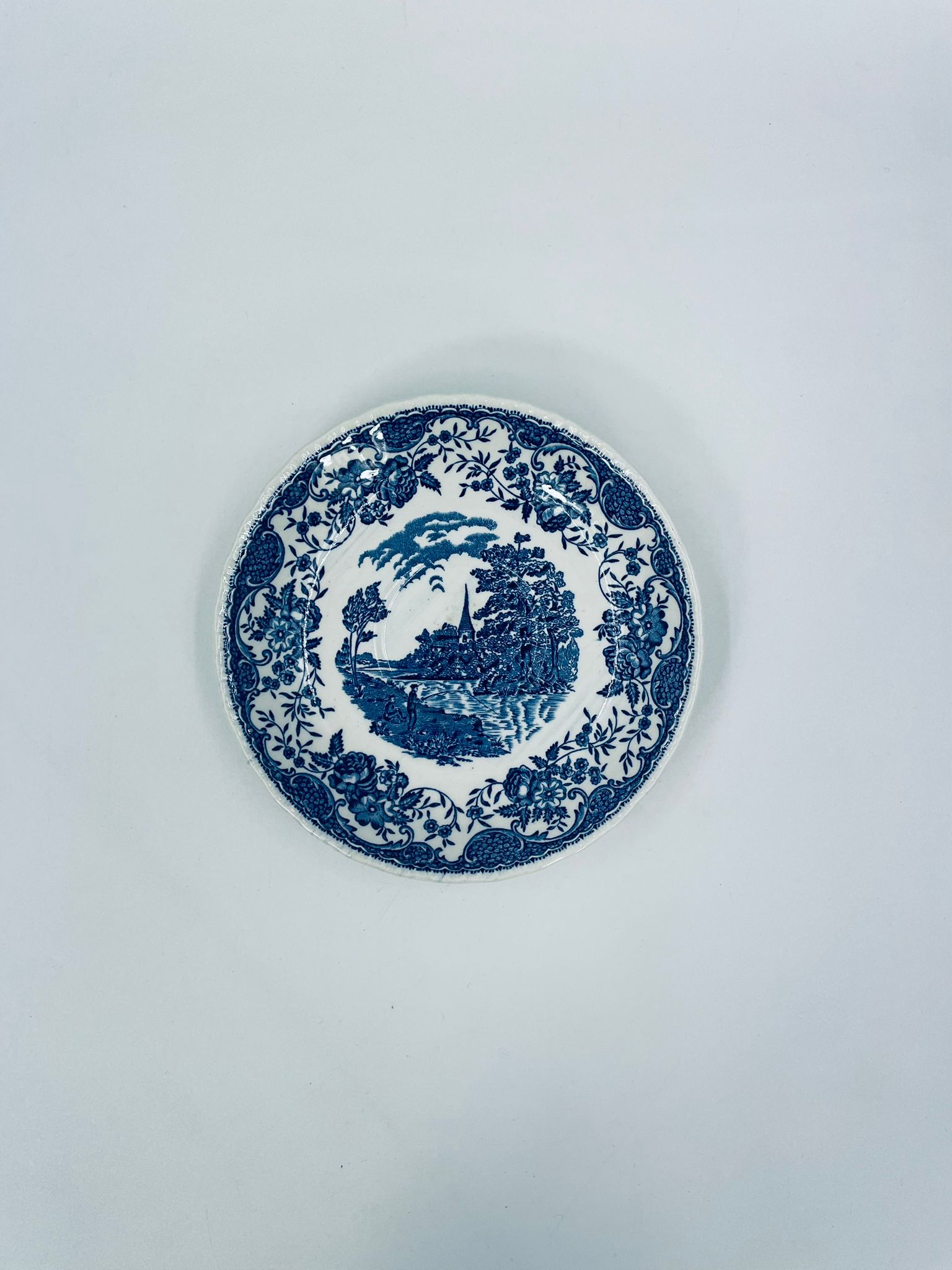 A teacup saucer from the Royal Tudor Ware collection in the Olde England pattern, made from high quality white porcelain. The saucer features a blue landscape of a house by a river, people fishing, surrounded by a floral motif around the edge.