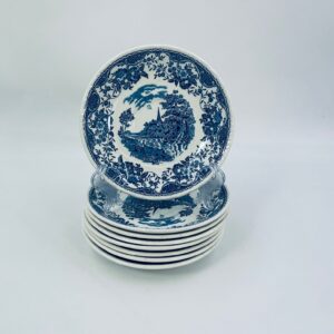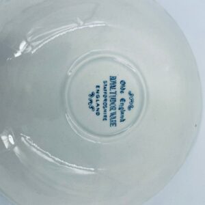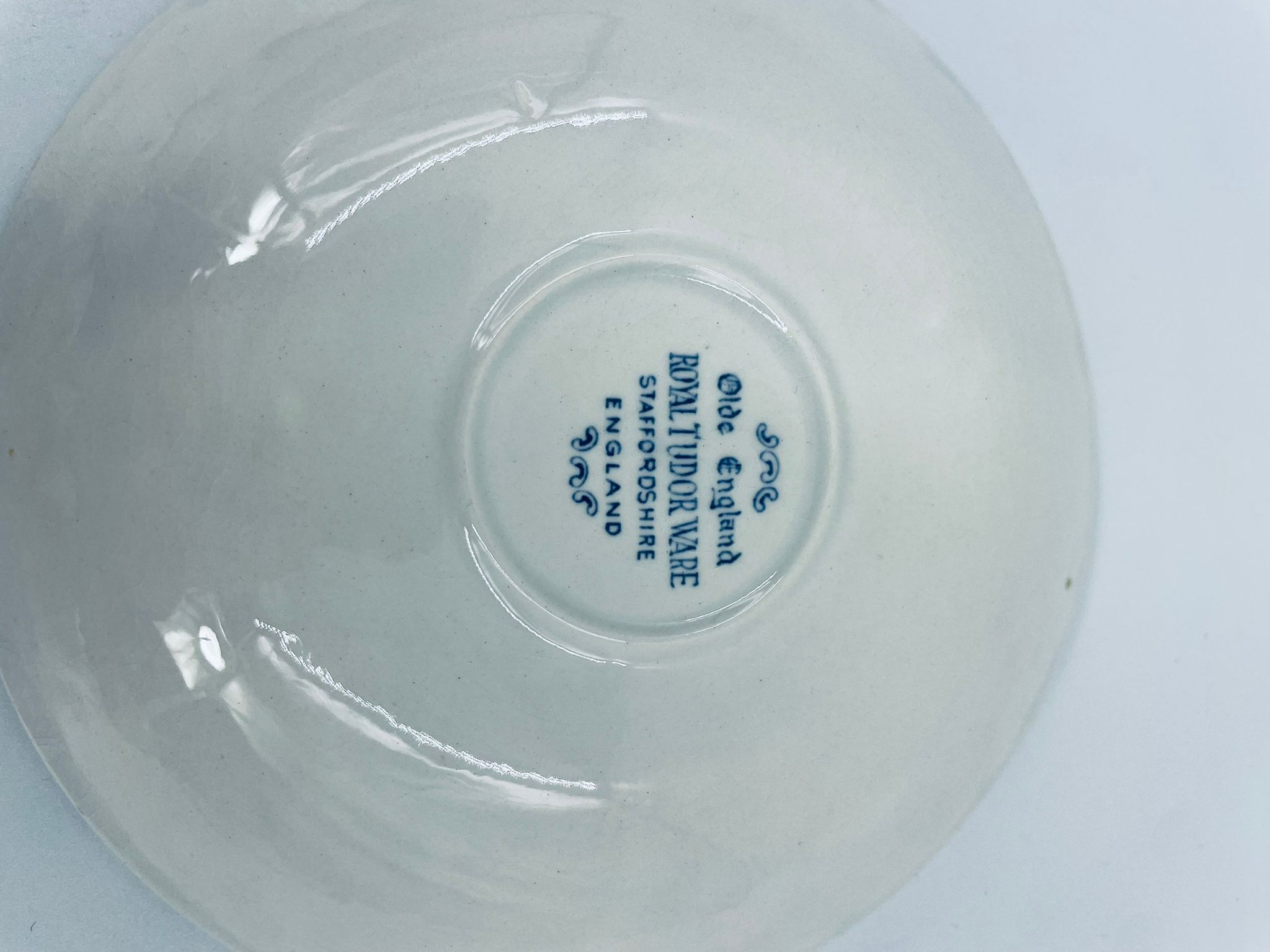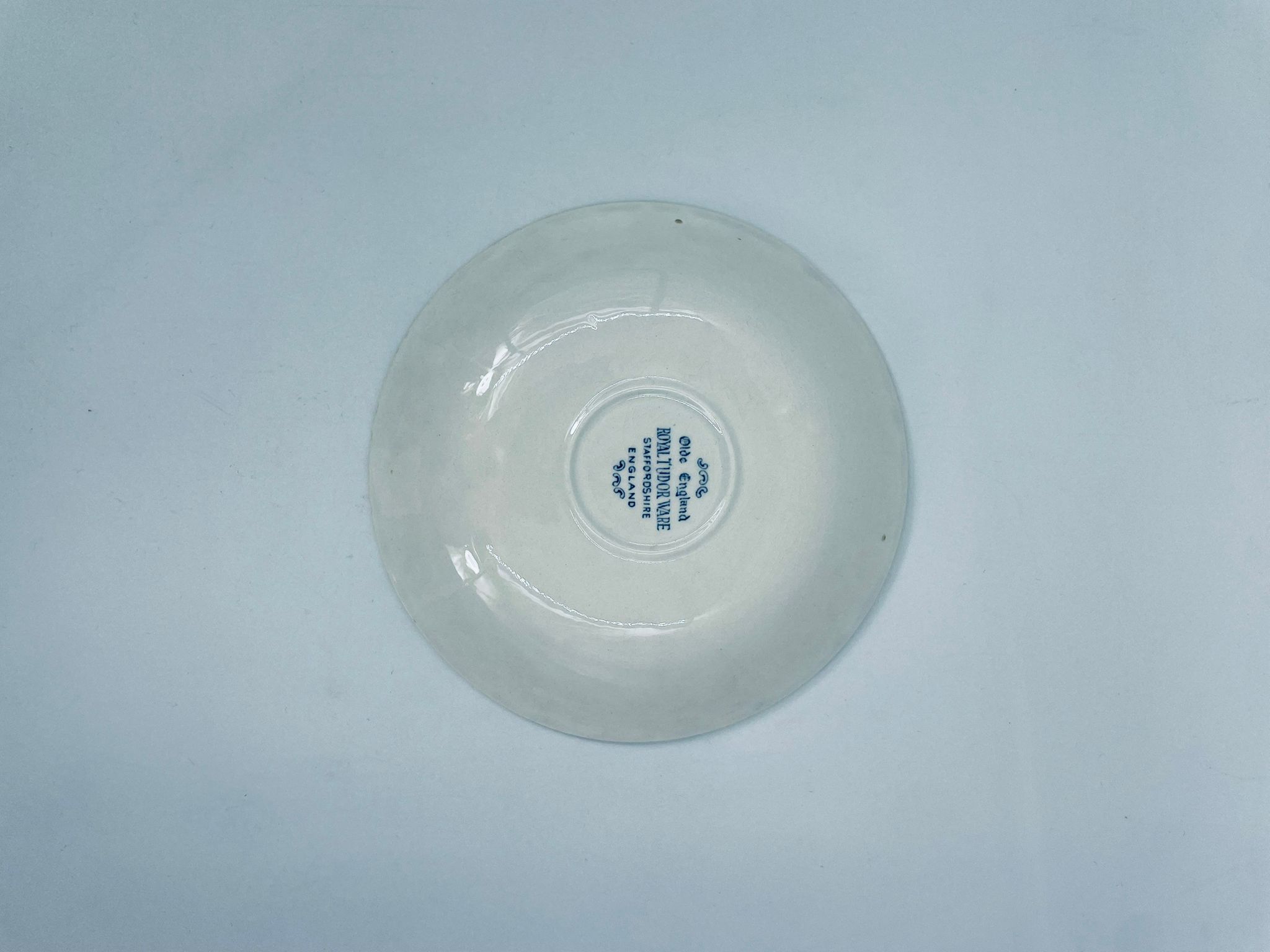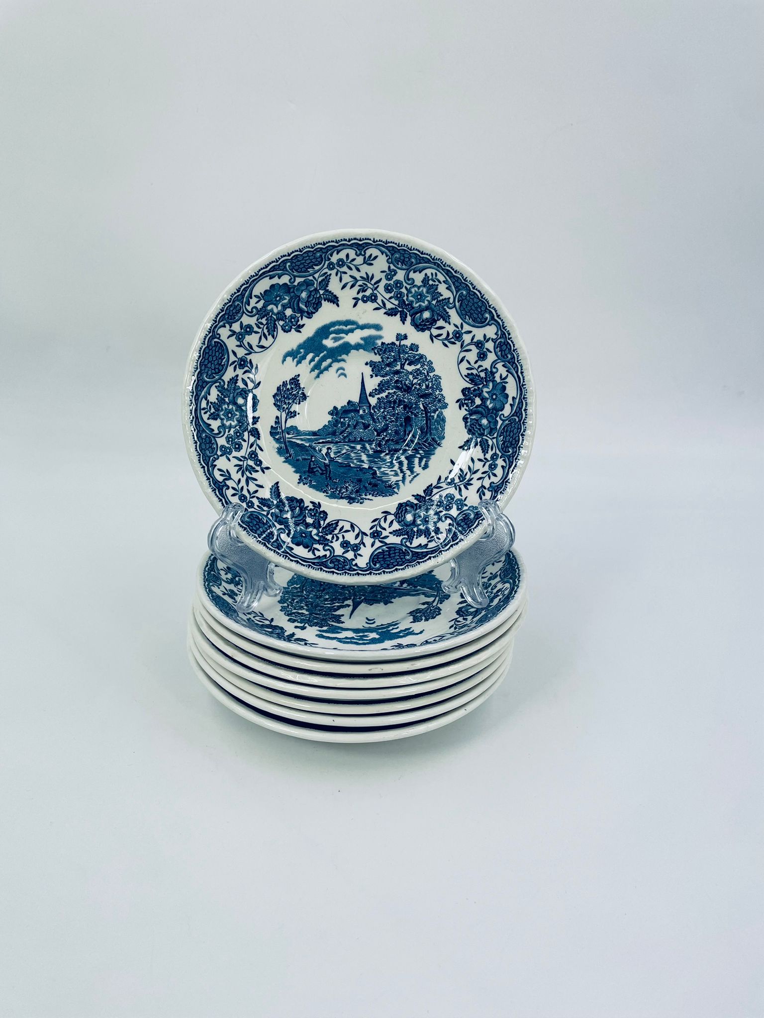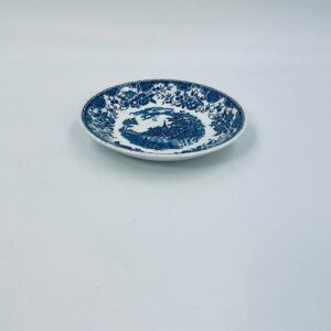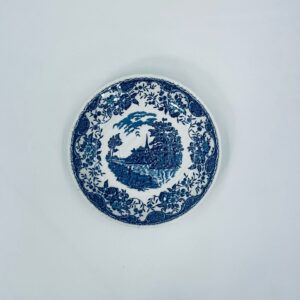 A teacup saucer from the Royal Tudor Ware collection in the Olde England pattern, made from high quality white porcelain. The saucer features a blue landscape of a house by a river, people fishing, surrounded by a floral motif around the edge.