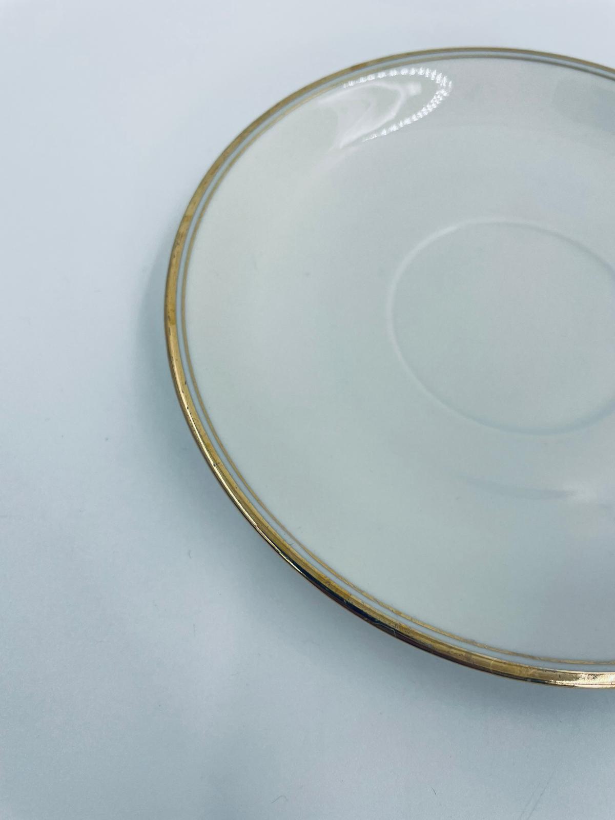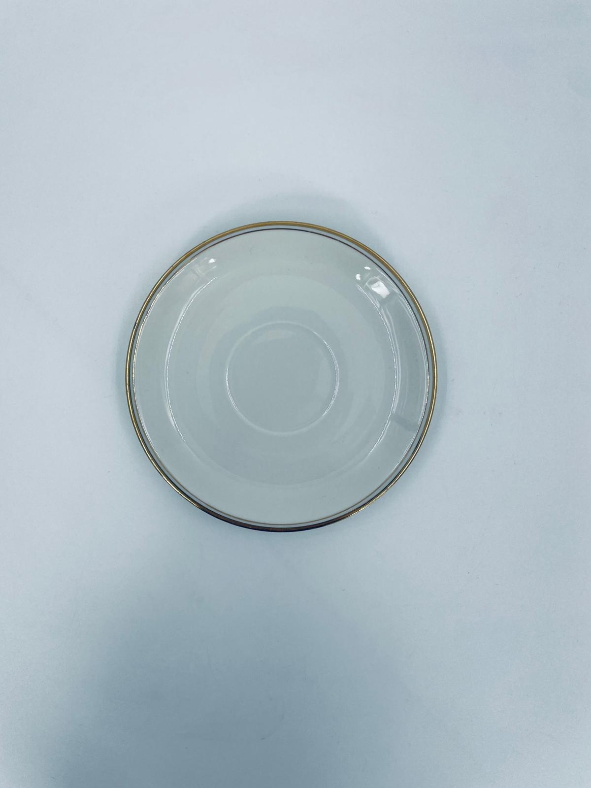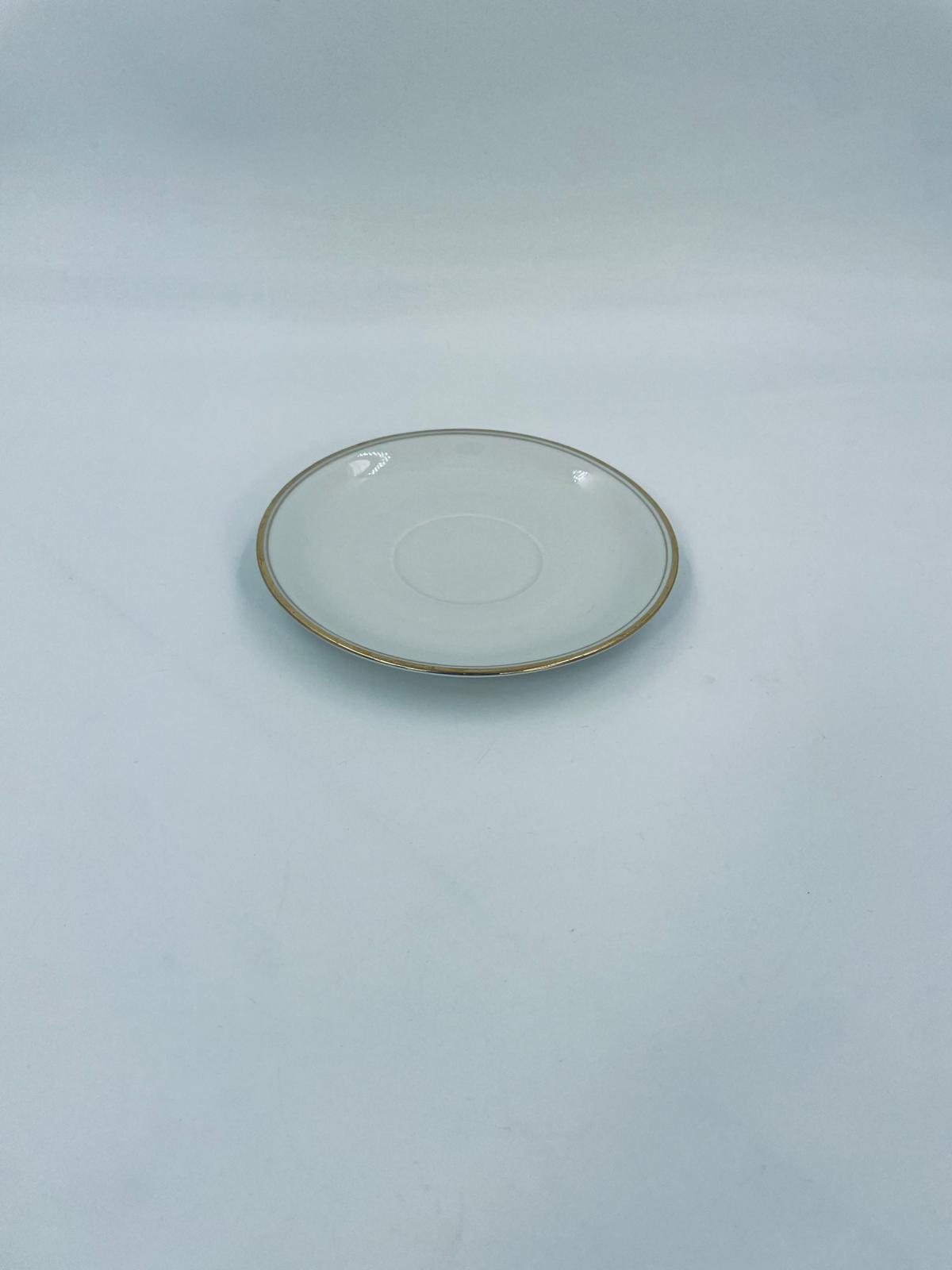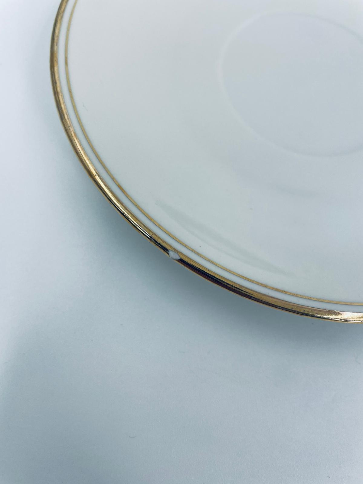 Cup saucer by Seltmann Weiden, made of high quality white porcelain. A classic round saucer, finished with gilding on the rim. It has rubbing on the gilding and a small loss.