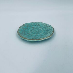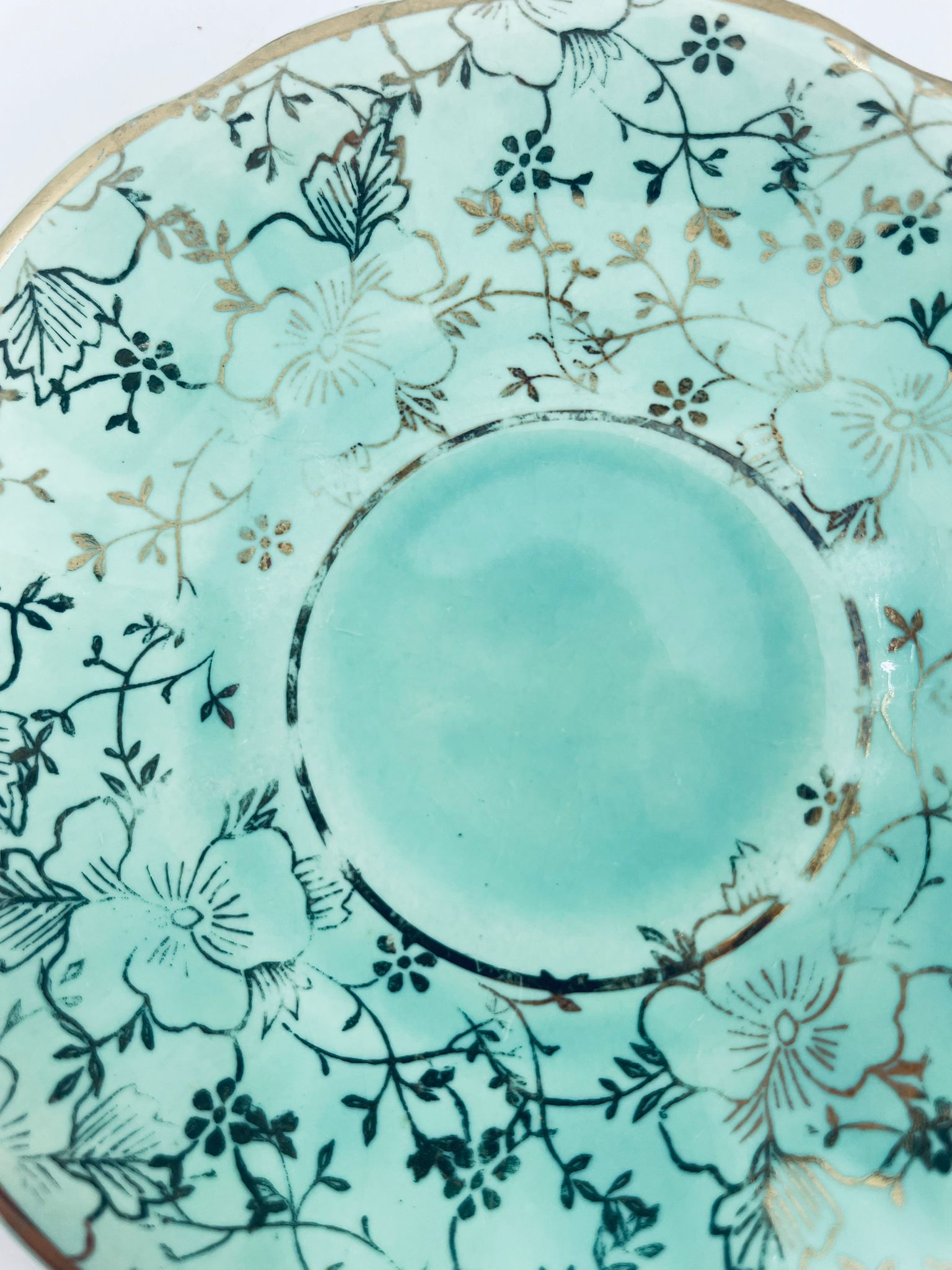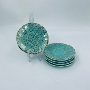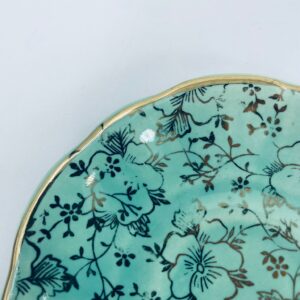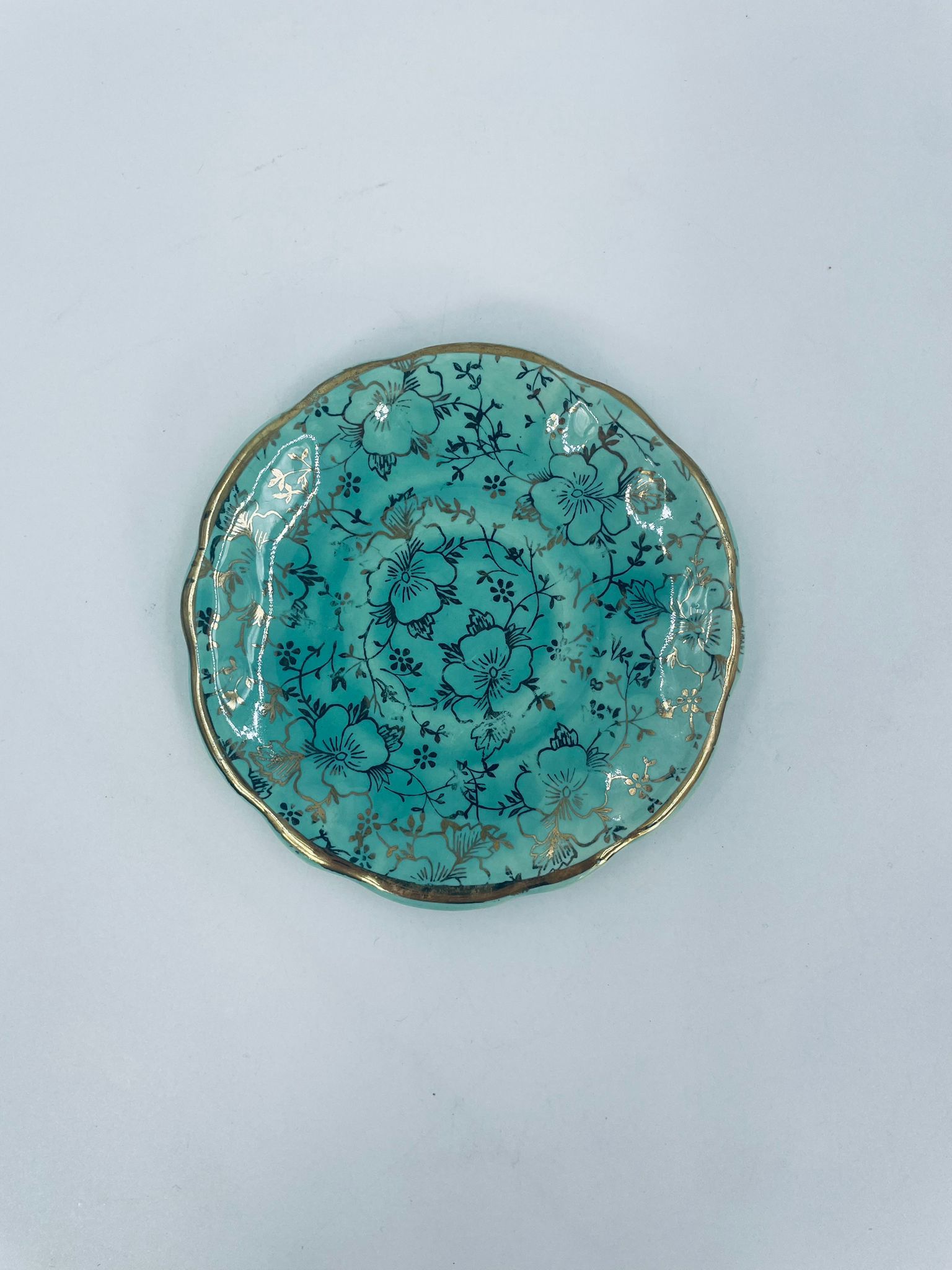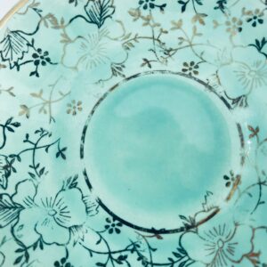 Vintage style teacup saucer, made from high quality porcelain. The plate is coloured turquoise, decorated with rich gold accents with a floral motif, finished with gilding on the rims. It has rubbing on the gilding.