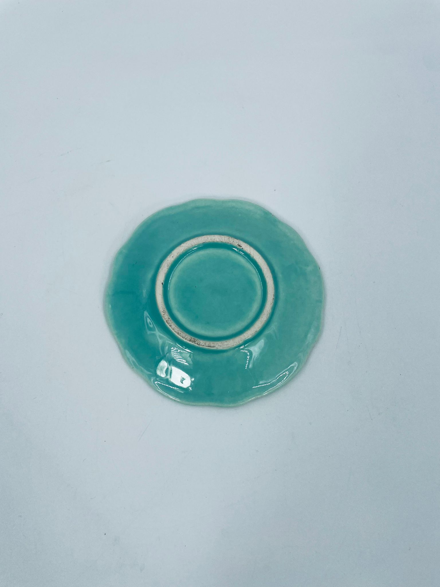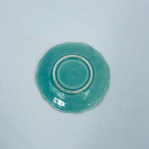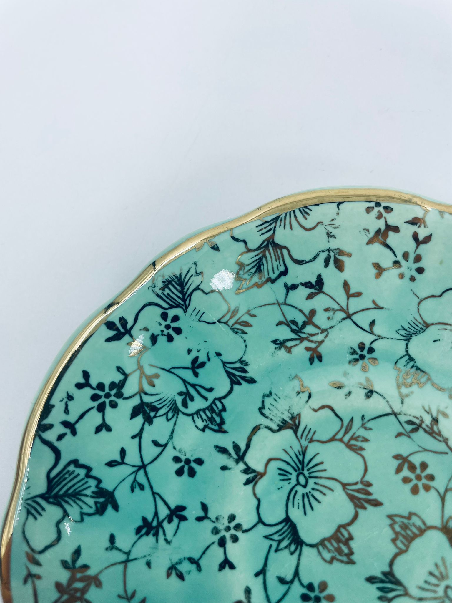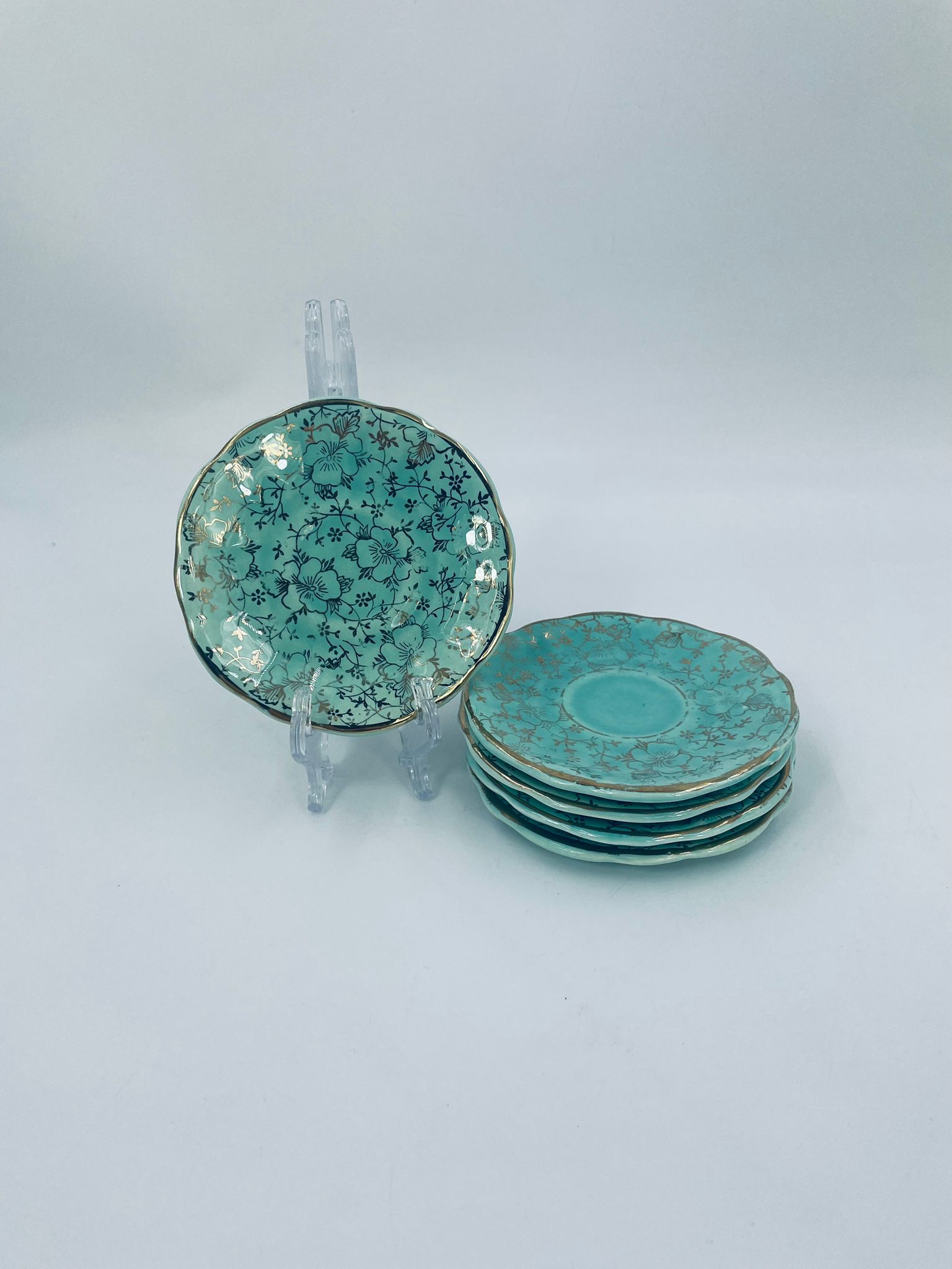 Vintage style teacup saucer, made from high quality porcelain. The plate is coloured turquoise, decorated with rich gold accents with a floral motif, finished with gilding on the rims. It has rubbing on the gilding.