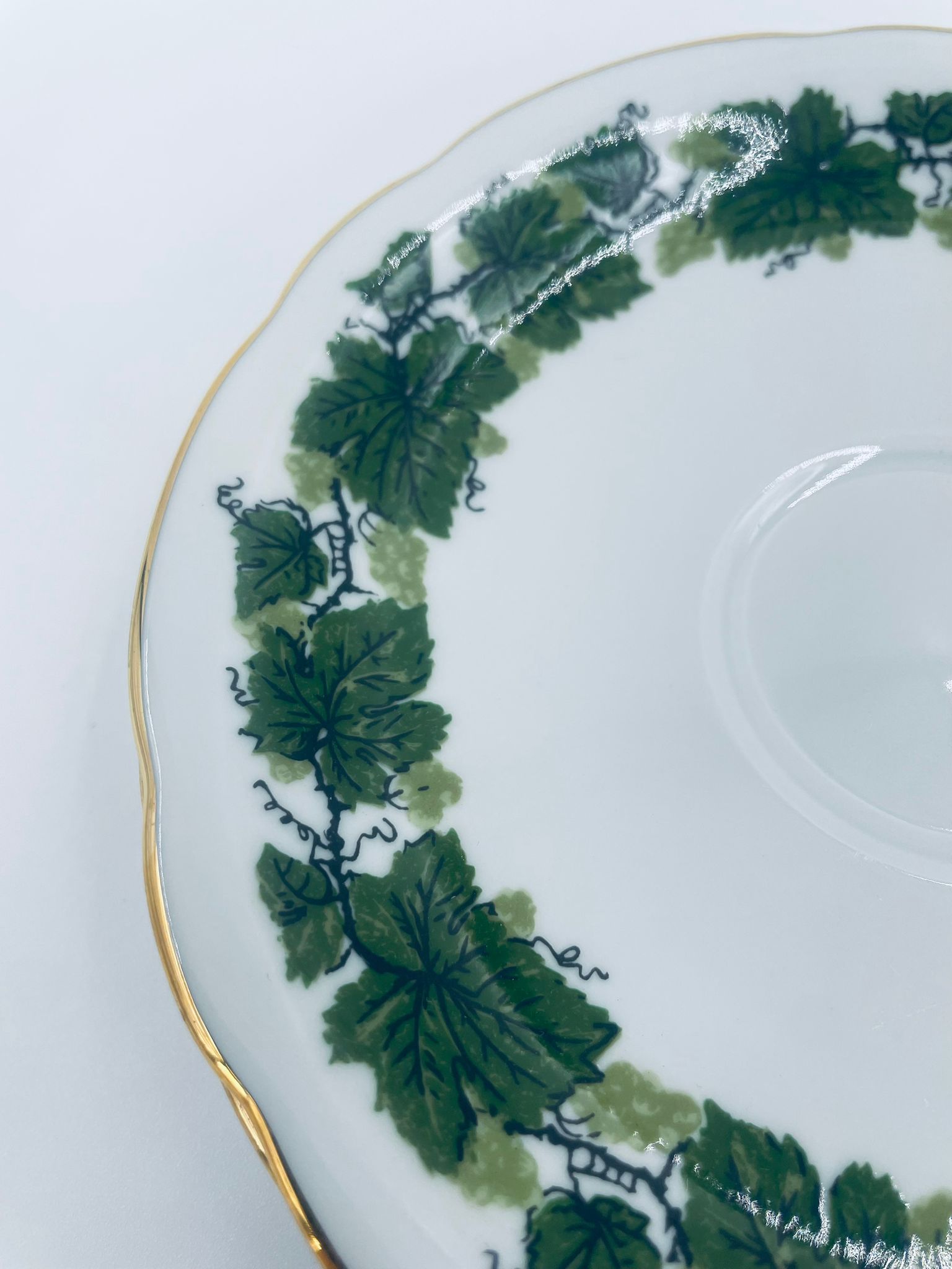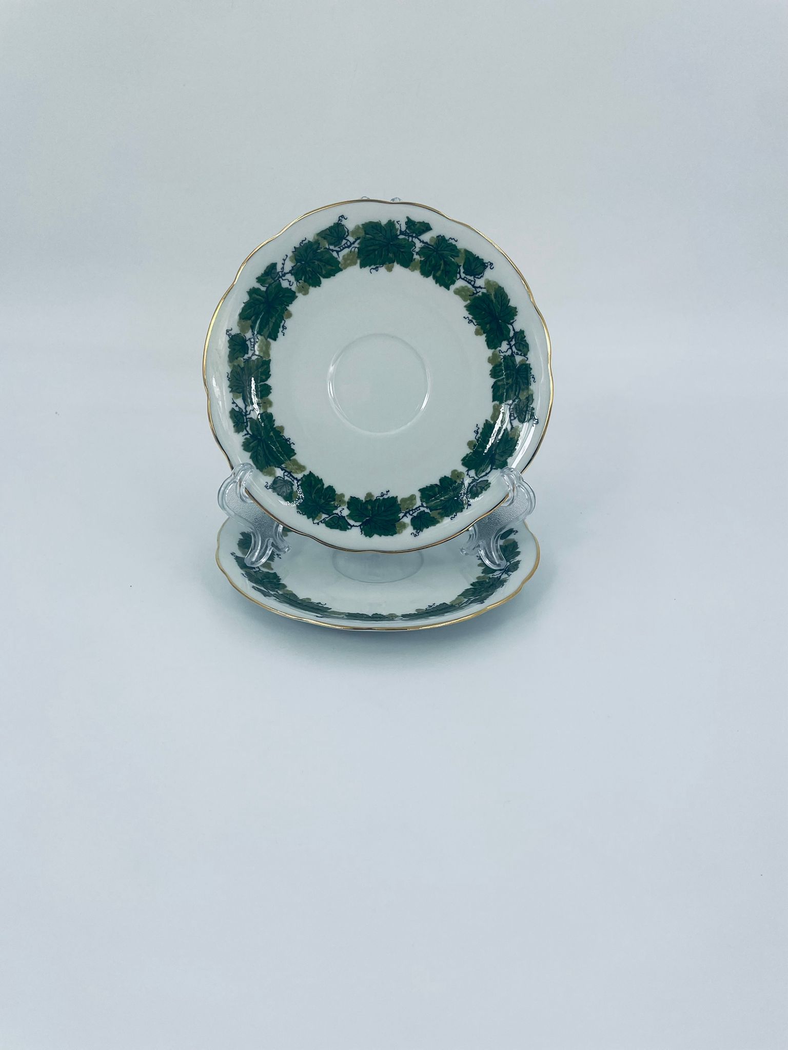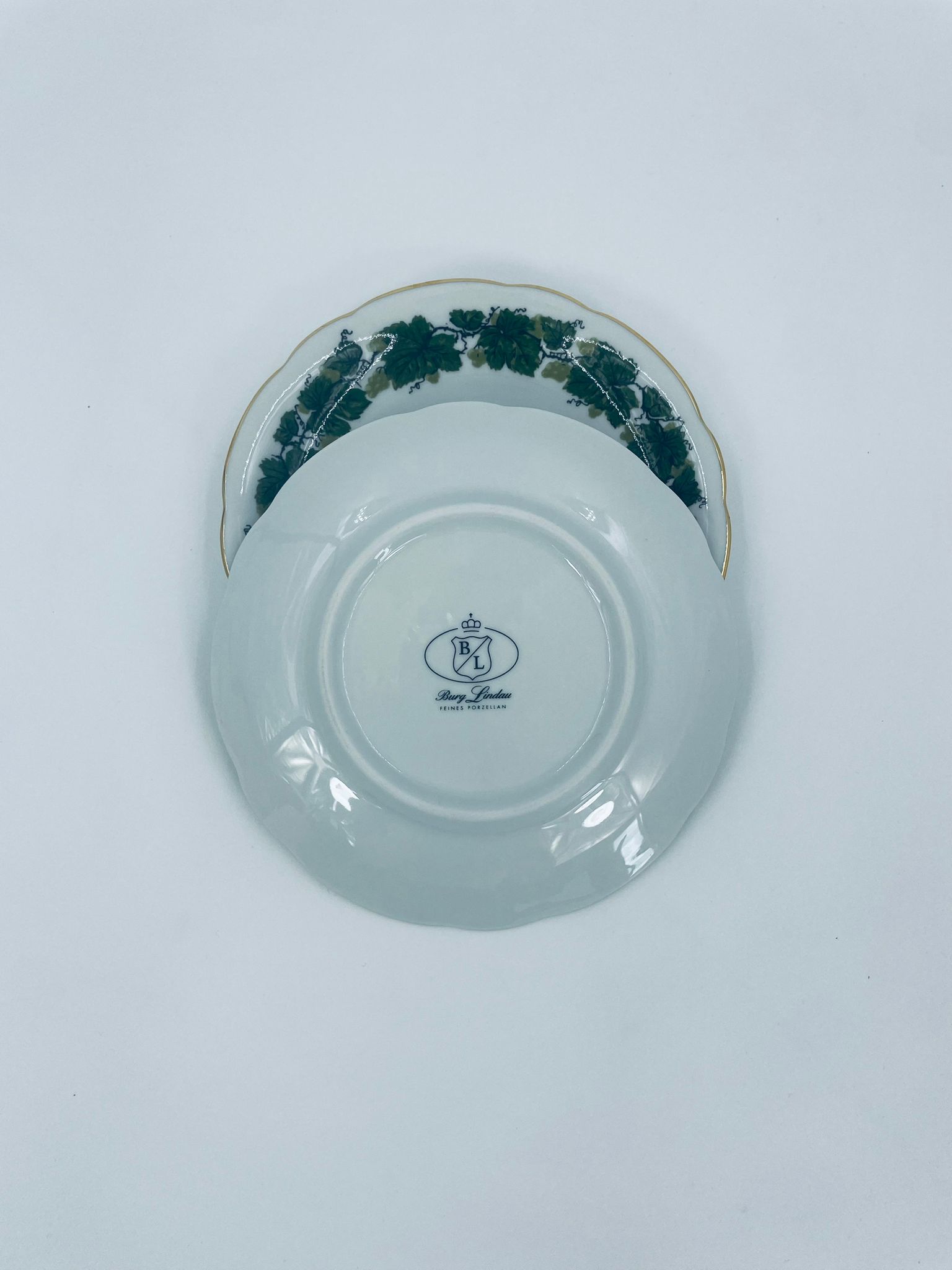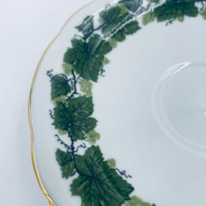 Cup saucer by Burg Lindau, made of high-quality white porcelain, decorated with a garland of green grape leaves, finished with gilding on the wavy rim.