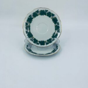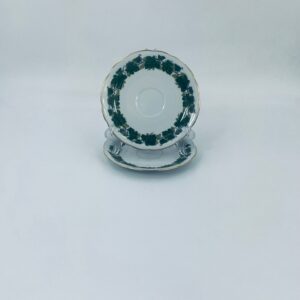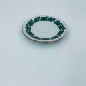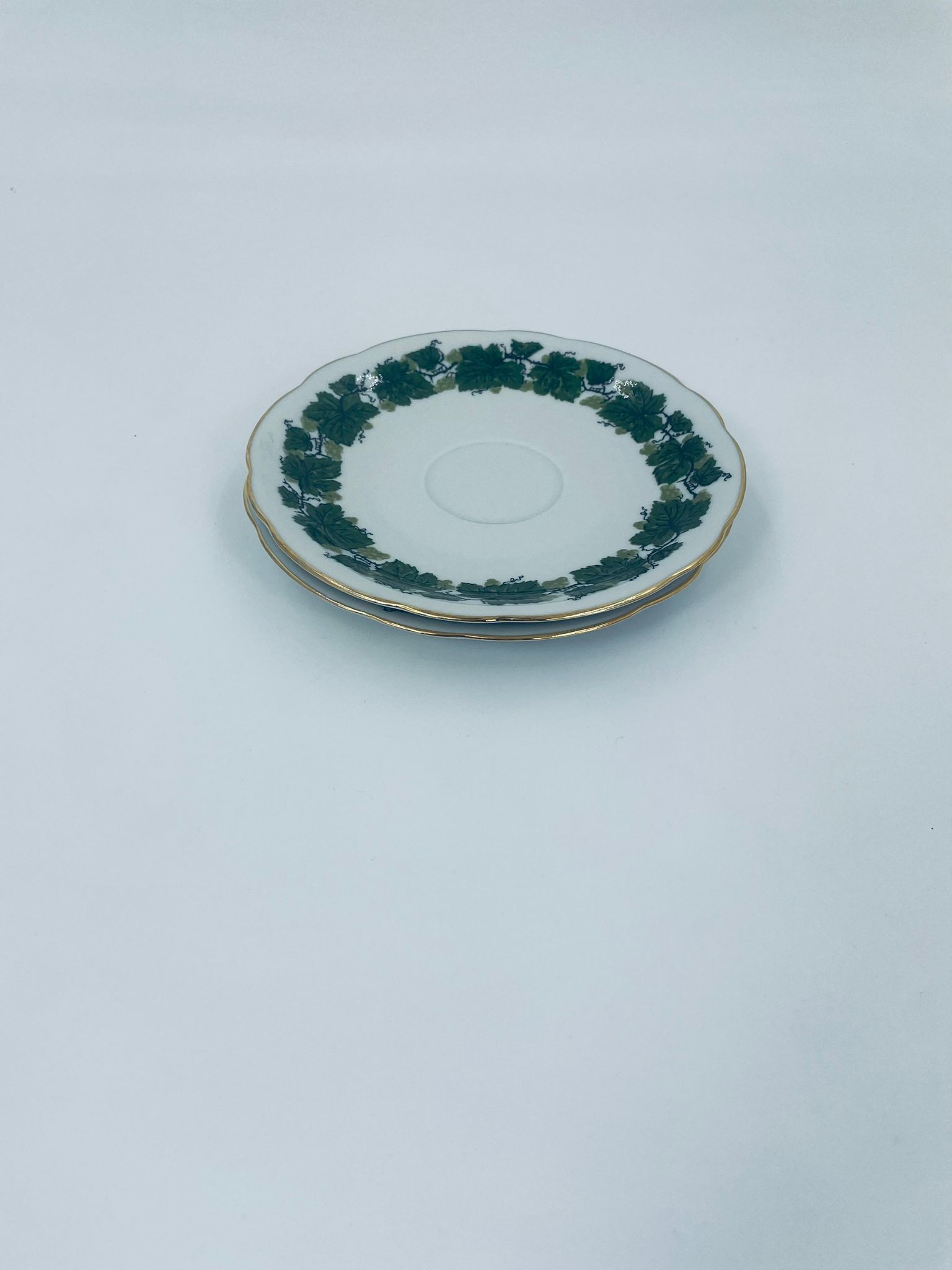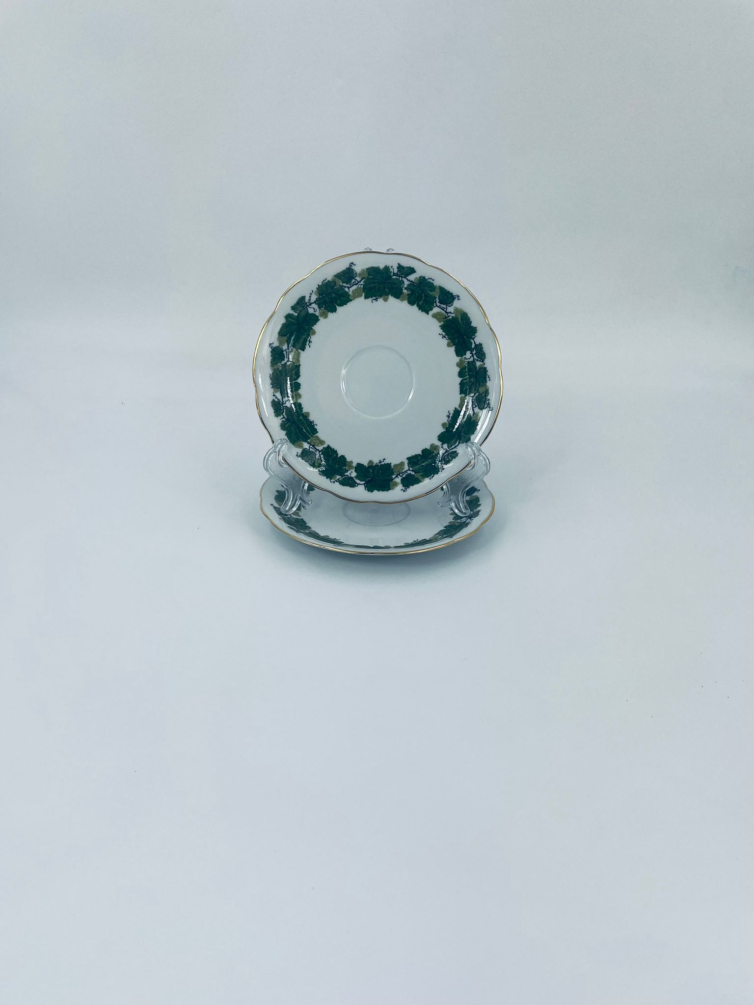 Cup saucer by Burg Lindau, made of high-quality white porcelain, decorated with a garland of green grape leaves, finished with gilding on the wavy rim.