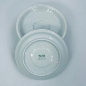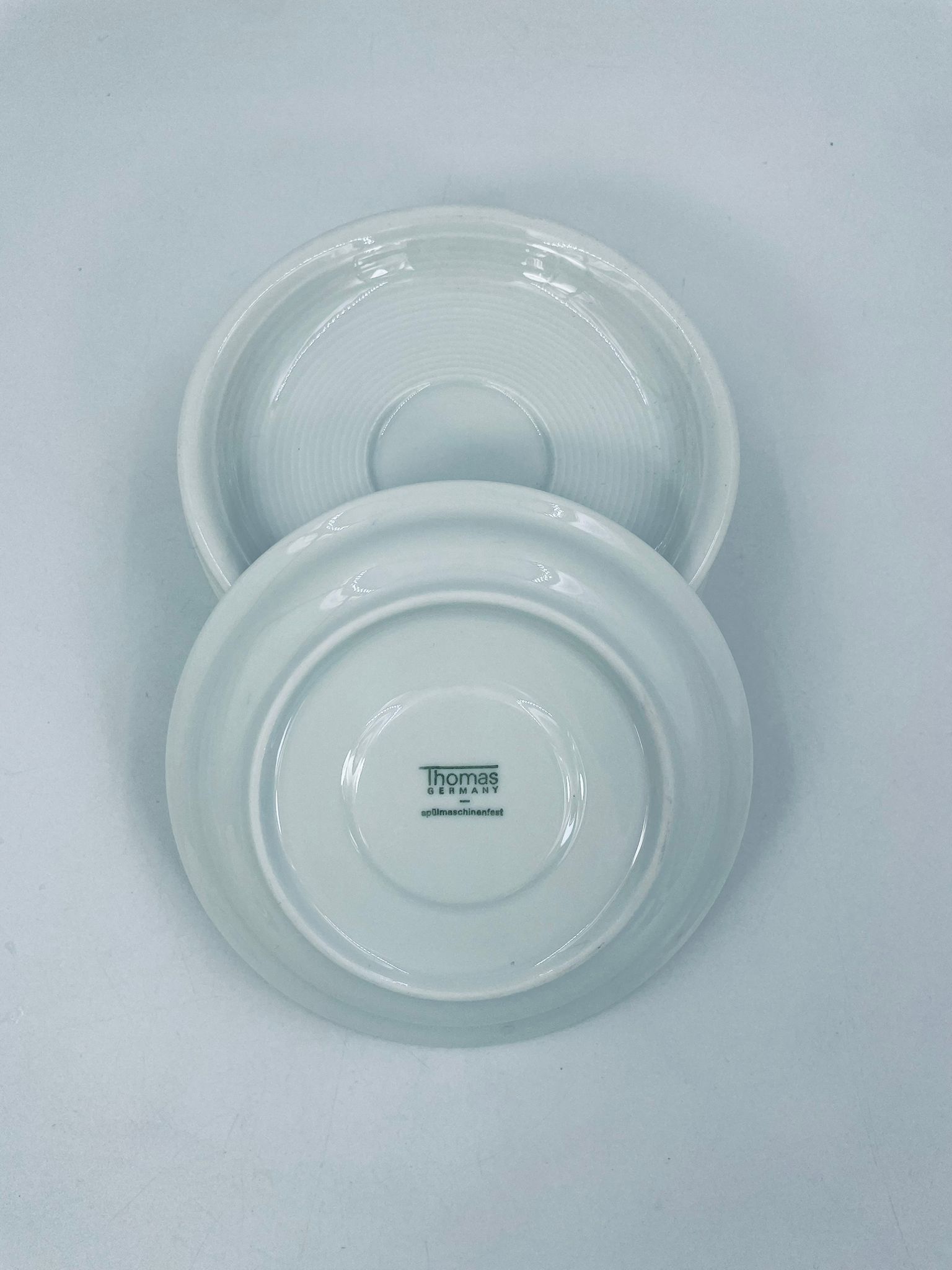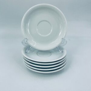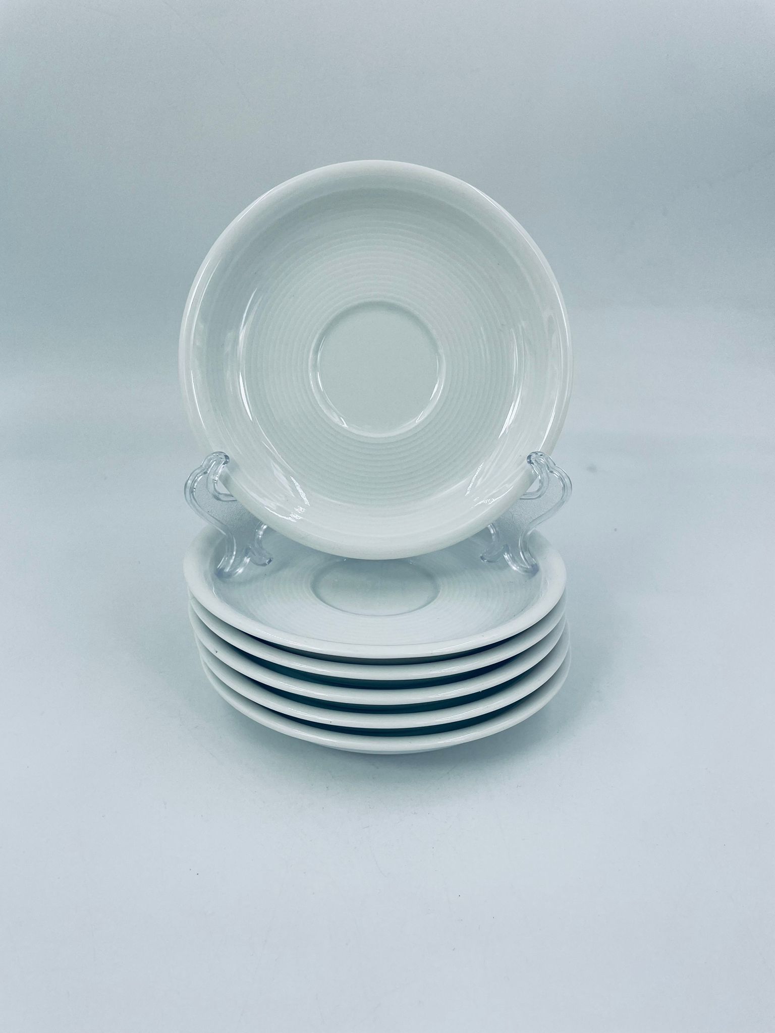 Porcelain saucer in white with a motif of concentric grooves. A piece of tableware that serves as a cup saucer.