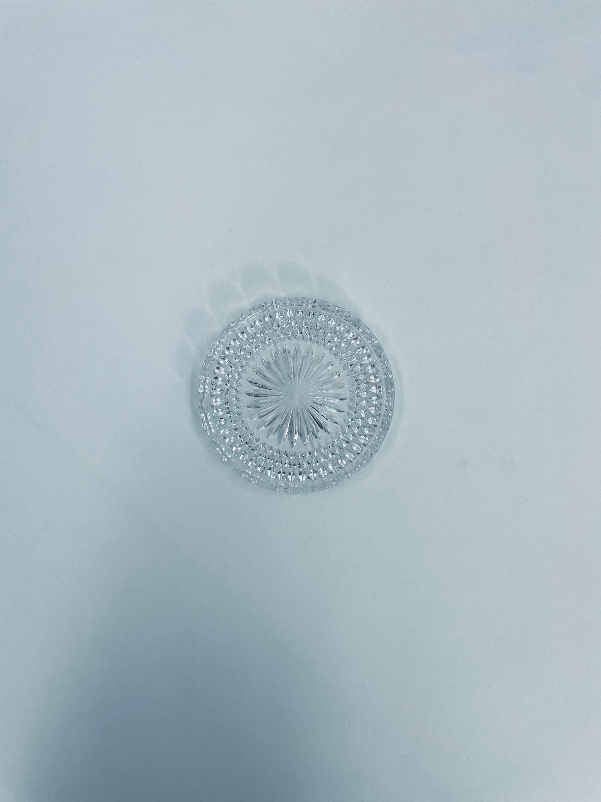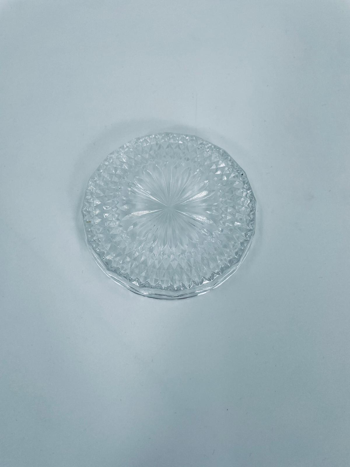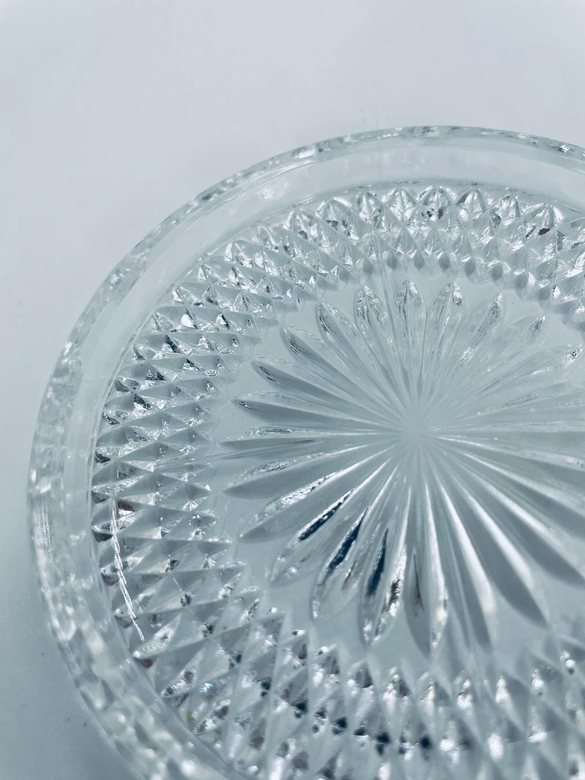 Saucer, saucer from the 1960s in Vintage style, made of high quality clear crystal glass. It features a faceted design with a central radial motif and a decorative rim.
