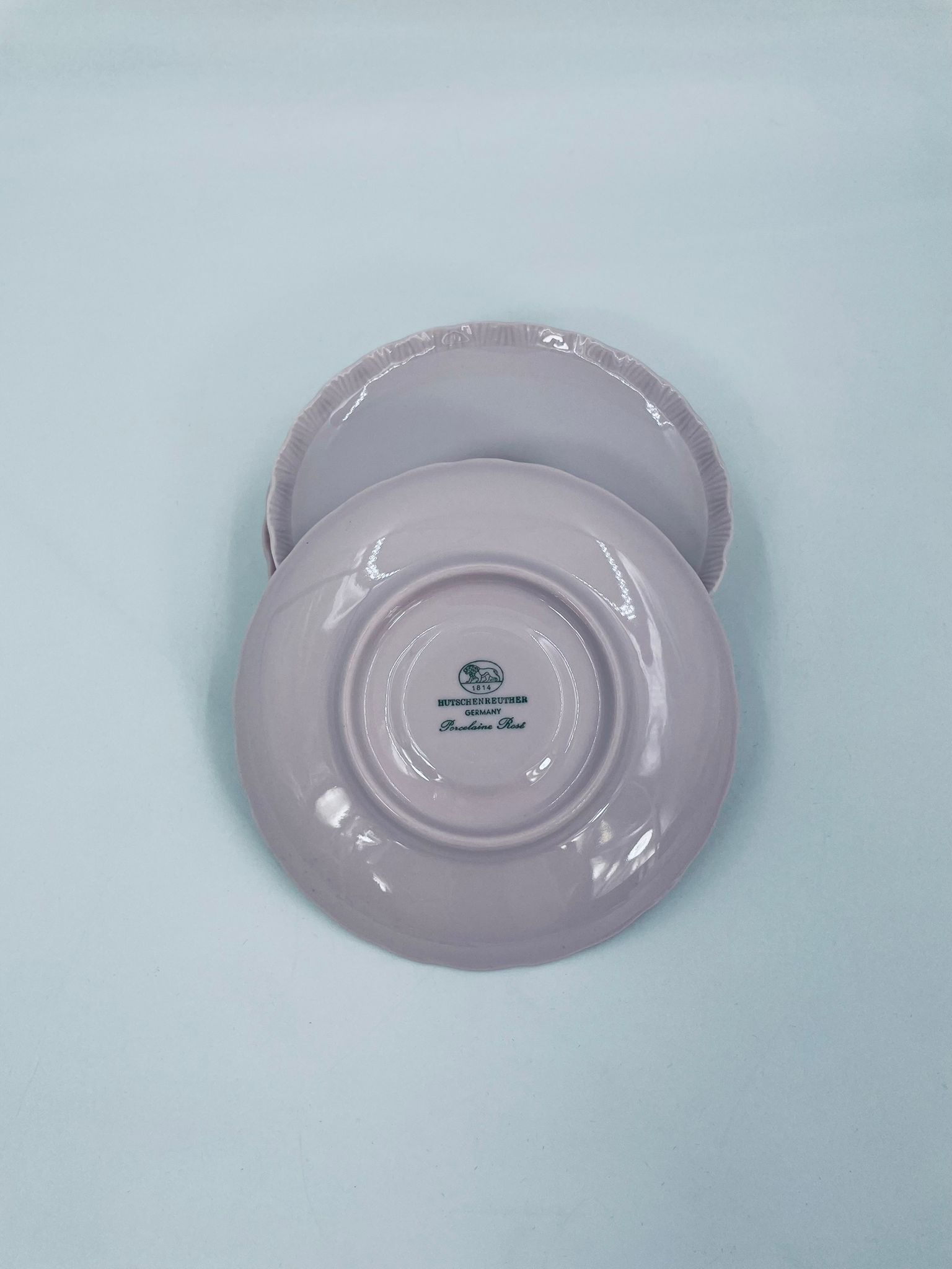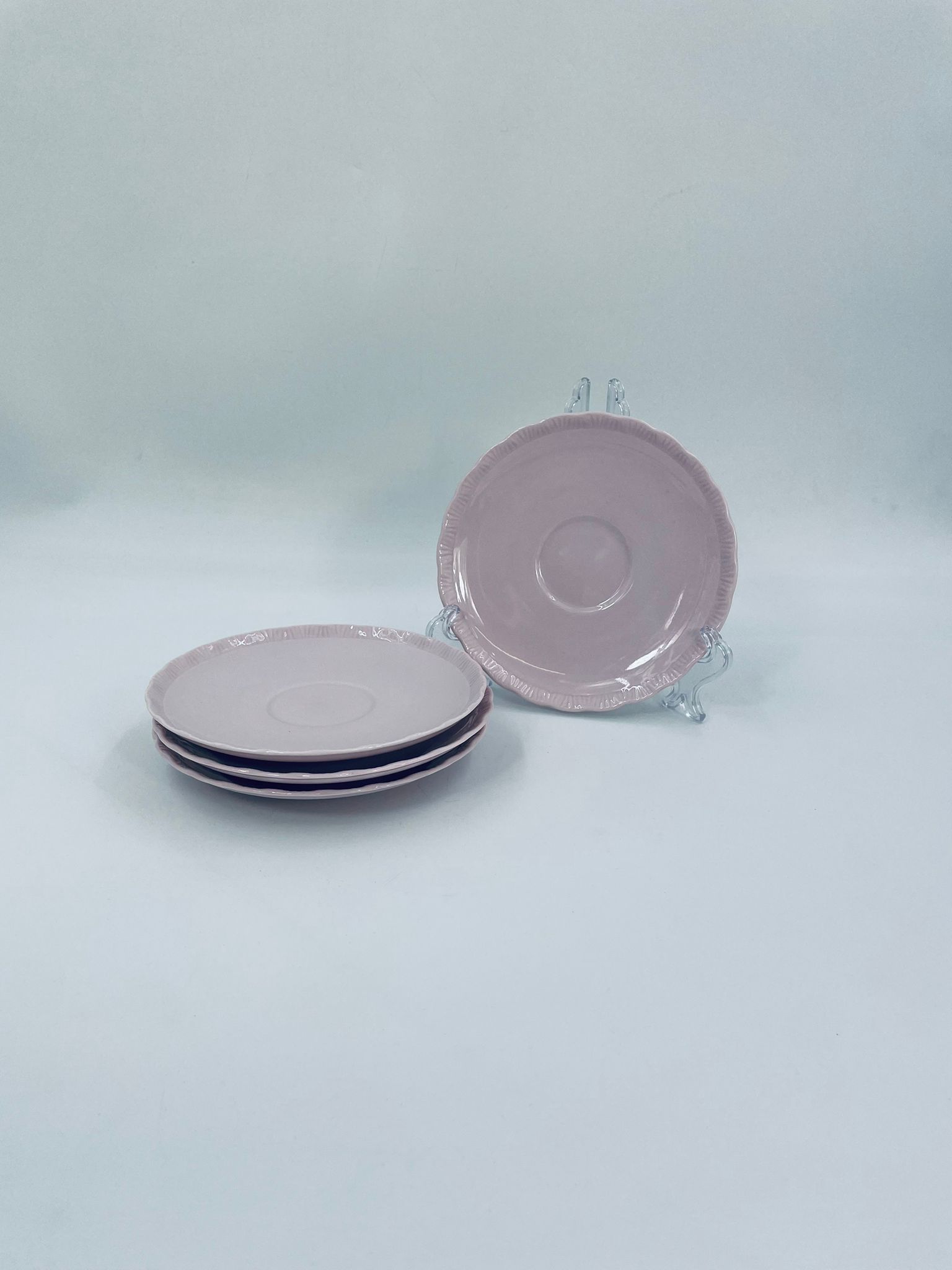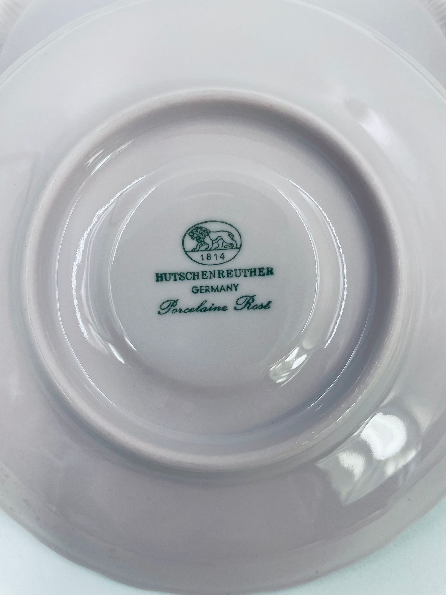 A teacup saucer by the Hutschenreuther label, made of high-quality Rose porcelain. The saucer is characterised by a delicate pastel pink shade, decorative reliefs and a wavy edge.