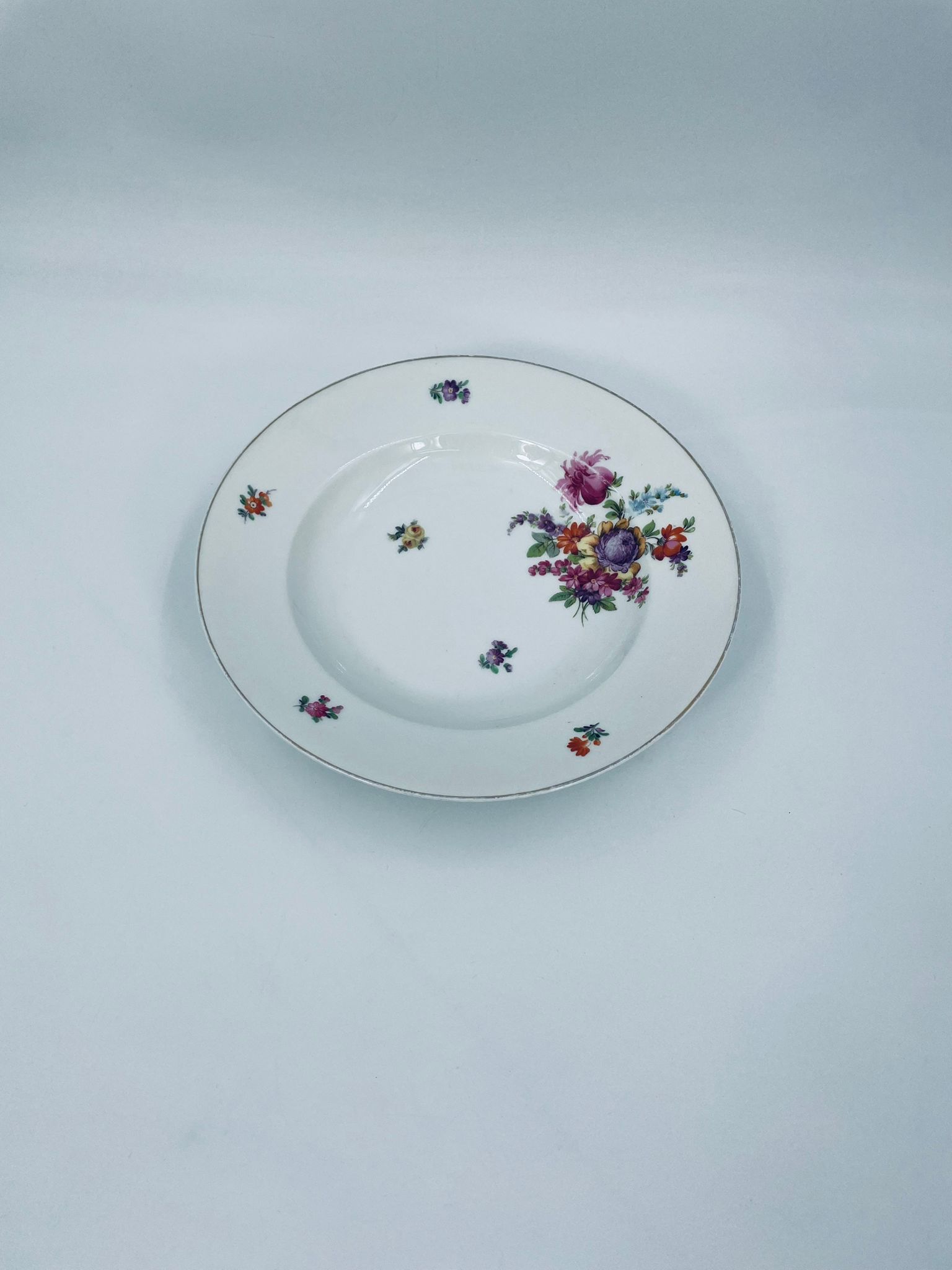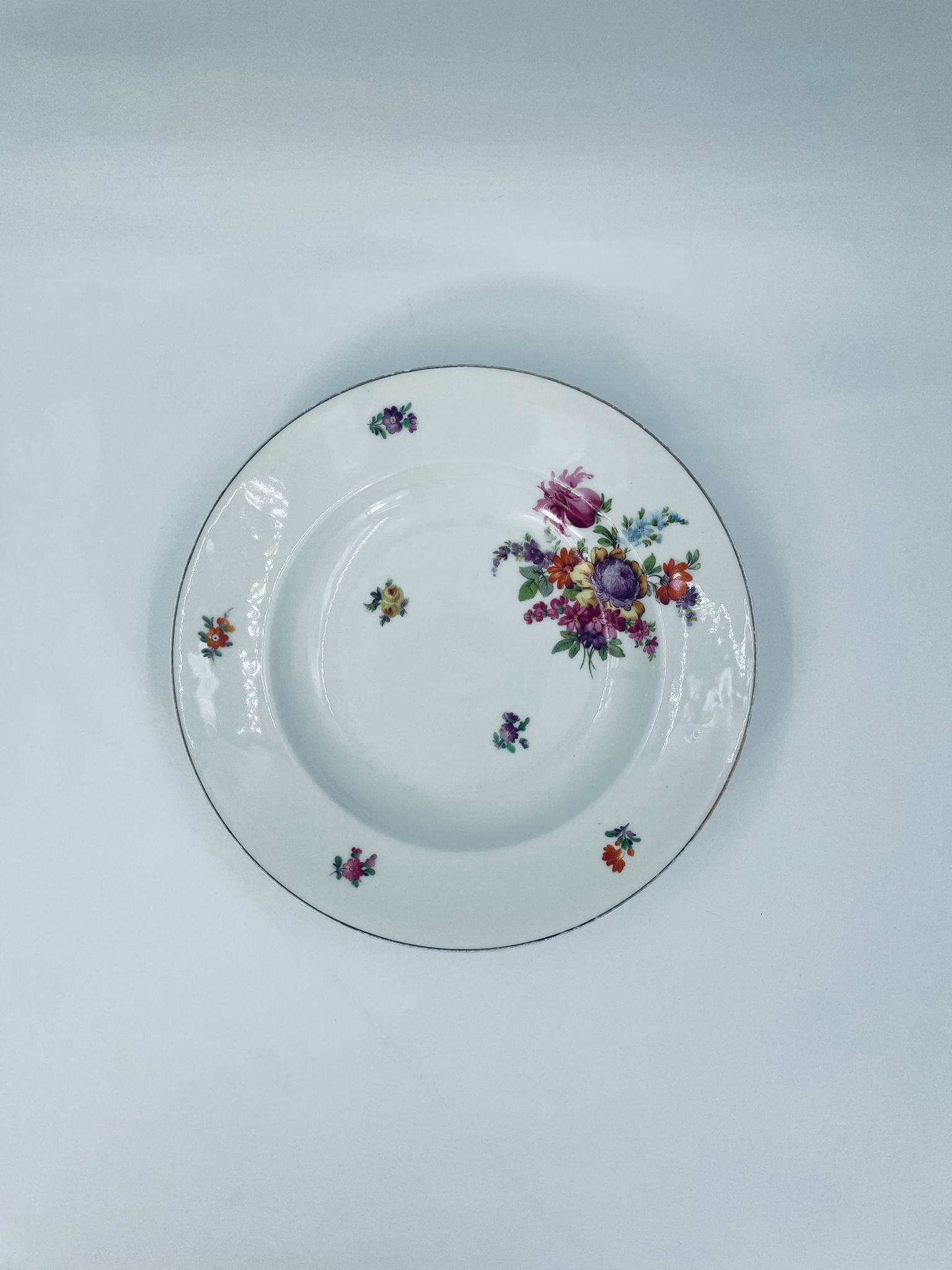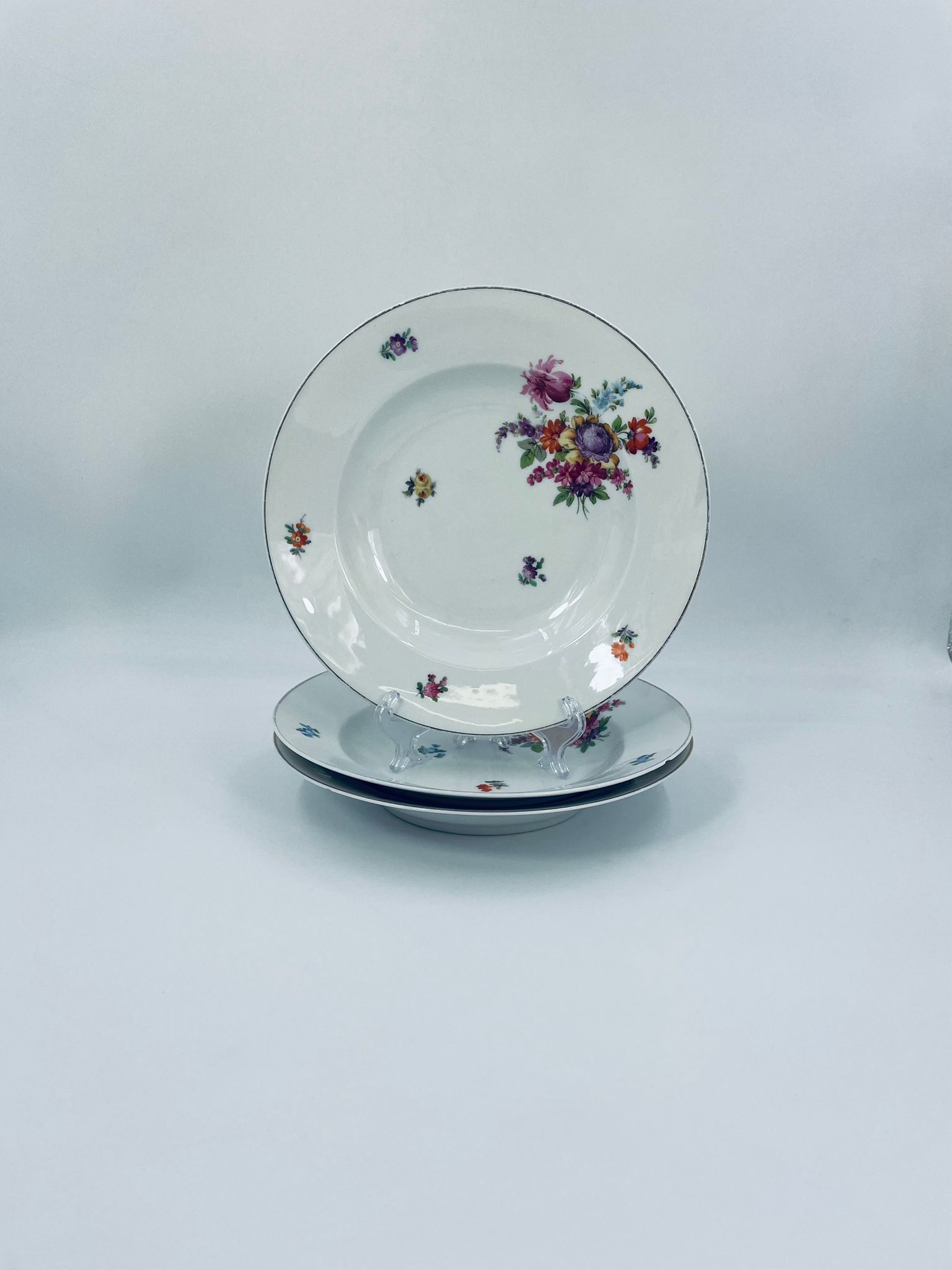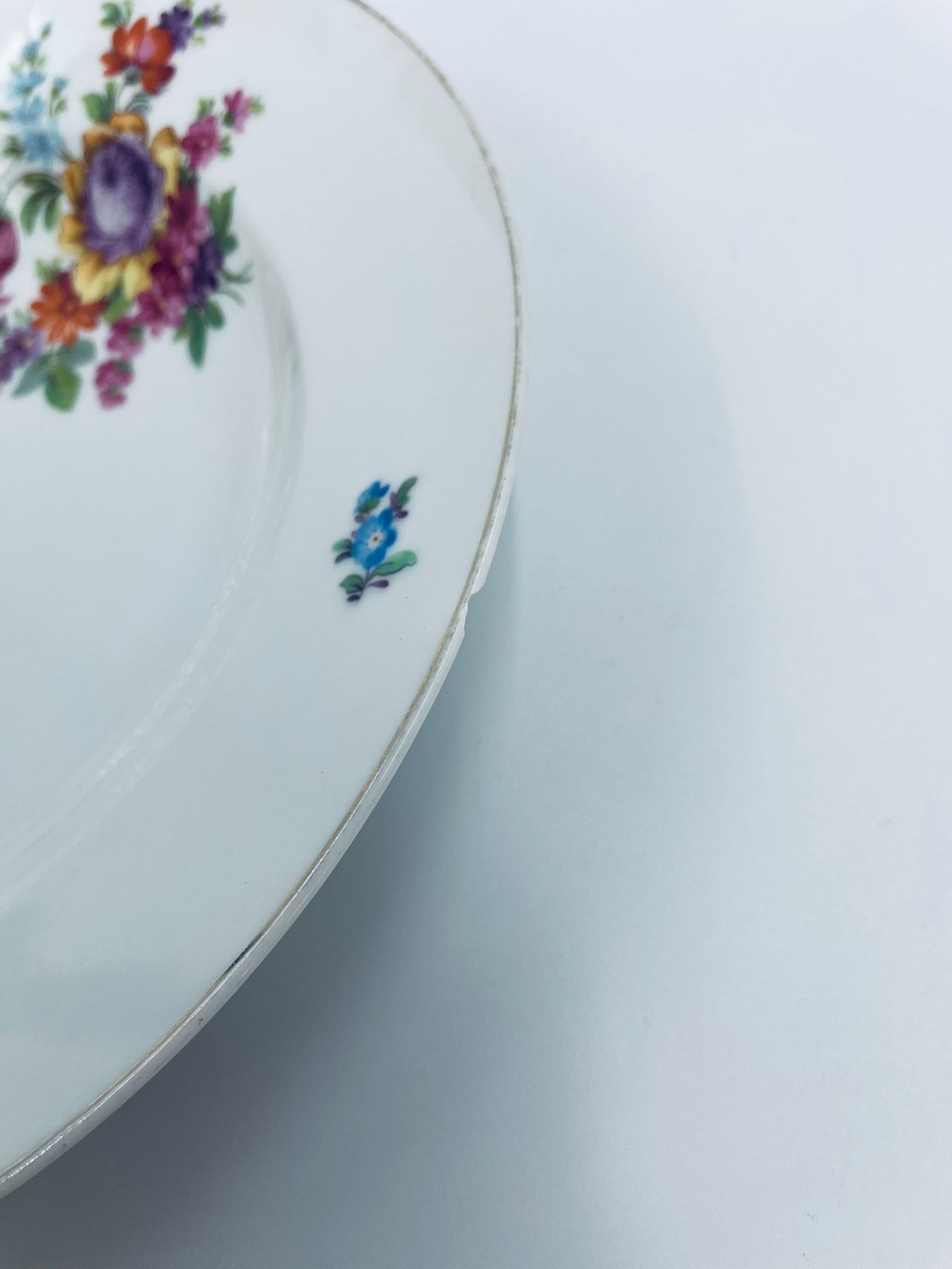 Deep dinner plate by Schumann, made of high quality white porcelain. The plate is decorated with a motif of colourful flowers, finished with gilding on the rim. One plate has damage and rubbing to the gilding.
