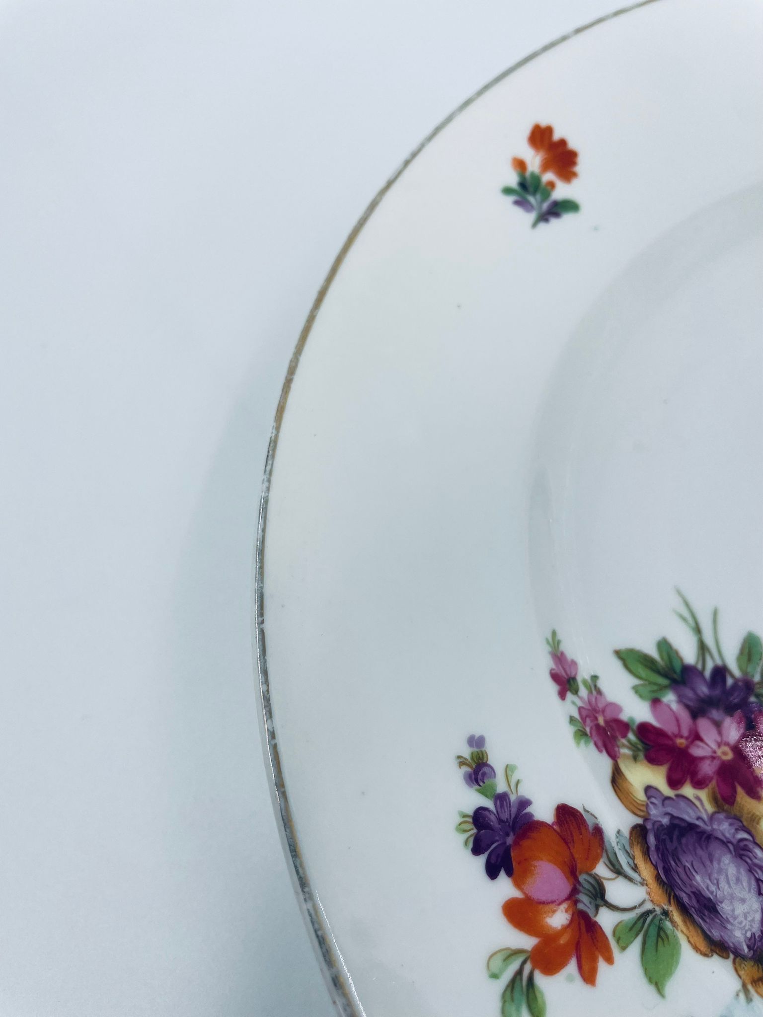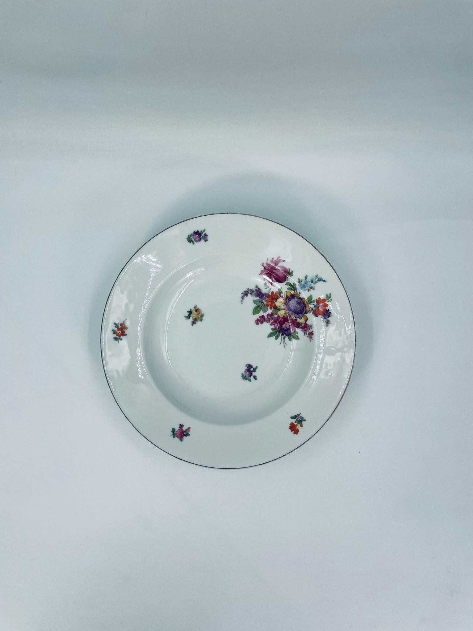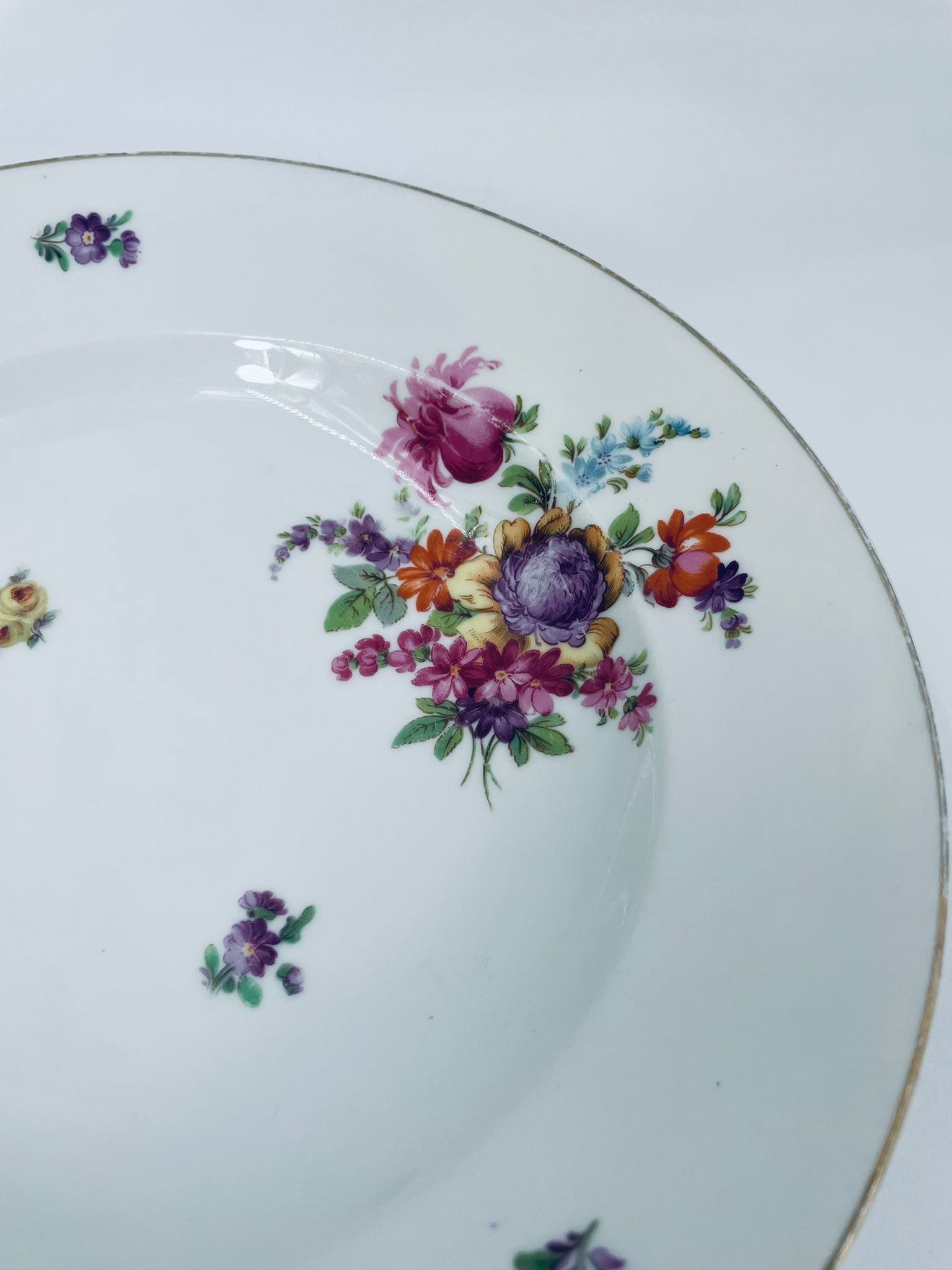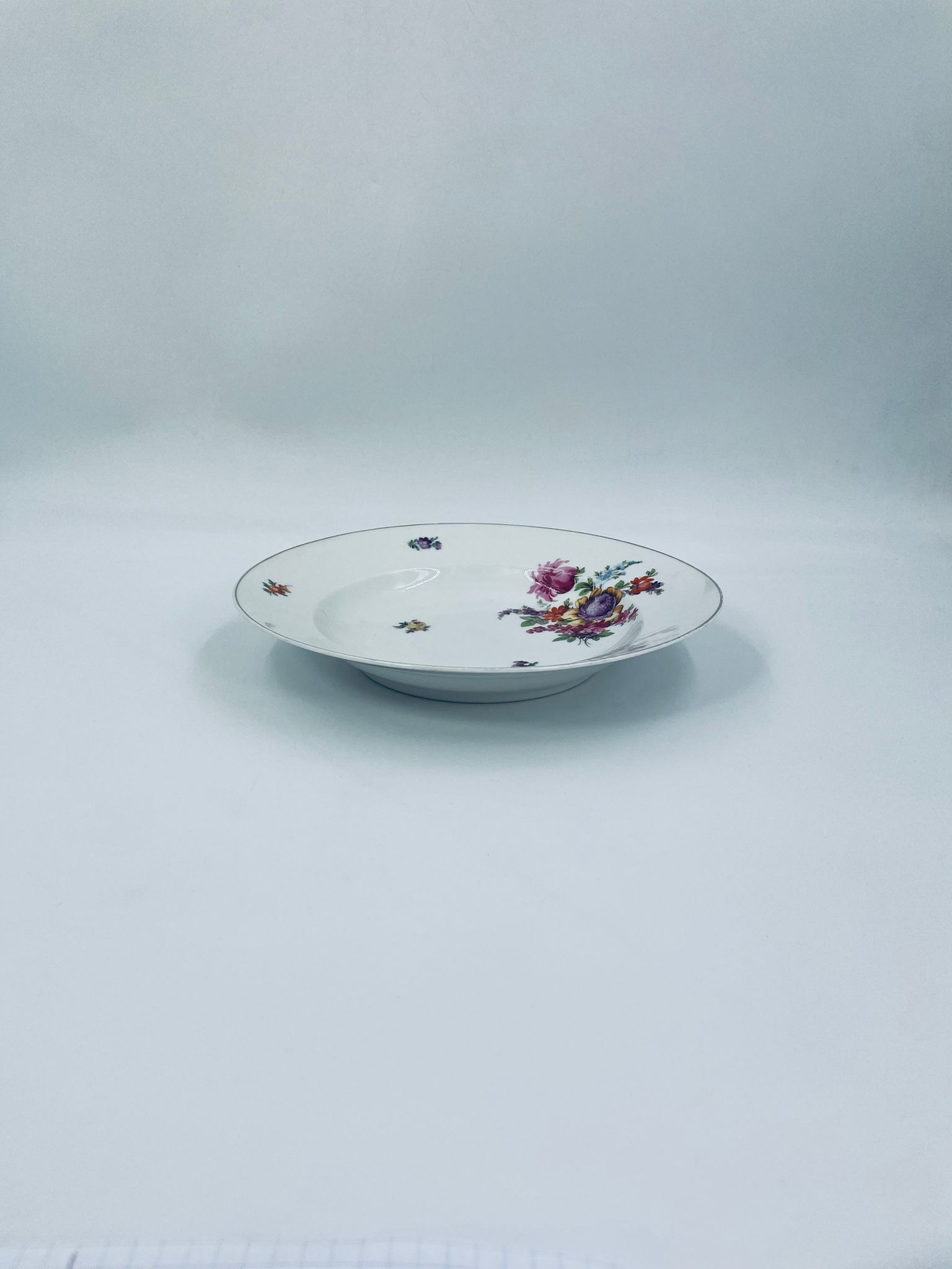 Deep dinner plate by Schumann, made of high quality white porcelain. The plate is decorated with a motif of colourful flowers, finished with gilding on the rim. One plate has damage and rubbing to the gilding.