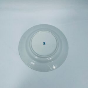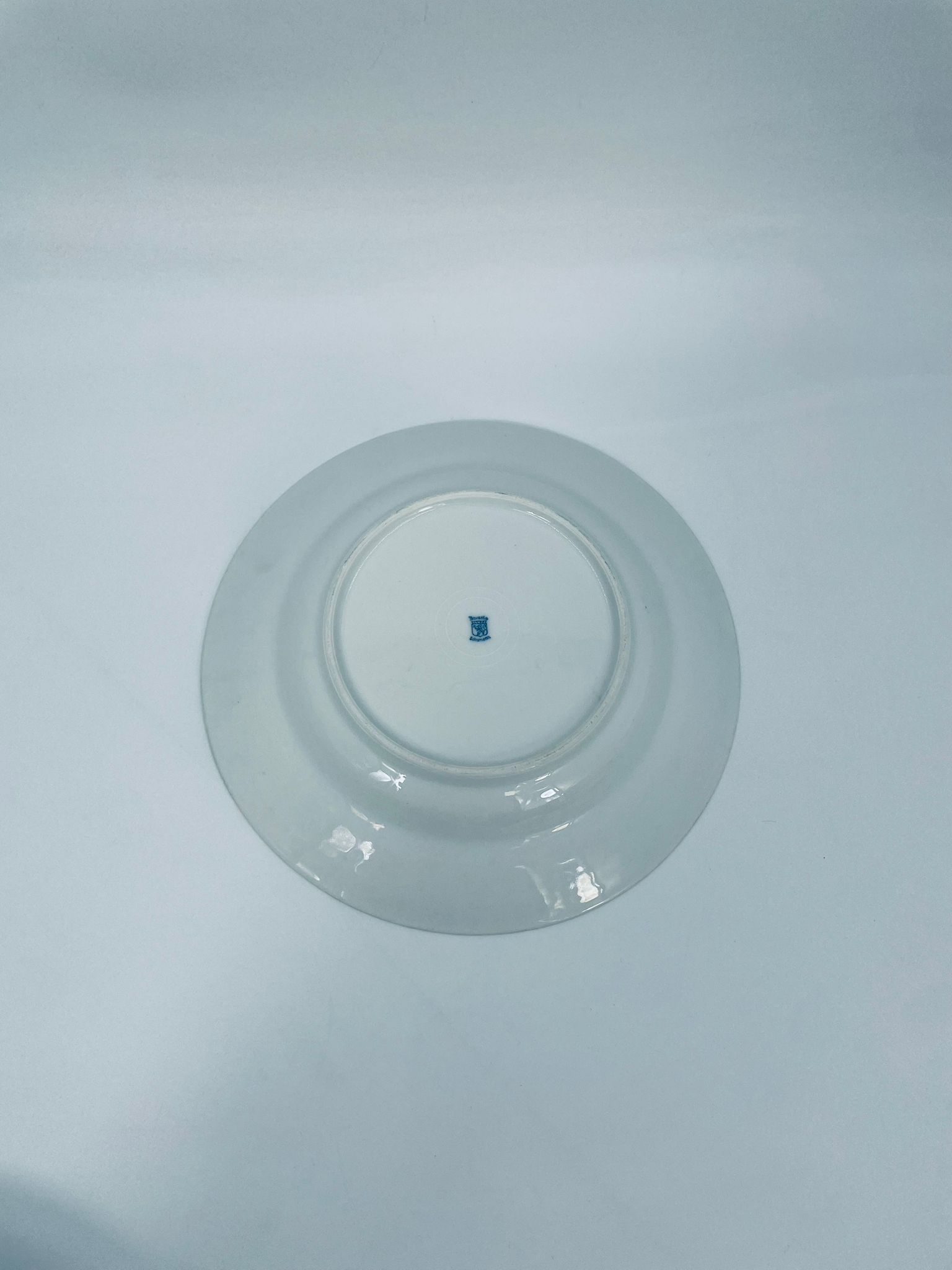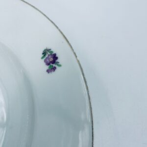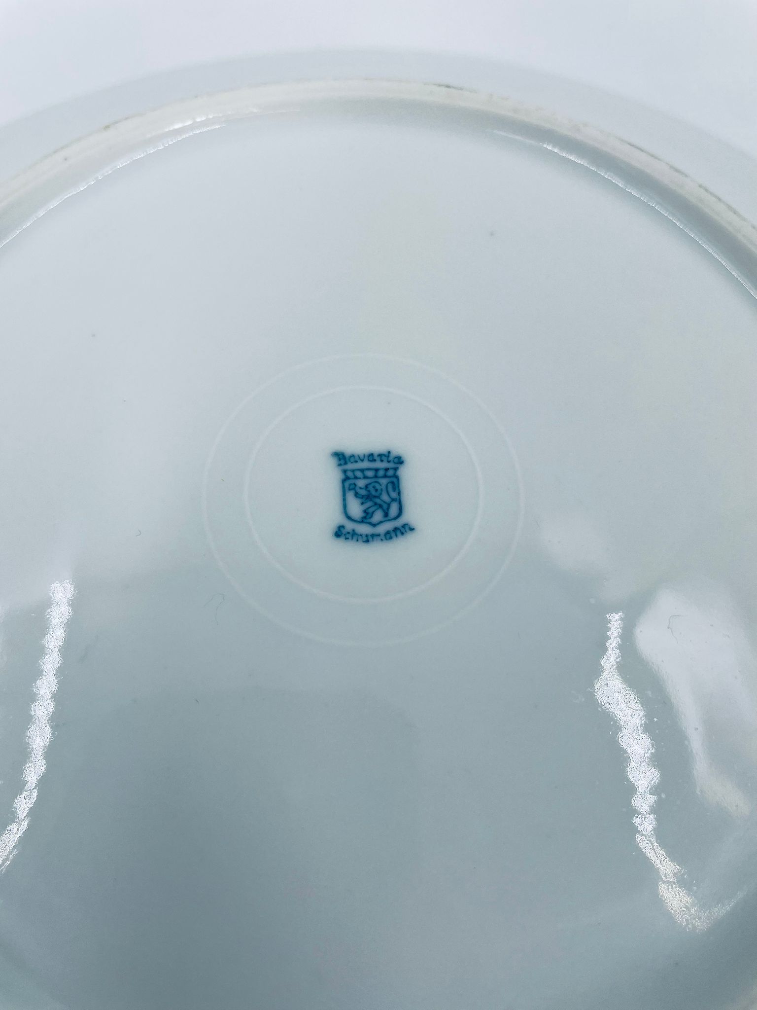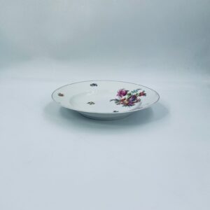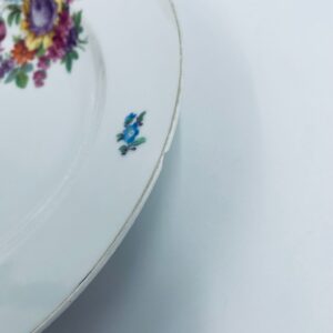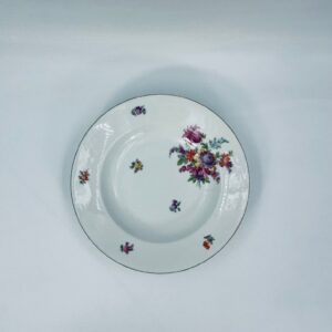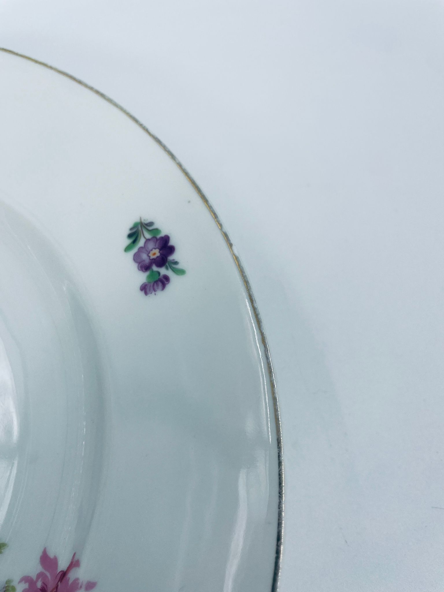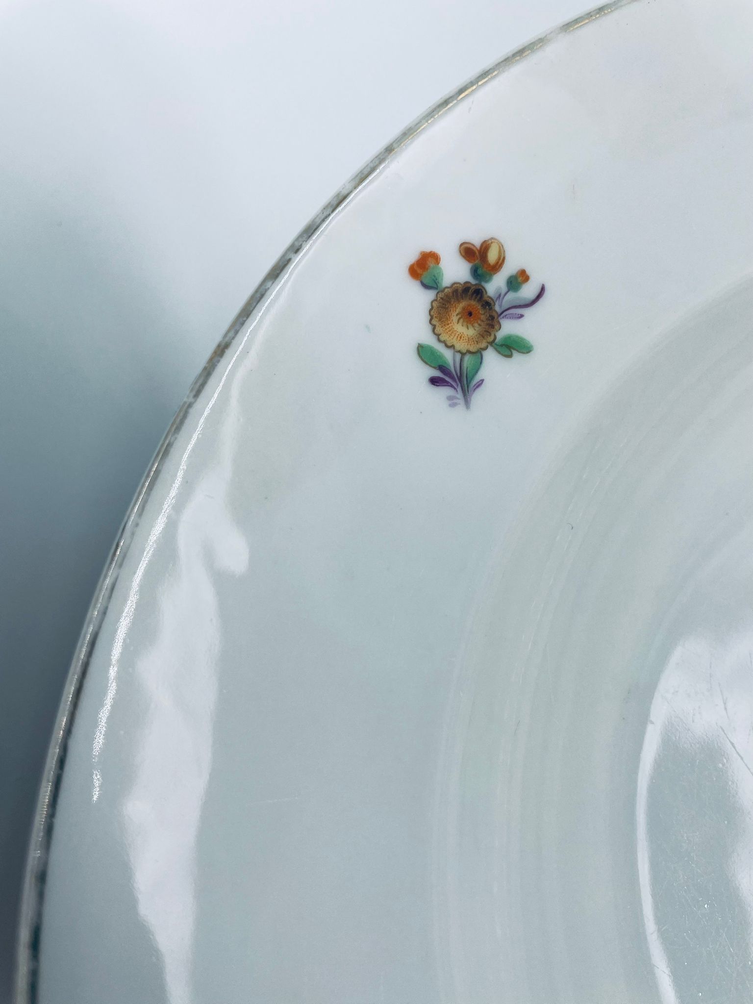 Deep dinner plate by Schumann, made of high quality white porcelain. The plate is decorated with a motif of colourful flowers, finished with gilding on the rim. One plate has damage and rubbing to the gilding.