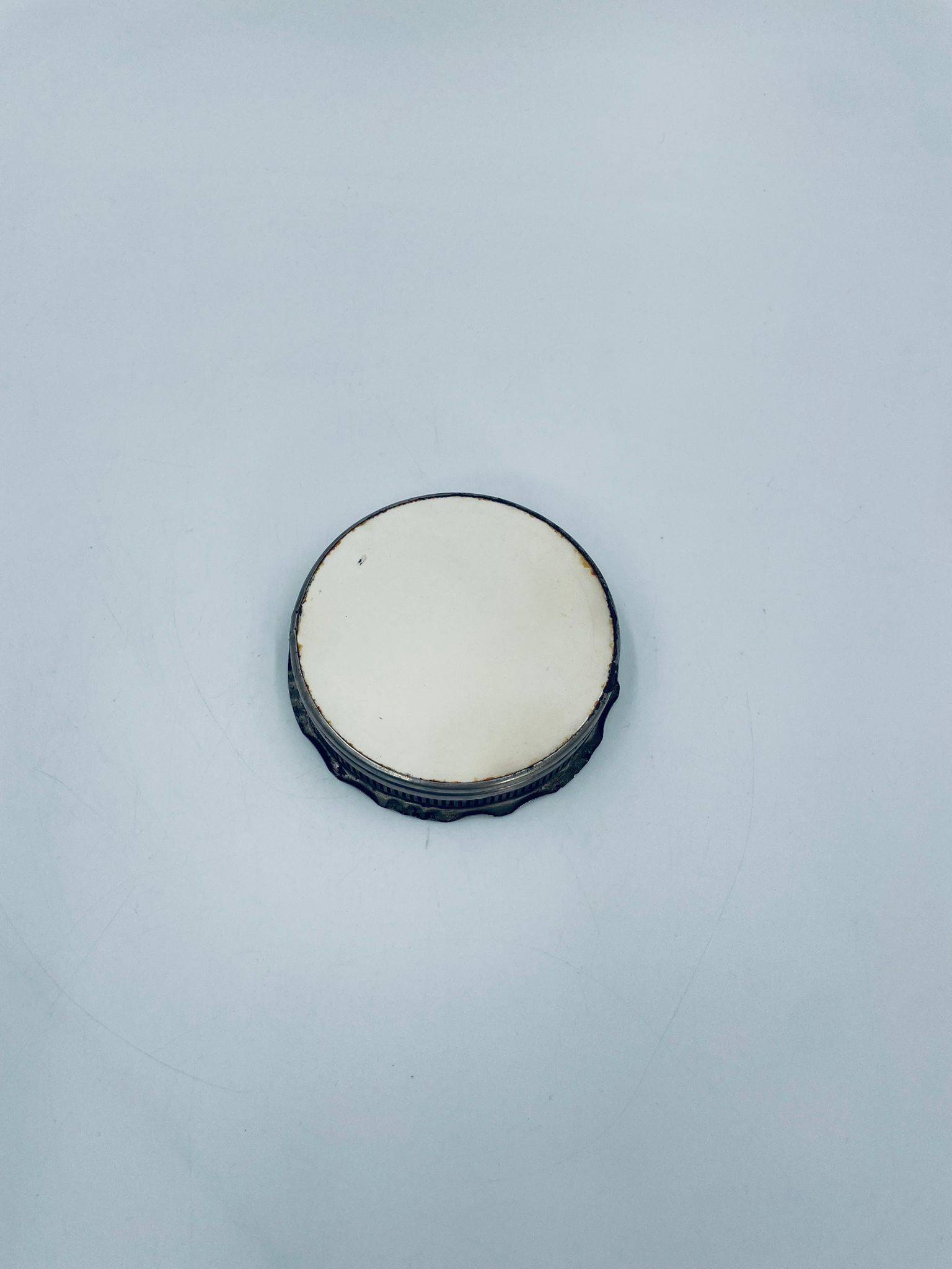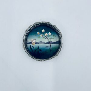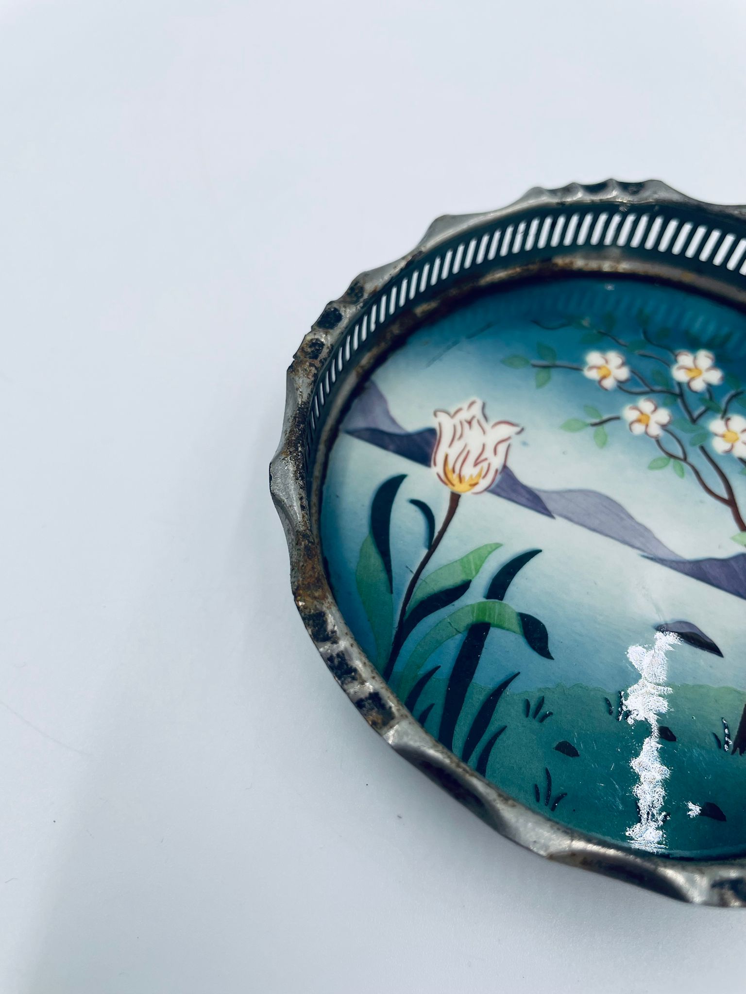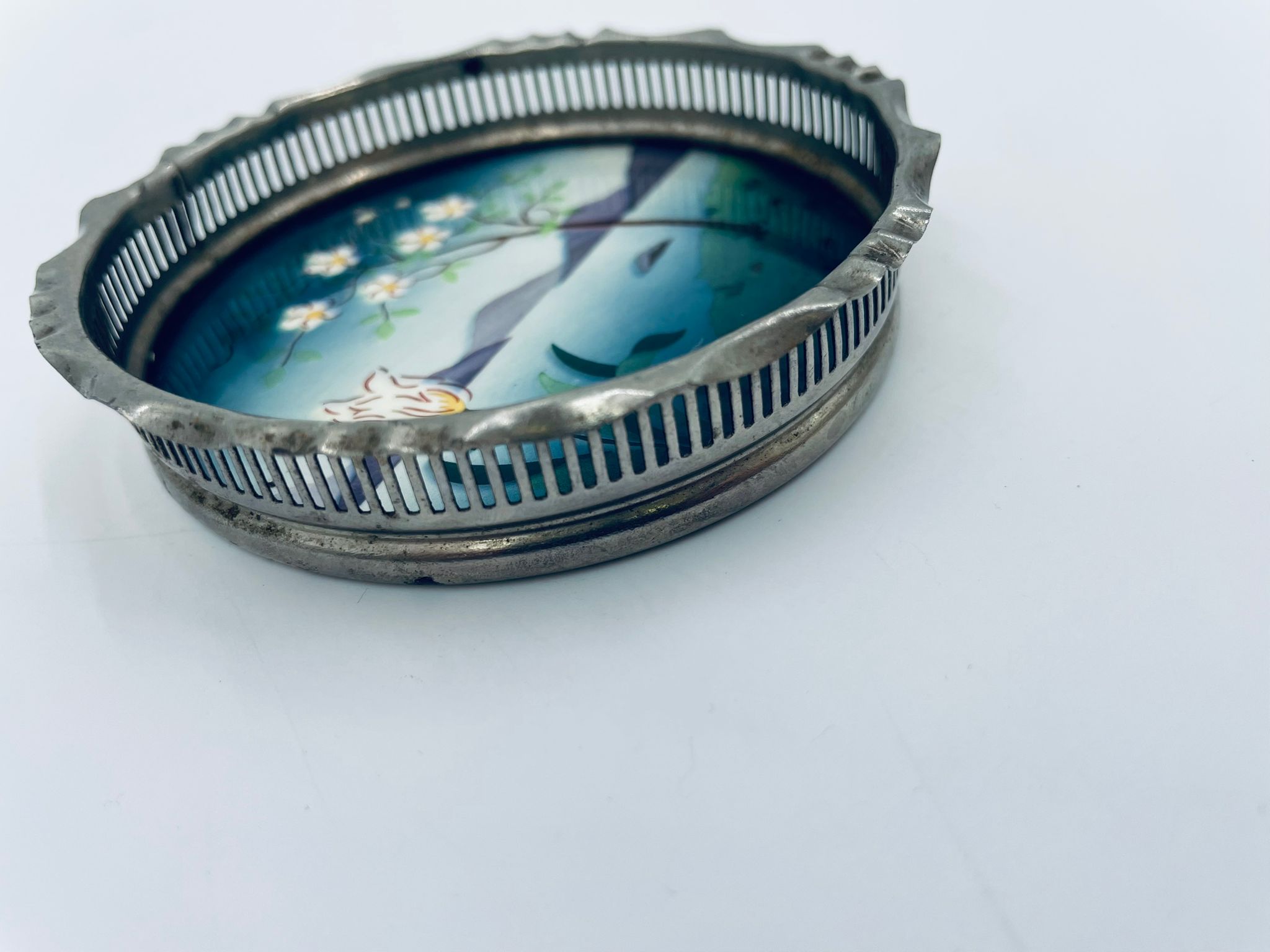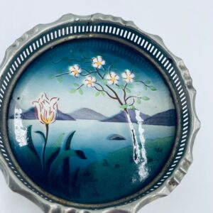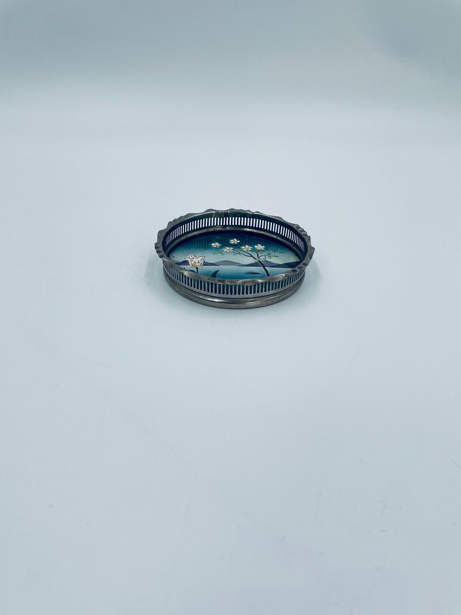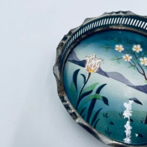 Secesyjna podstawka pod szklankę. Podstawka posiada porcelanie spod, emaliowany, ręcznie malowany w motyw przedstawiający kwiat, drzewo, wzgórza i jezioro oraz metalowe, ażurowe obrzeże. Posiada przetarcie i widoczna rdzę.