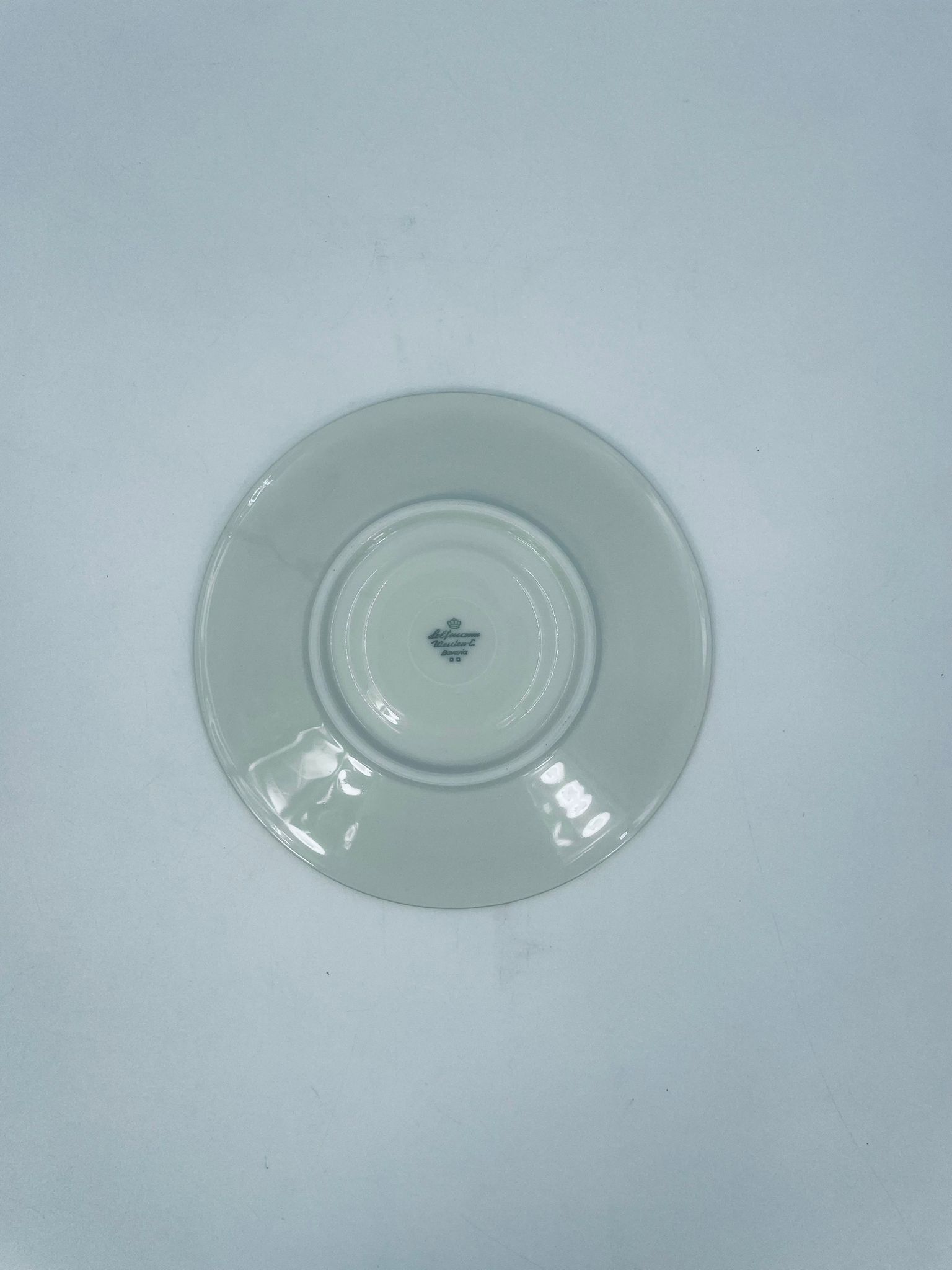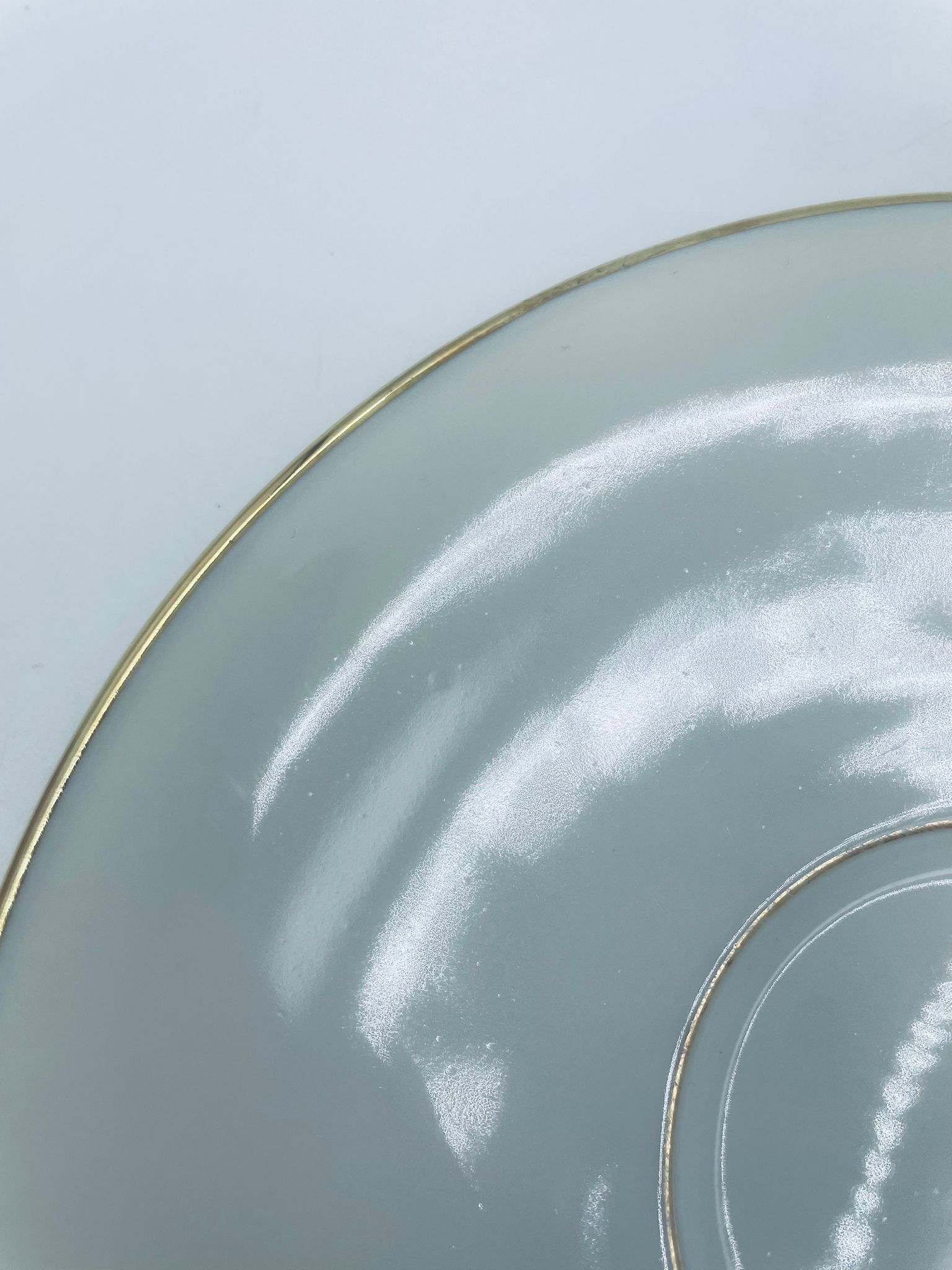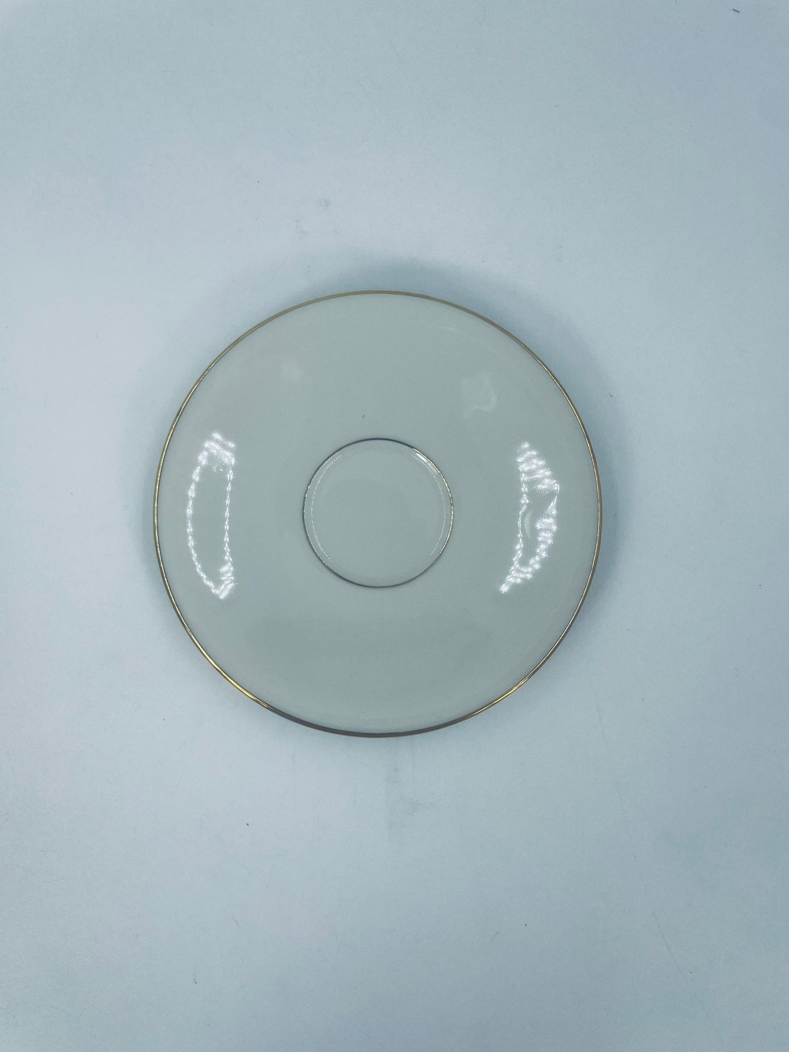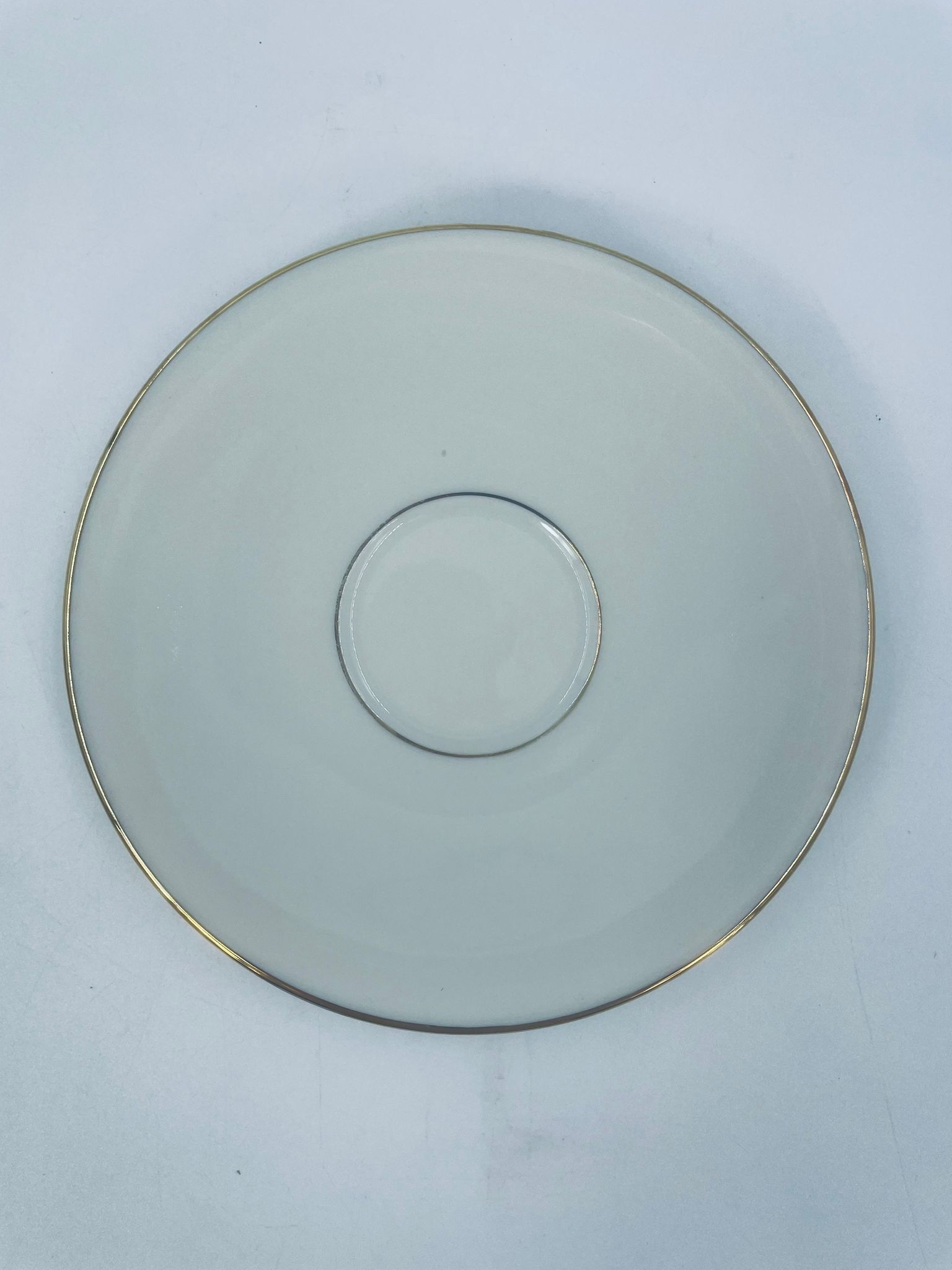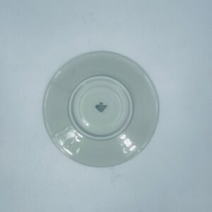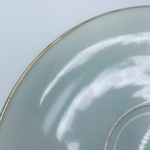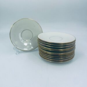 The saucers are made of ecru coloured porcelain with a gold finish on the rims. The saucers have slight rubbing in the centre from the cups.