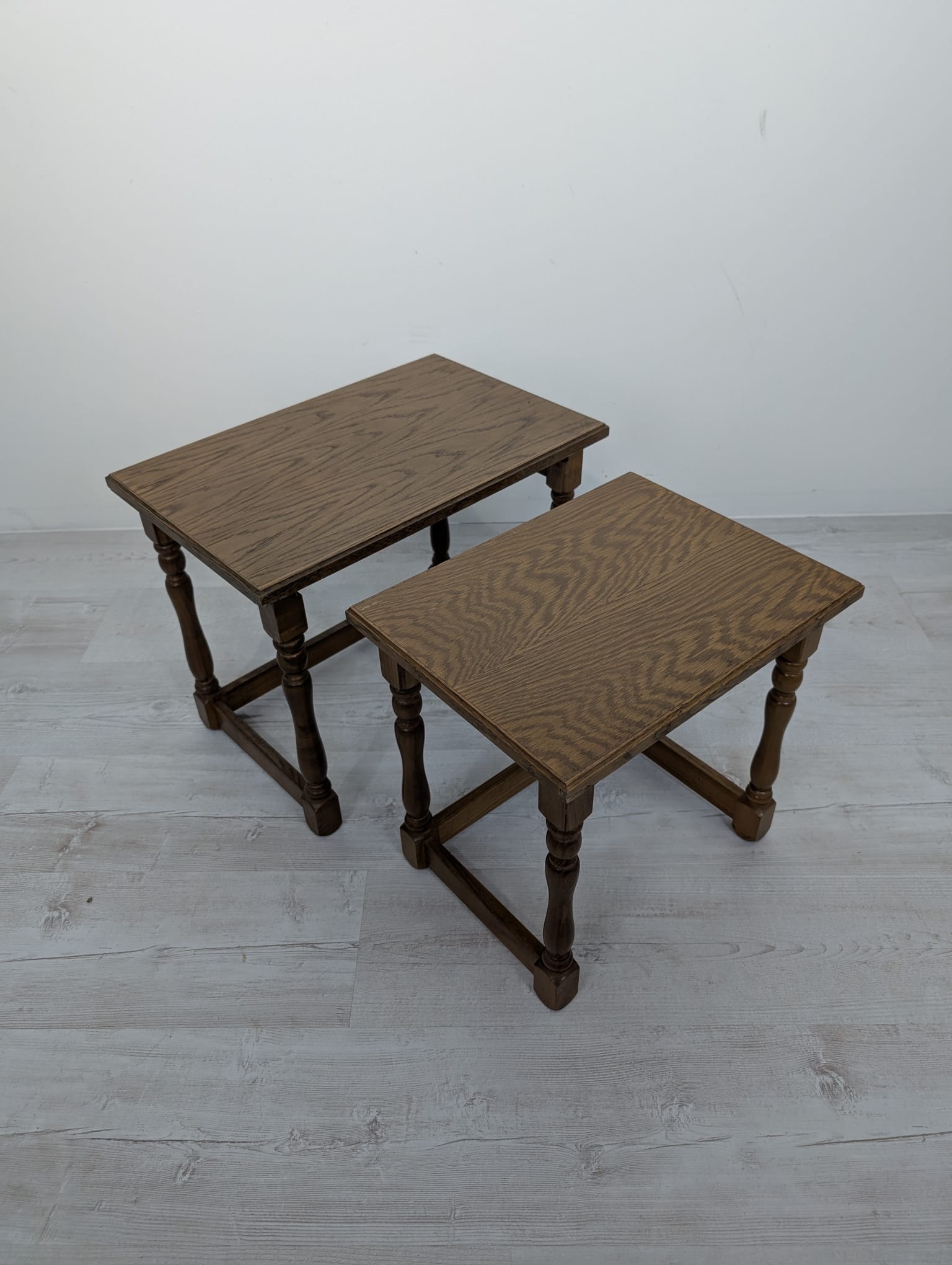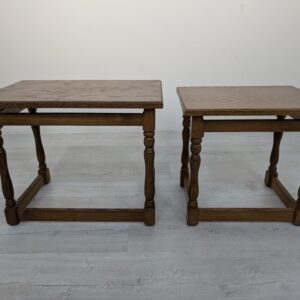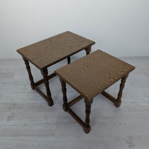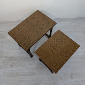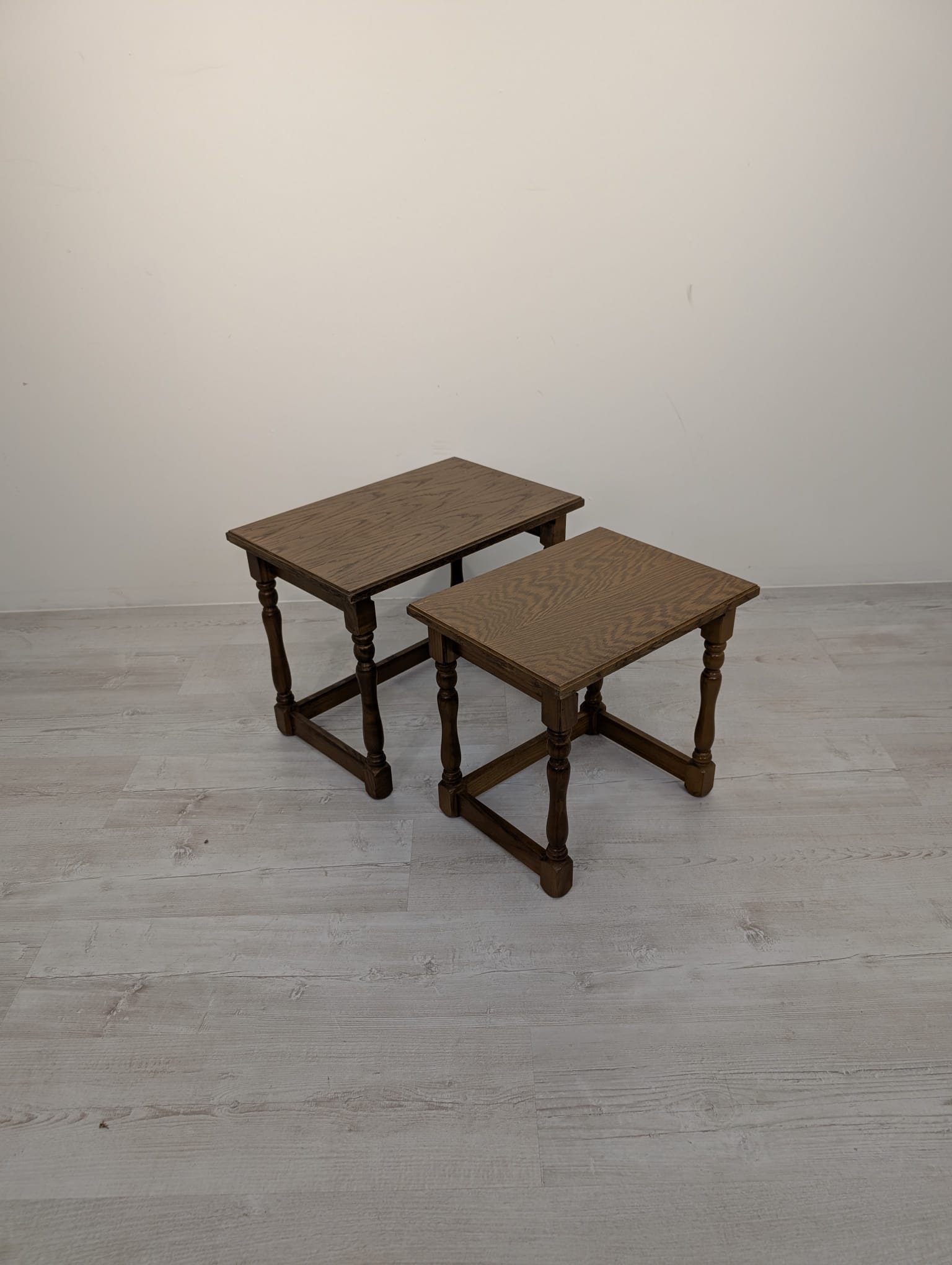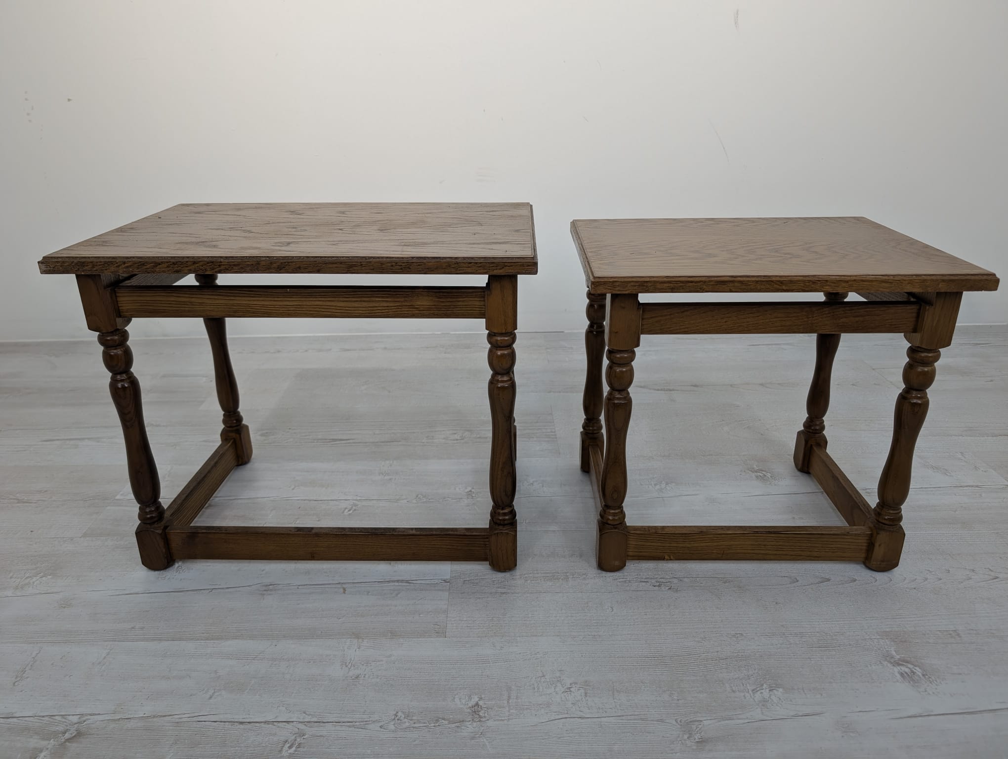 A set of two vintage style wooden coffee tables made of oak. The tables are in used condition but still look aesthetically pleasing. They can be an interesting decorative element in the living room or any other room.