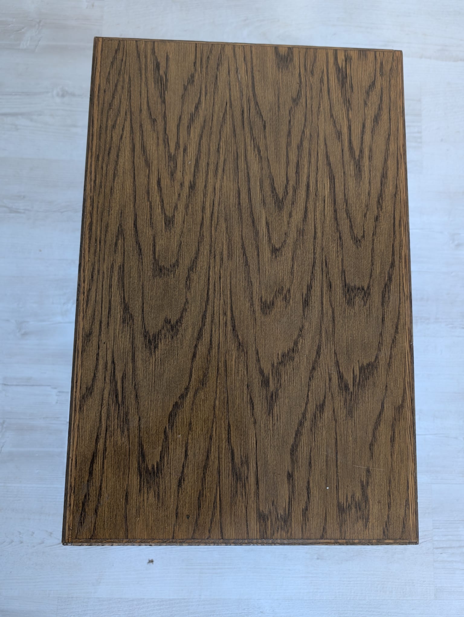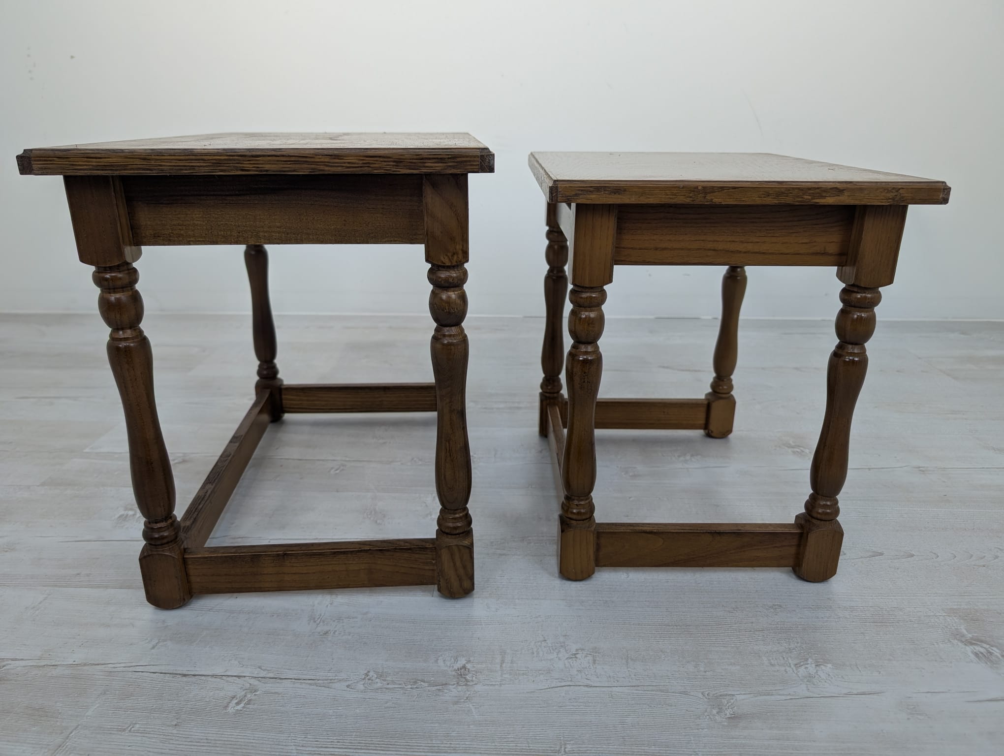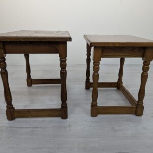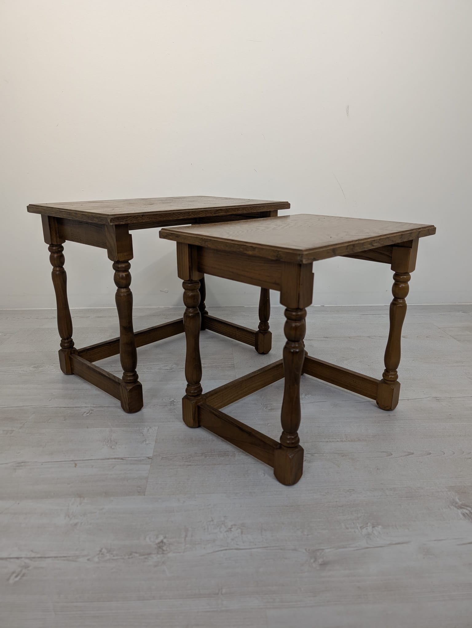 A set of two vintage style wooden coffee tables made of oak. The tables are in used condition but still look aesthetically pleasing. They can be an interesting decorative element in the living room or any other room.